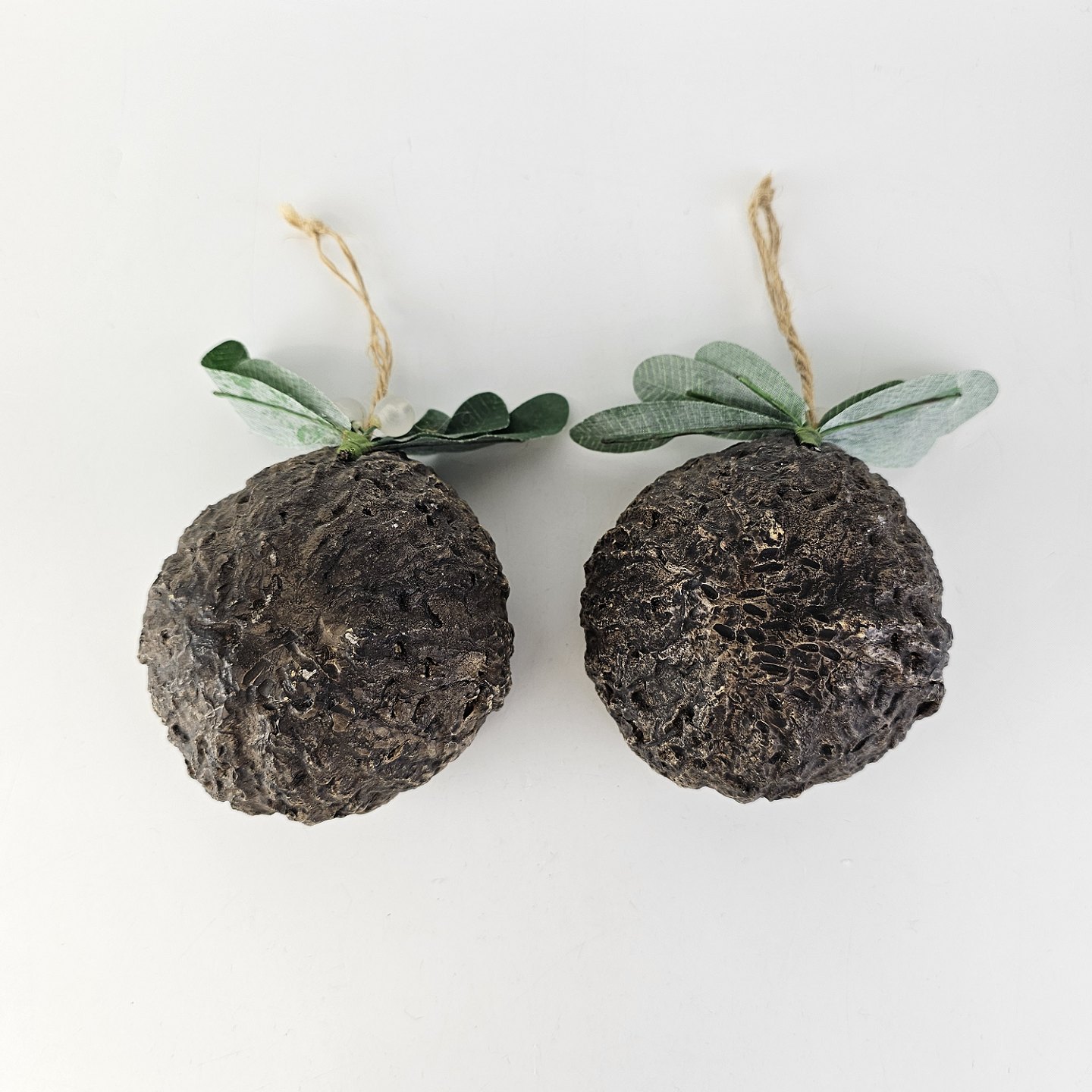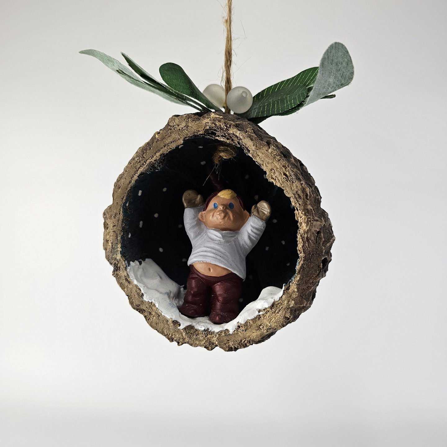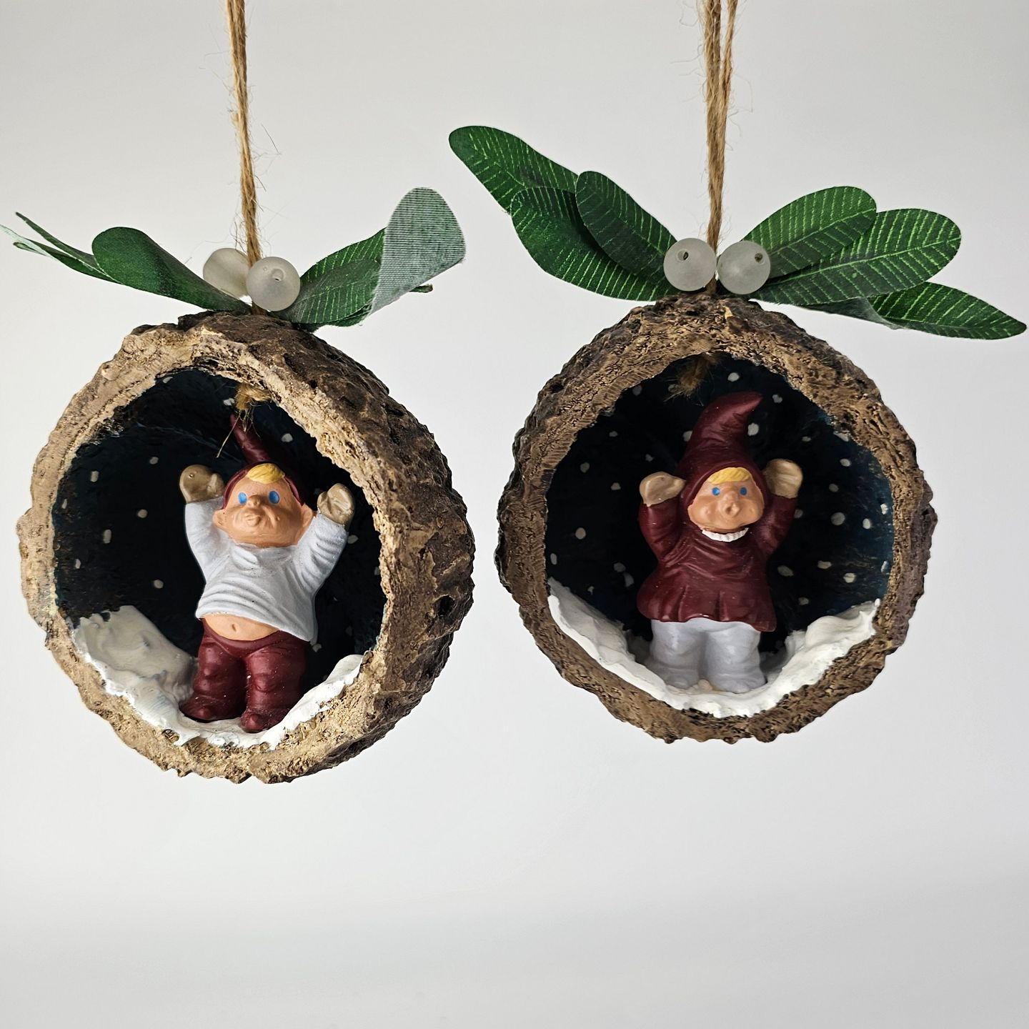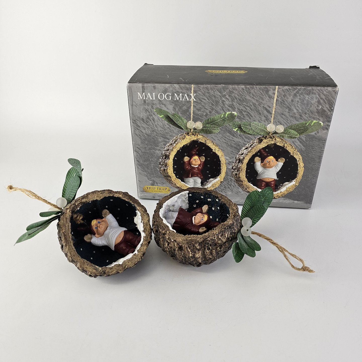 Beskrivelse: Figursæt til ophæng med motiv af nisserne Mai og Max i kokosnødder