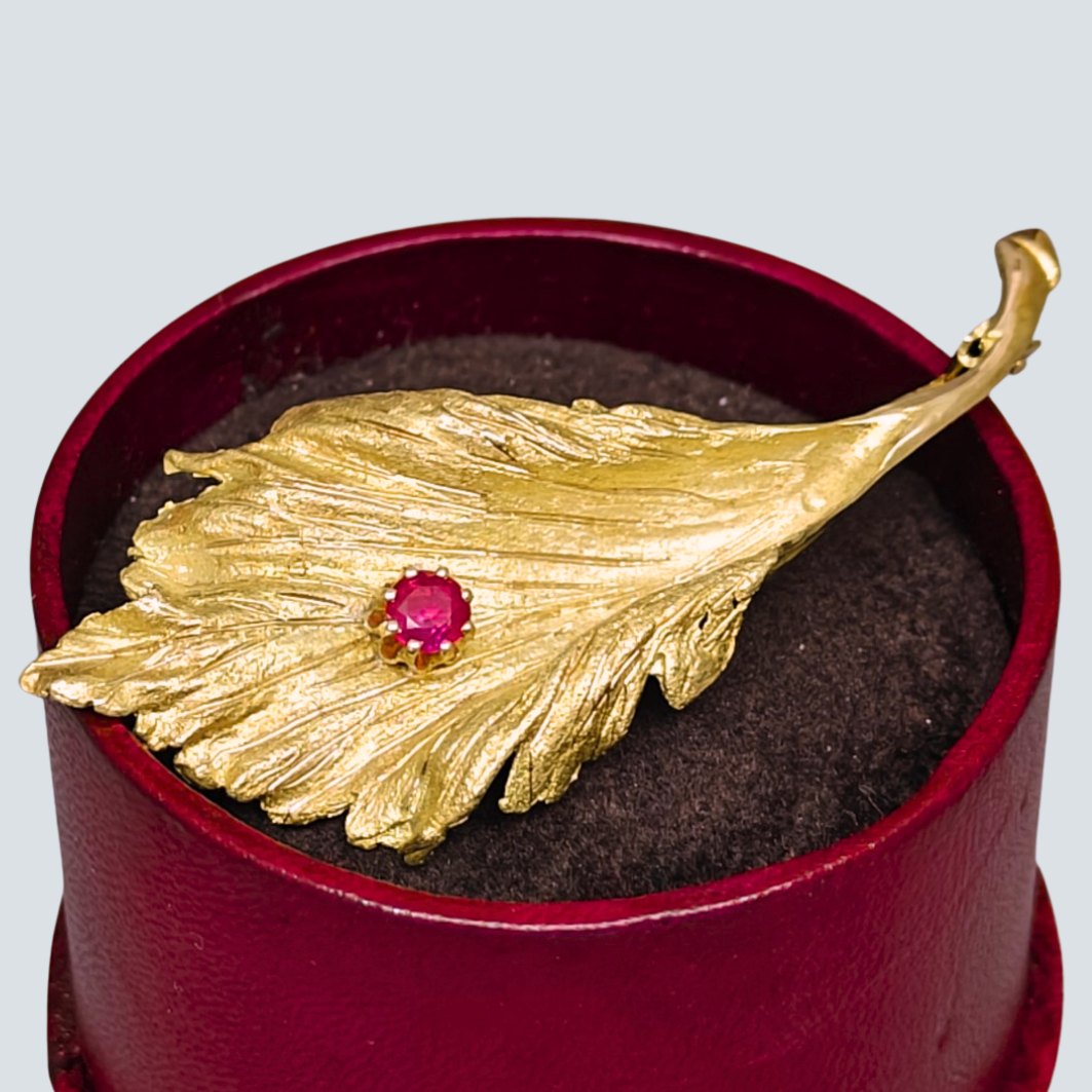 Beskrivelse: Bernhard Hertz; Broche udformet som et blad. I 14 kt. guld med rubin