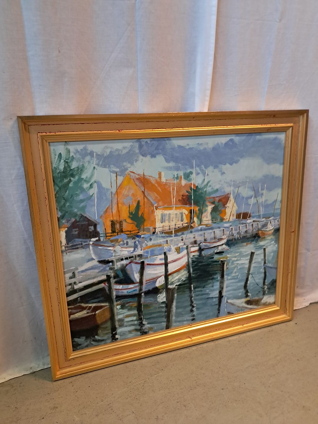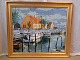 Beskrivelse: Maleri af Dragør Havn i guldmalet ramme, af : Mogens Amdi Thorsen (1924-2016)