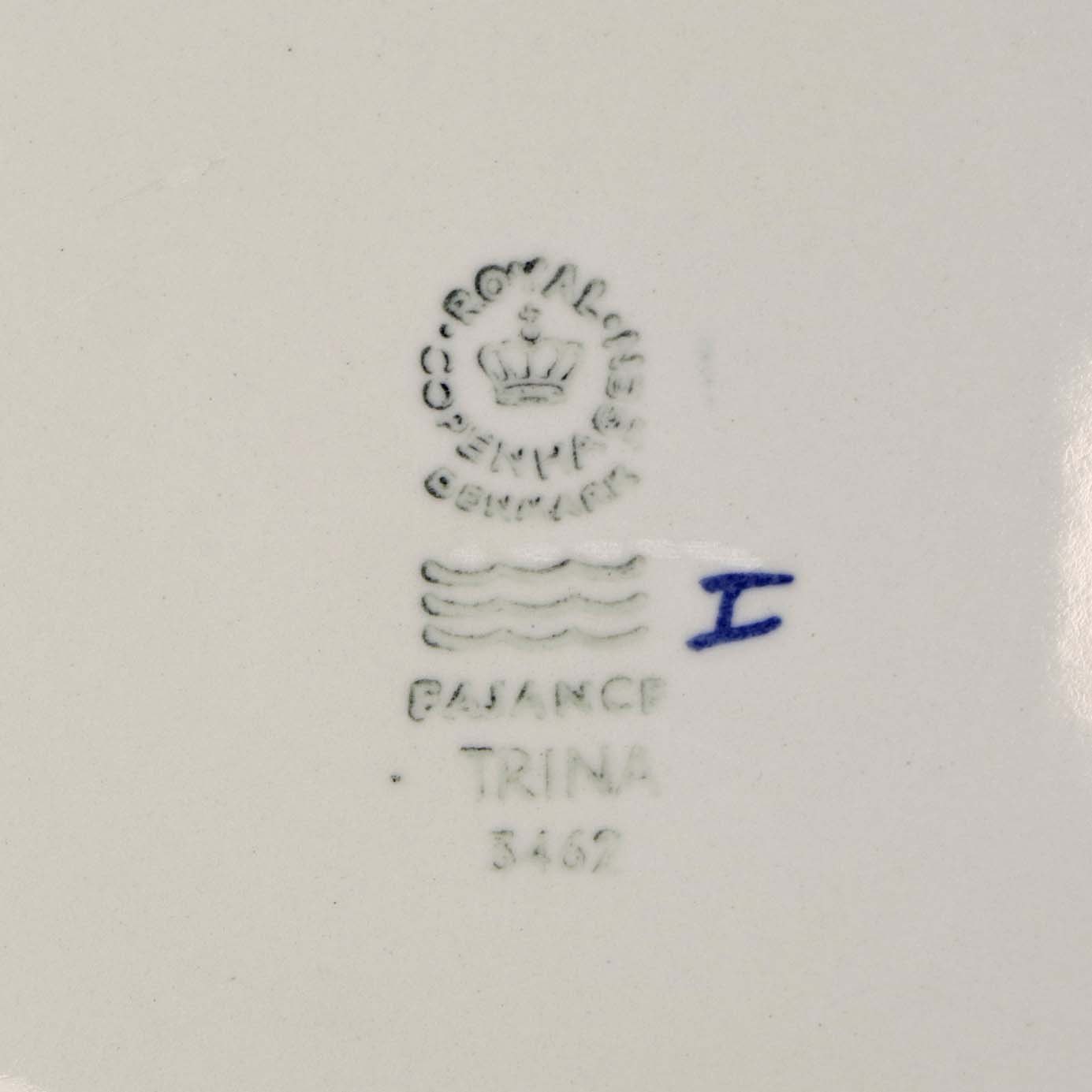Beskrivelse: Middagstallerken i kongelig fajance fra stellet Grøn Trina. Nr. 3462
