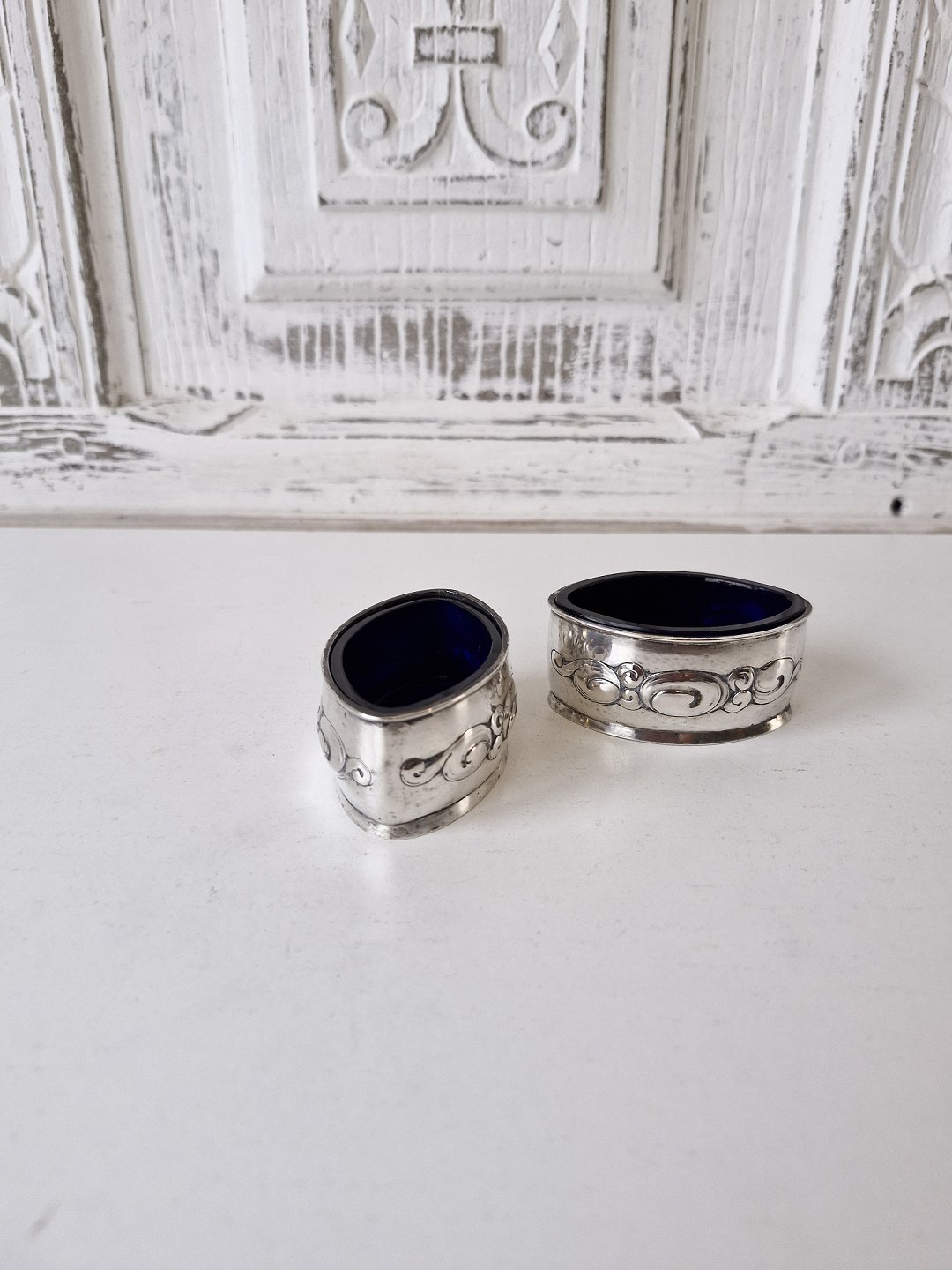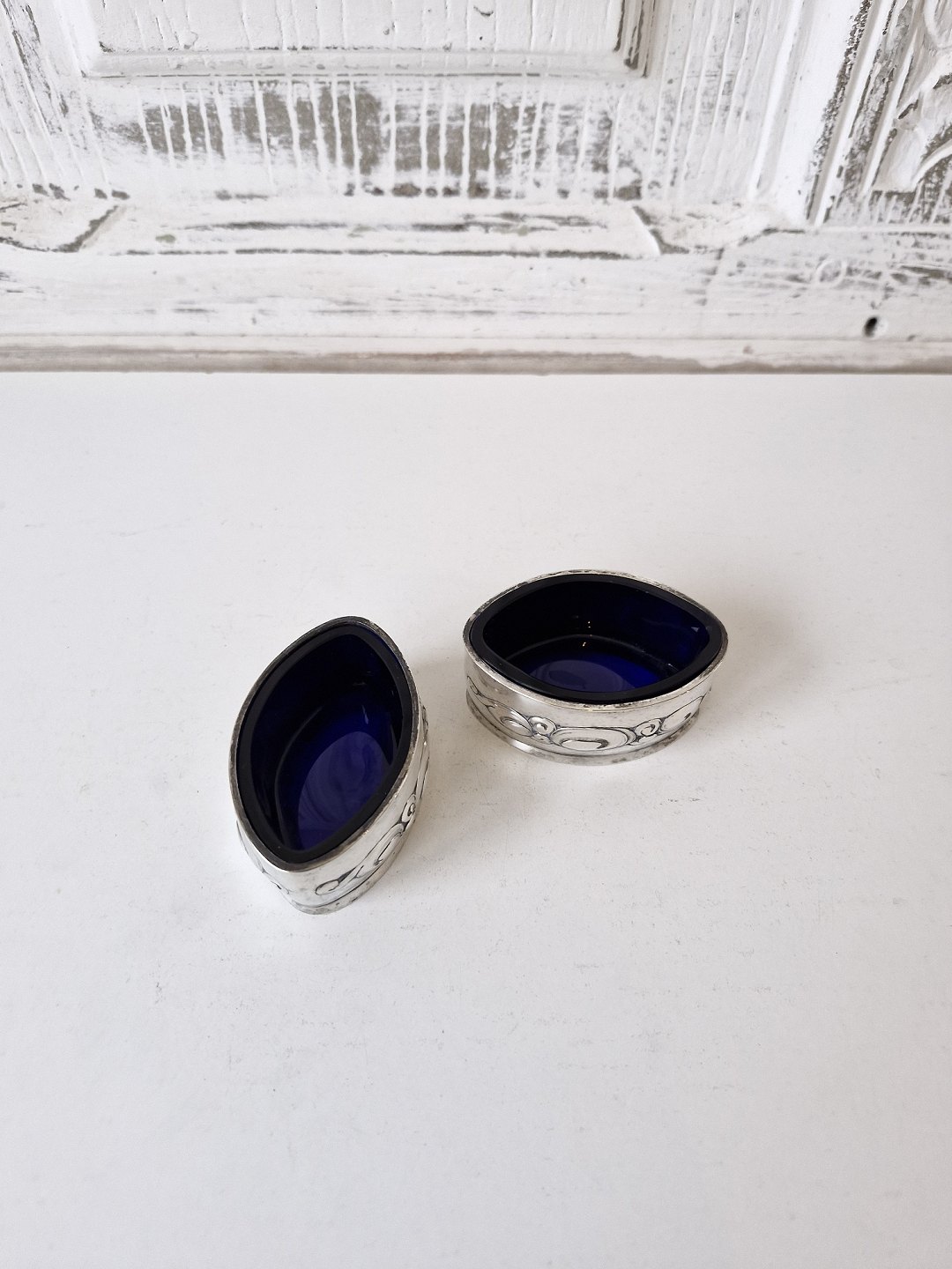 Beskrivelse: Par ovale saltkar i sølv med dekoration i skønvirkestil med indsatser i blåt glas.