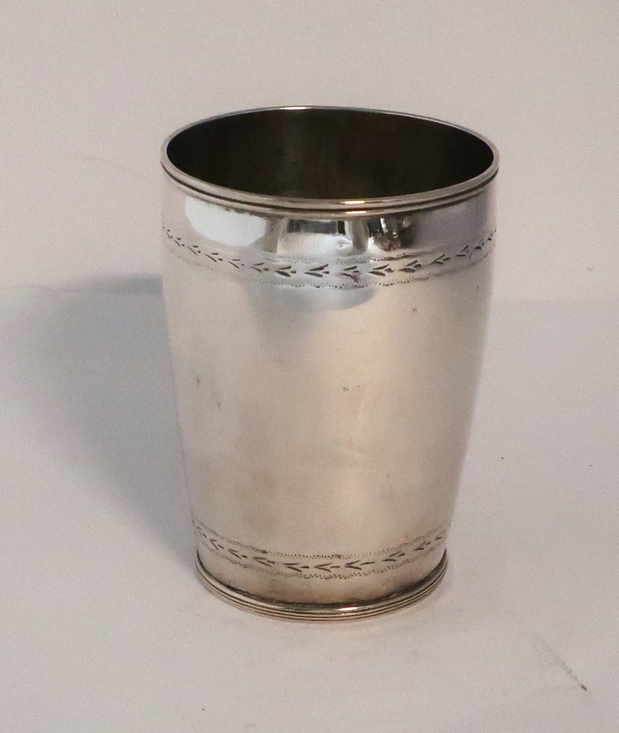 Beskrivelse: Jørgen Mønster, København. Sølv bæger. Højde 9 cm. Diameter 6,5 cm. Produceret 1812.