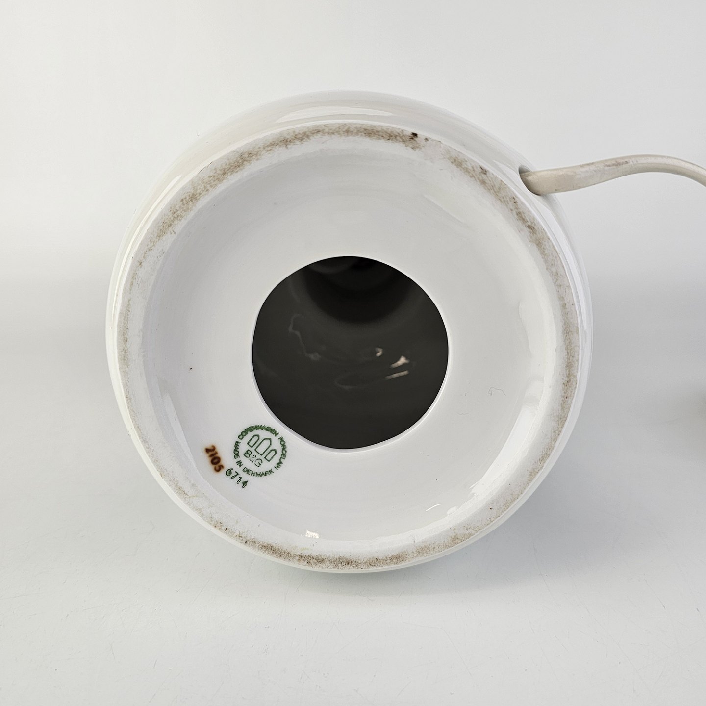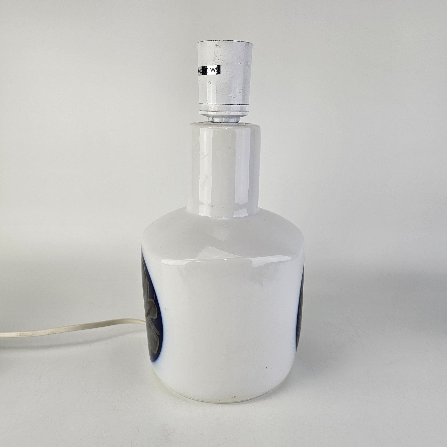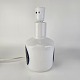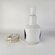 Beskrivelse: Bordlampe i hvidt porcelæn med abstrakt dekoration i blå og grå