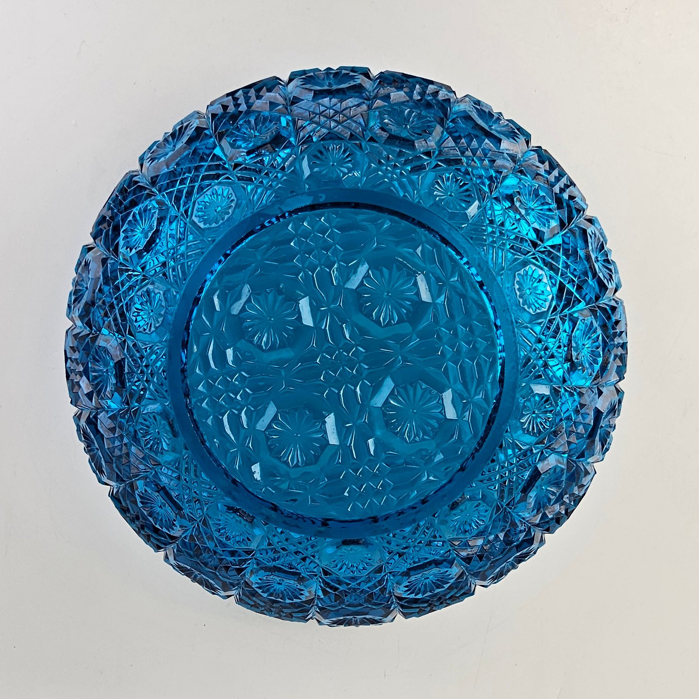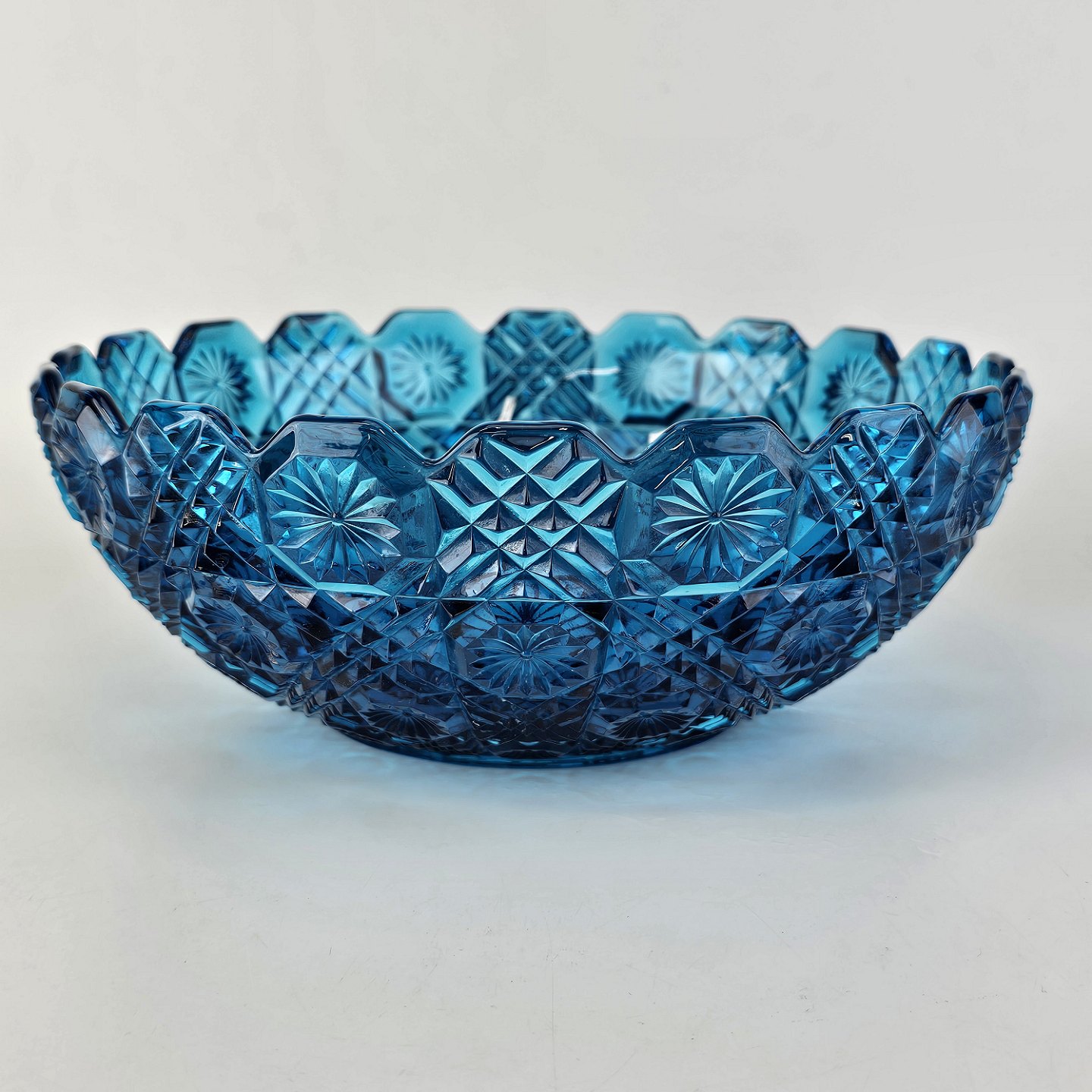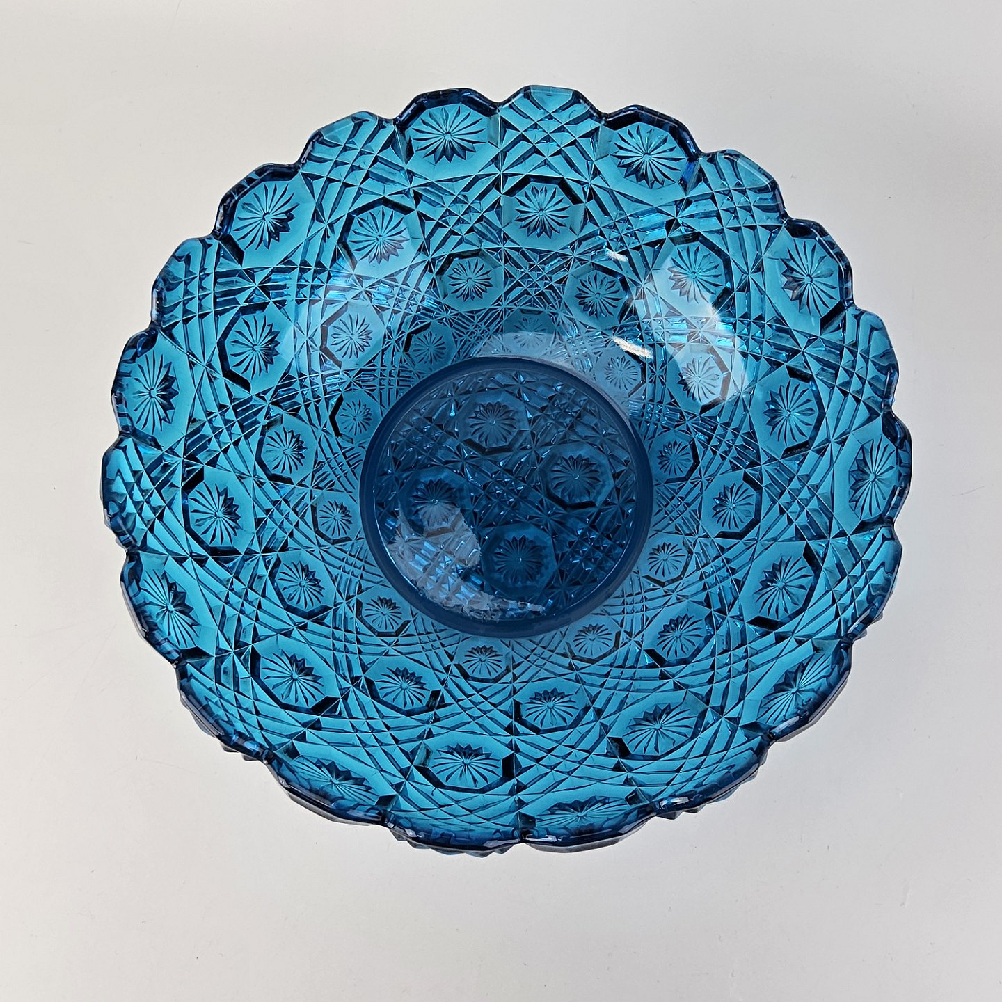 Beskrivelse: Blå diamantskål i presset glas med efterligning af skærslibning