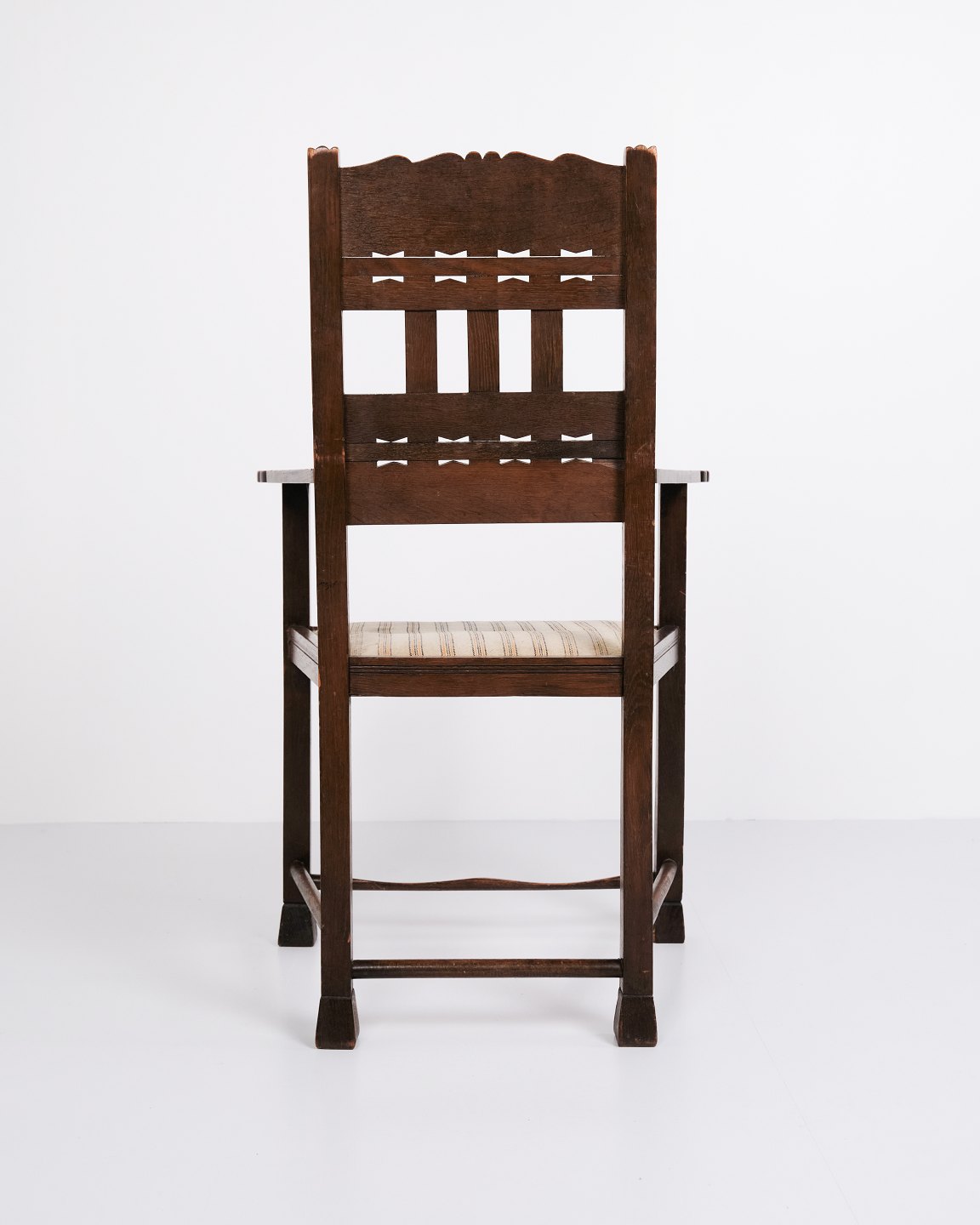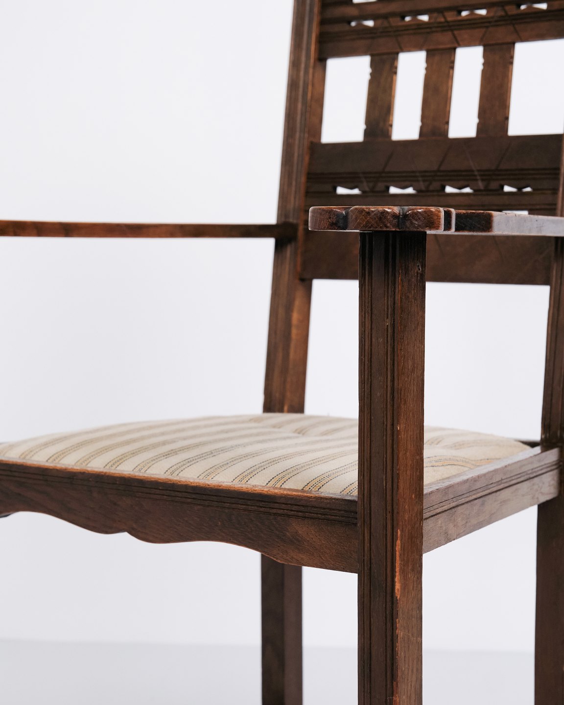 Beskrivelse: Antik armstol i egetræ fra 1930’erne med stribet polstring.