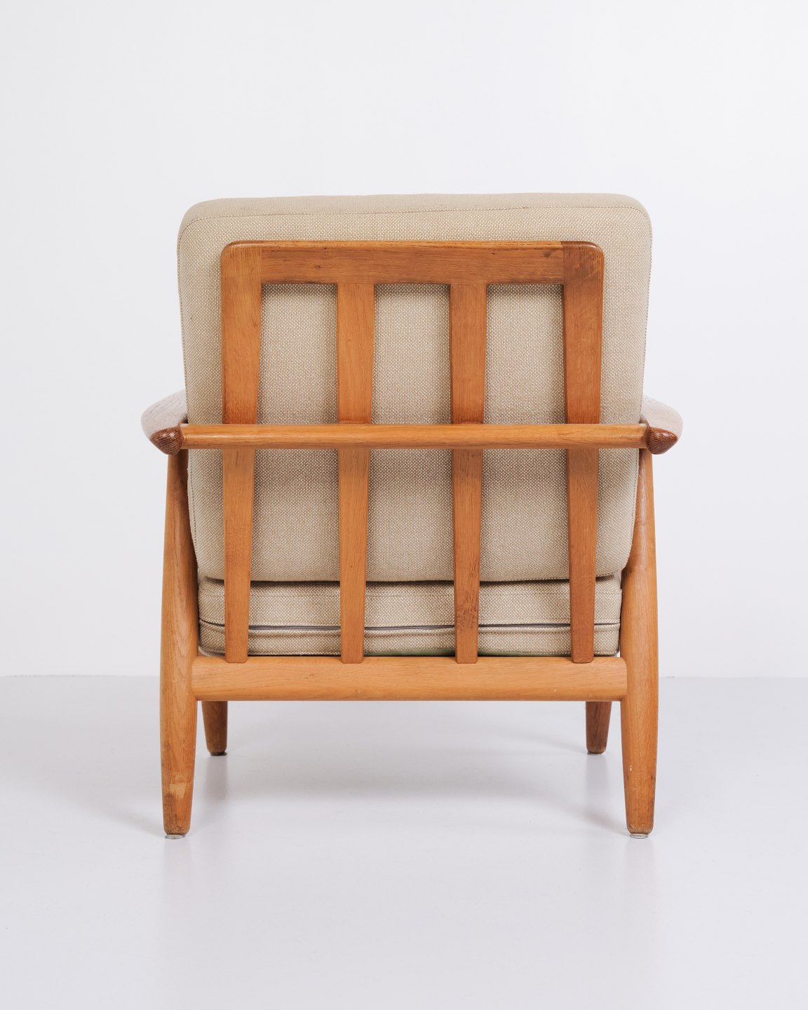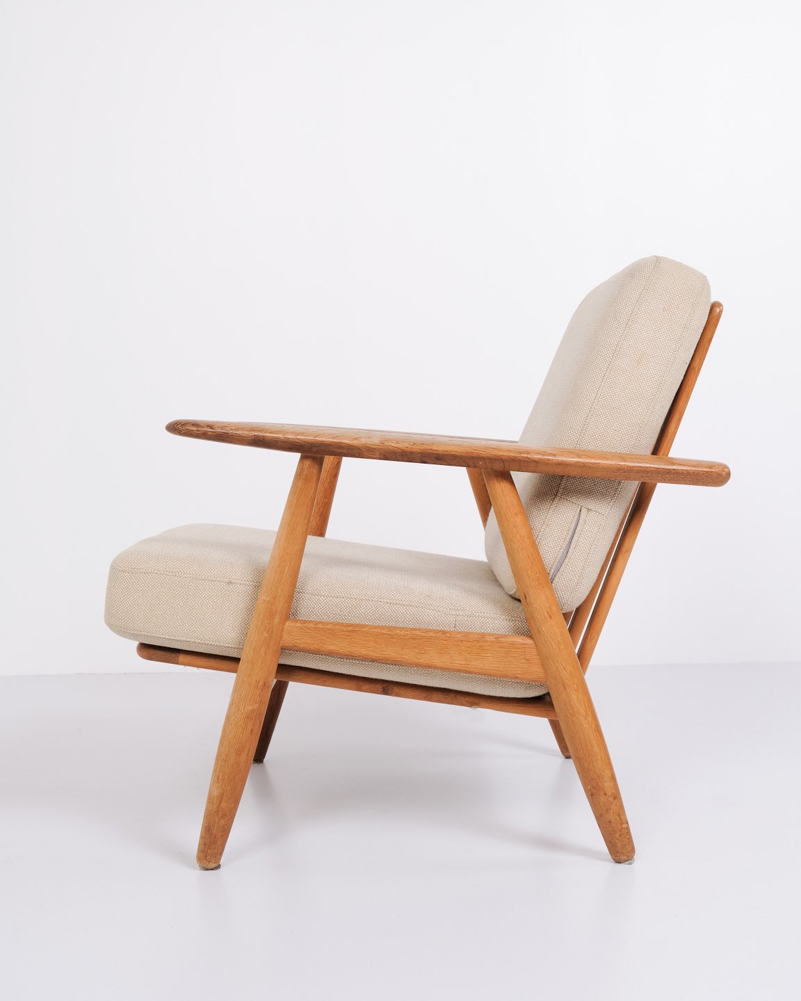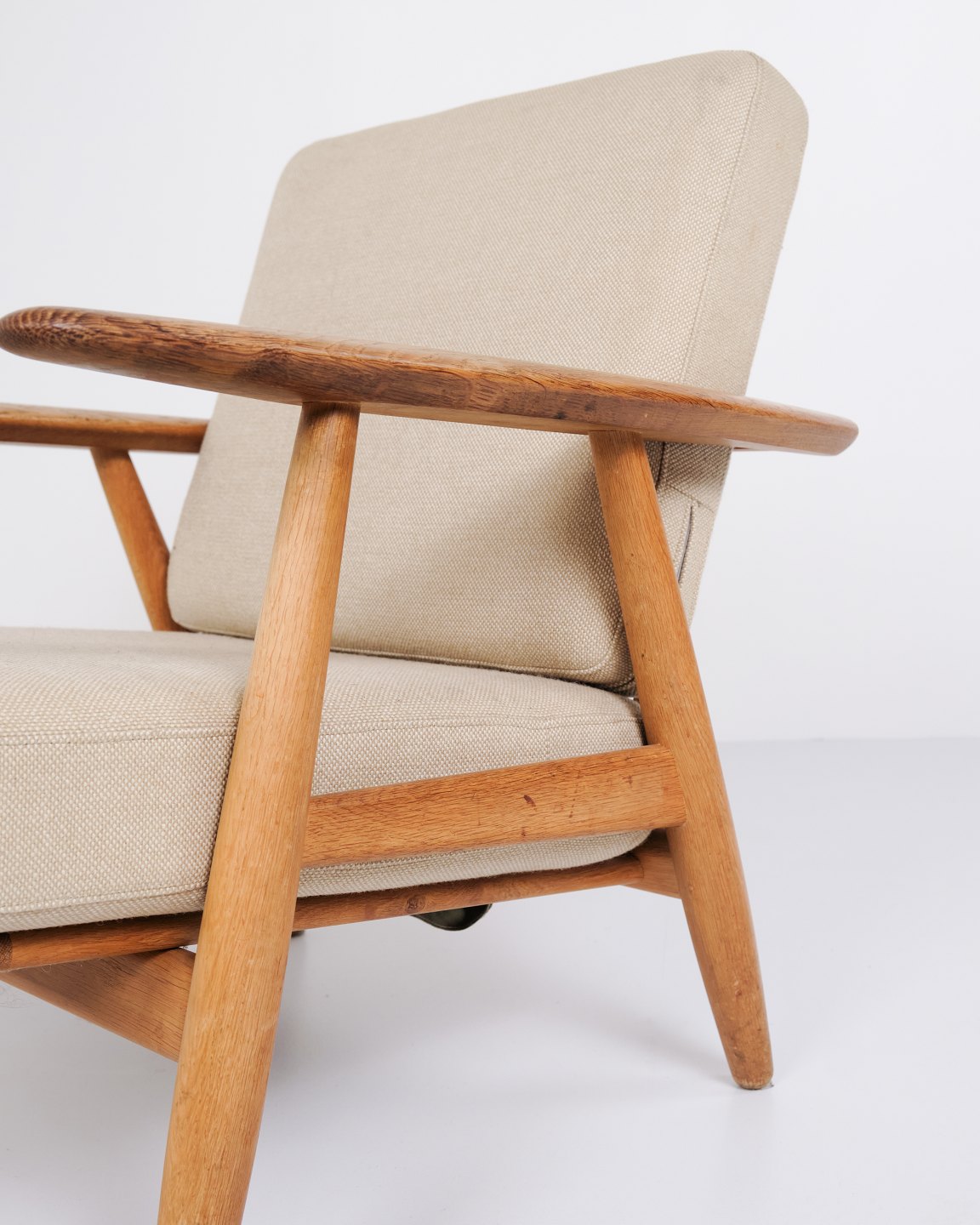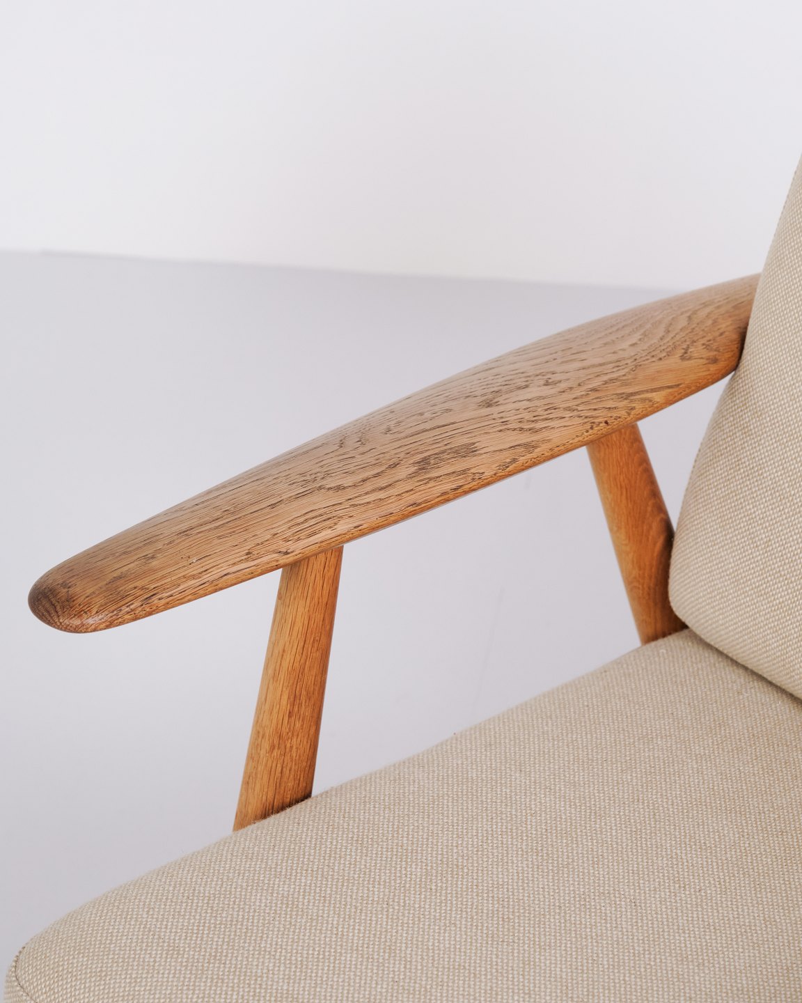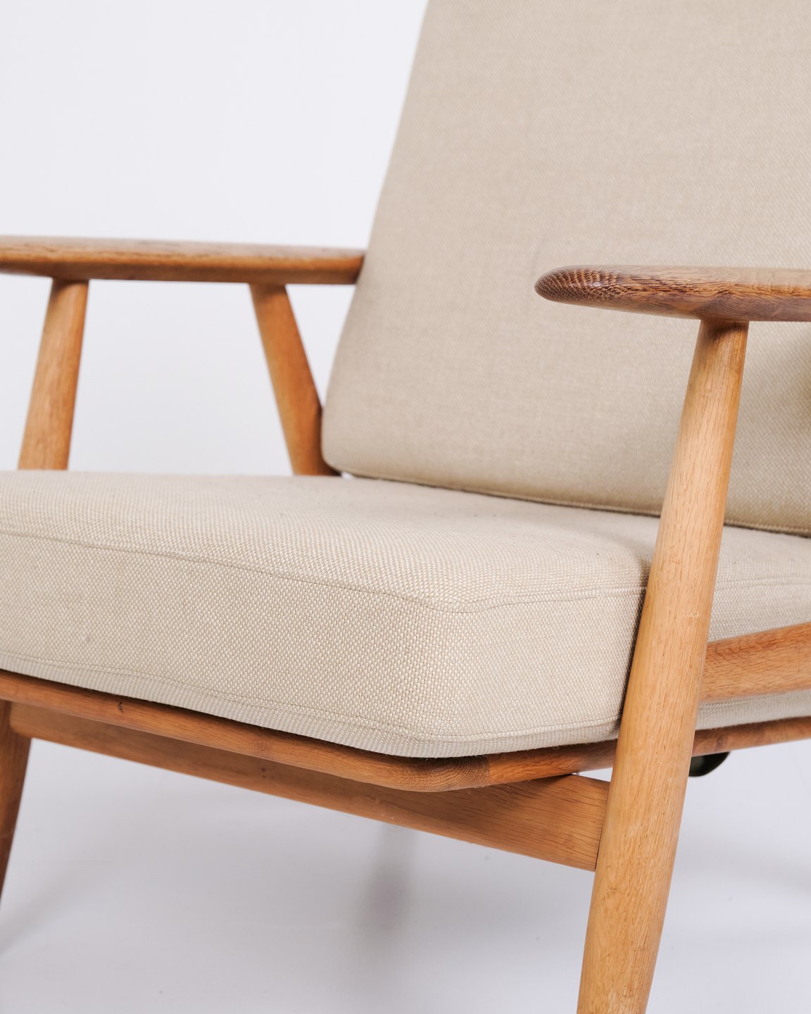 Beskrivelse: Sæt af to originale “Cigar” lænestole, model GE 240, designet af Hans J. Wegner og fremstillet af Getama i 1960’erne. Stolene er udført i massiv eg med polstring i lyst stof.