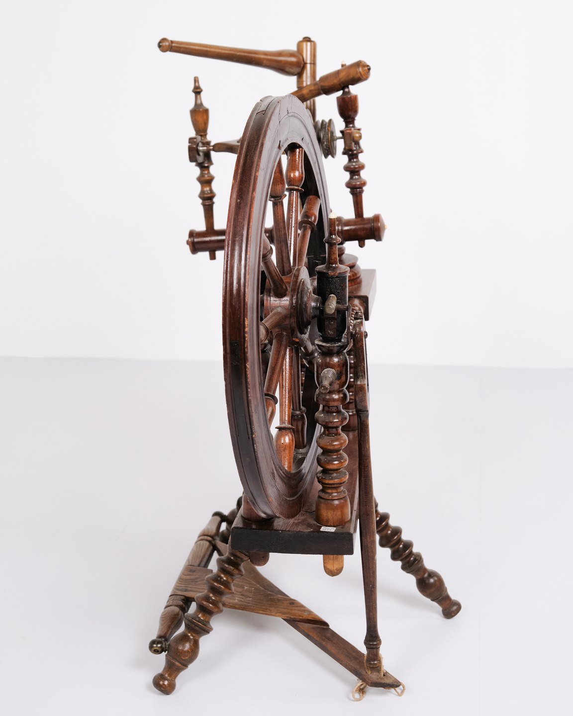 Beskrivelse: Antik spinderok fra 1880’erne i håndpoleret mørkt træ.