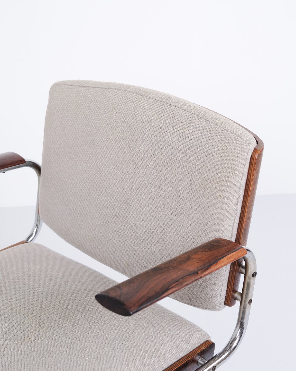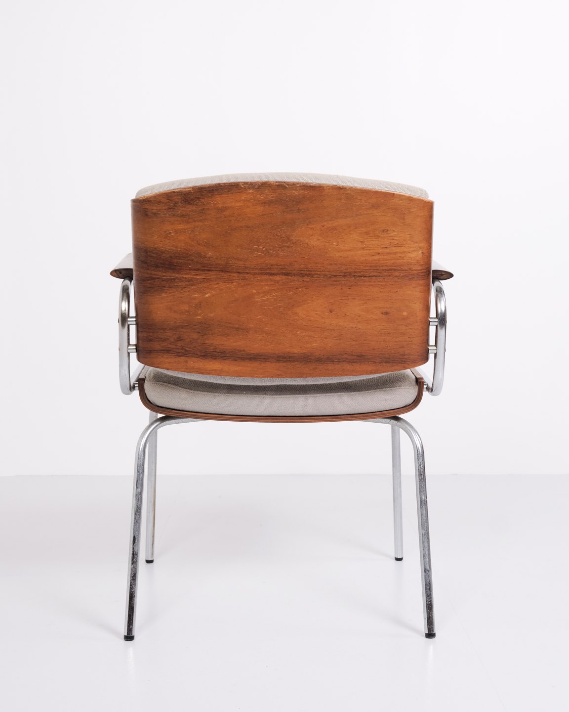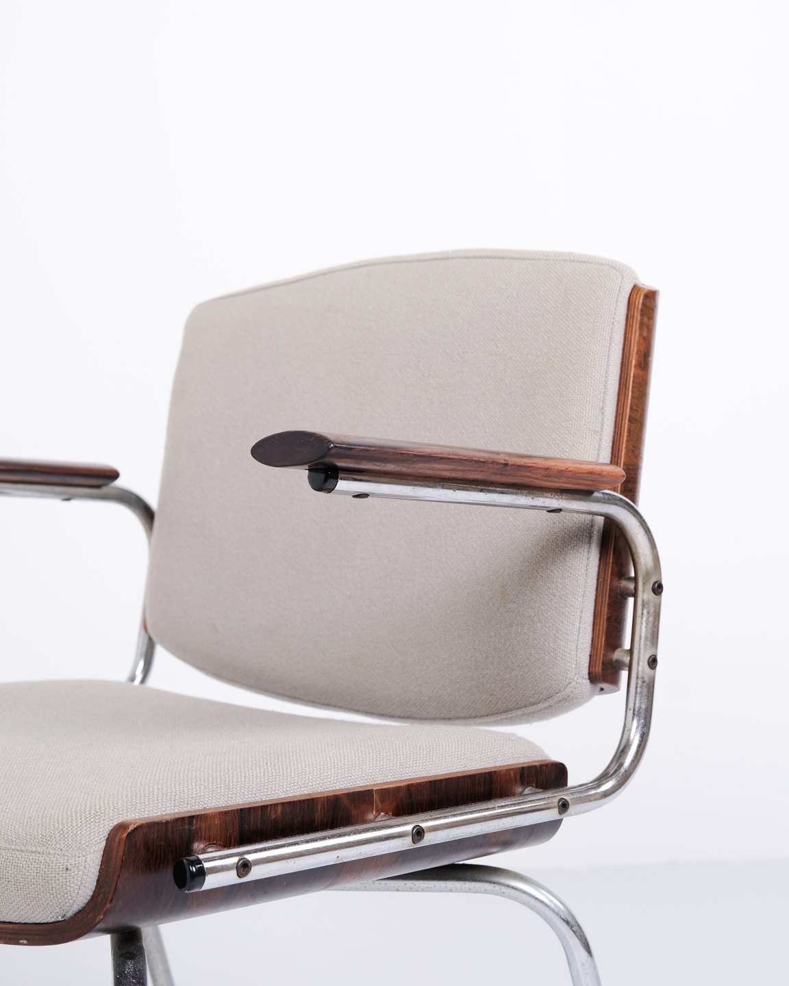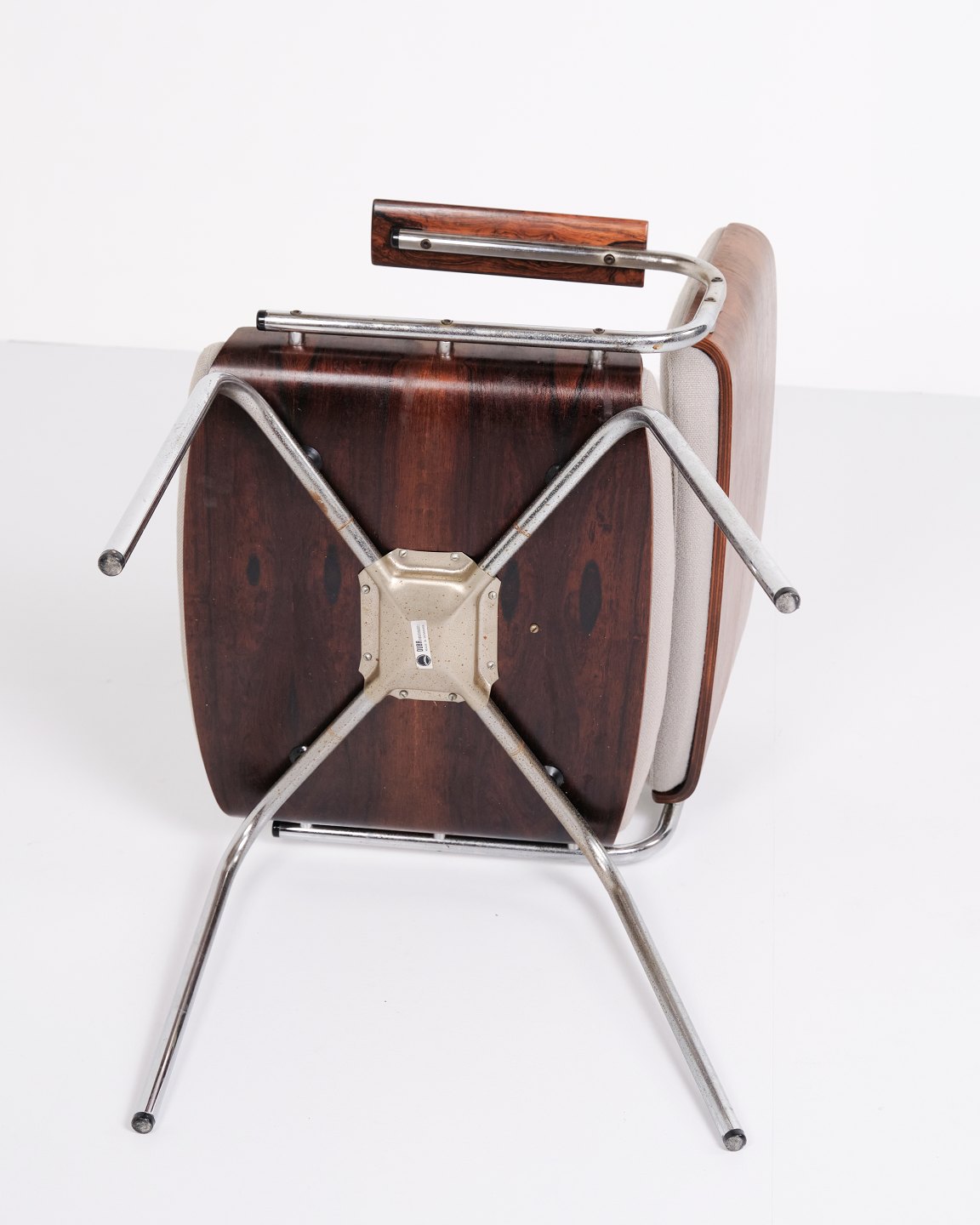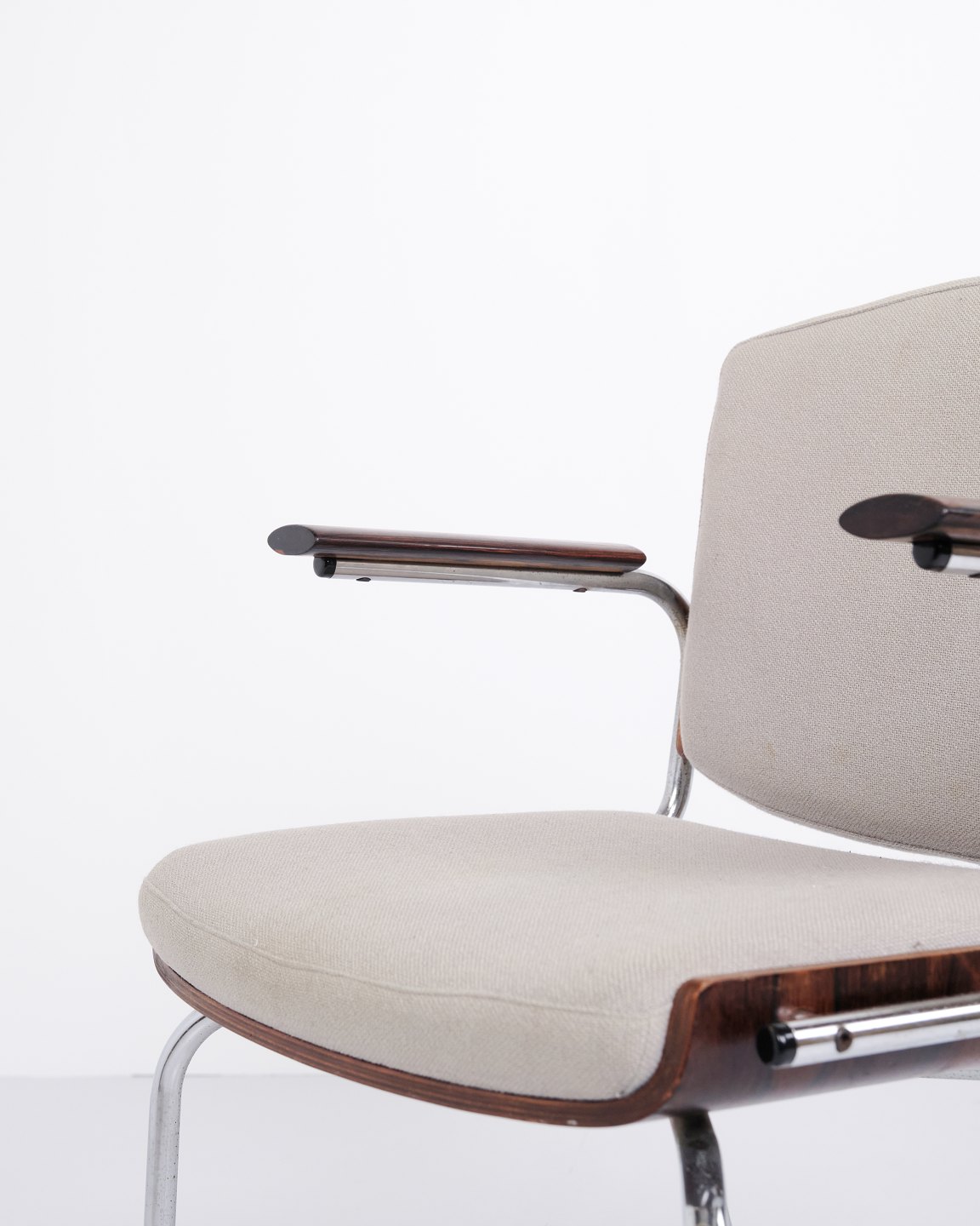Beskrivelse: Sæt af fire Duba konferencestole i palisander og lysegråt stof. Dansk design fra 1960’erne.