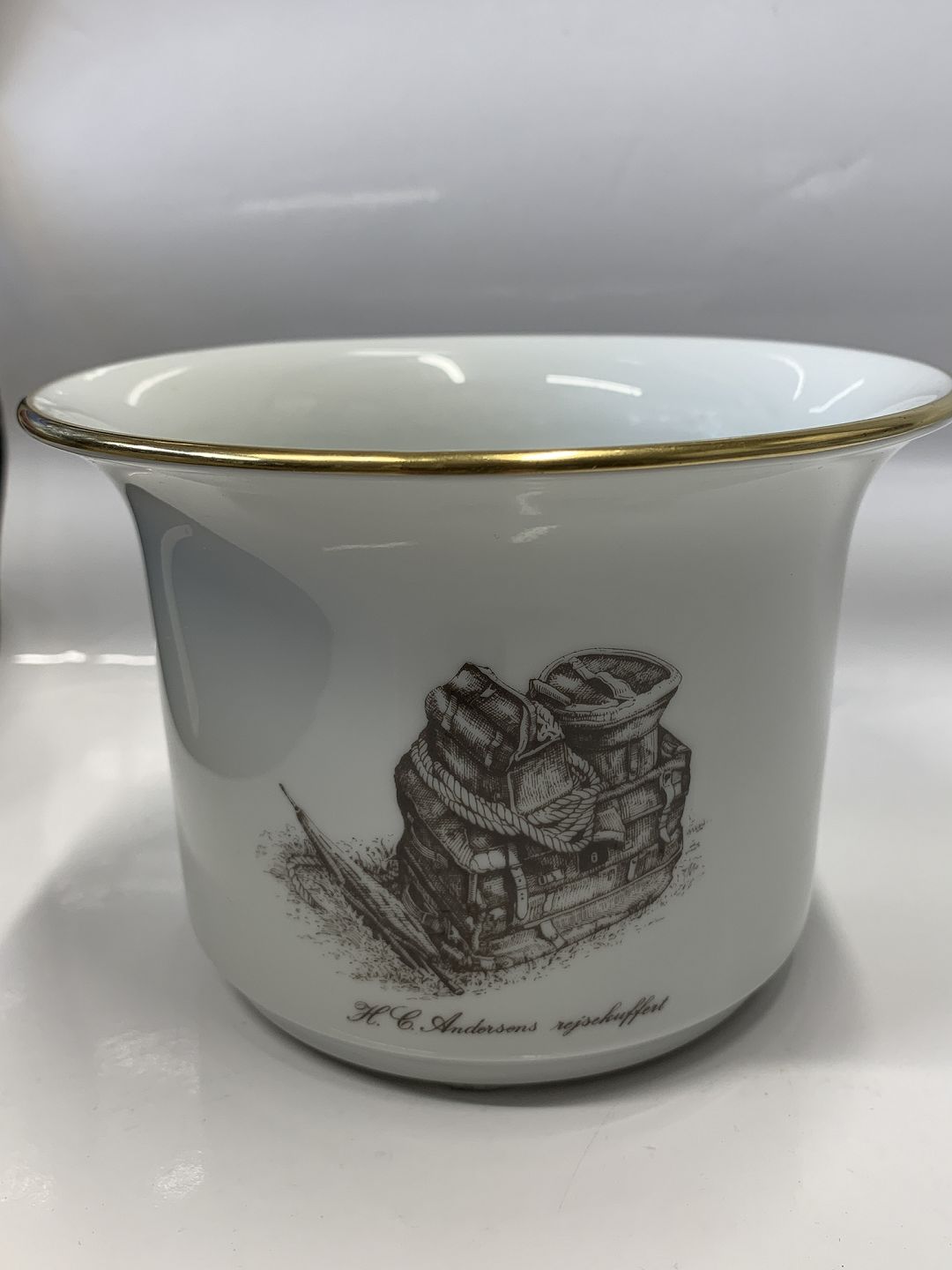 Beskrivelse: Bing & Grøndahl H.C. Andersen urtepotteskjuler med guldkant.