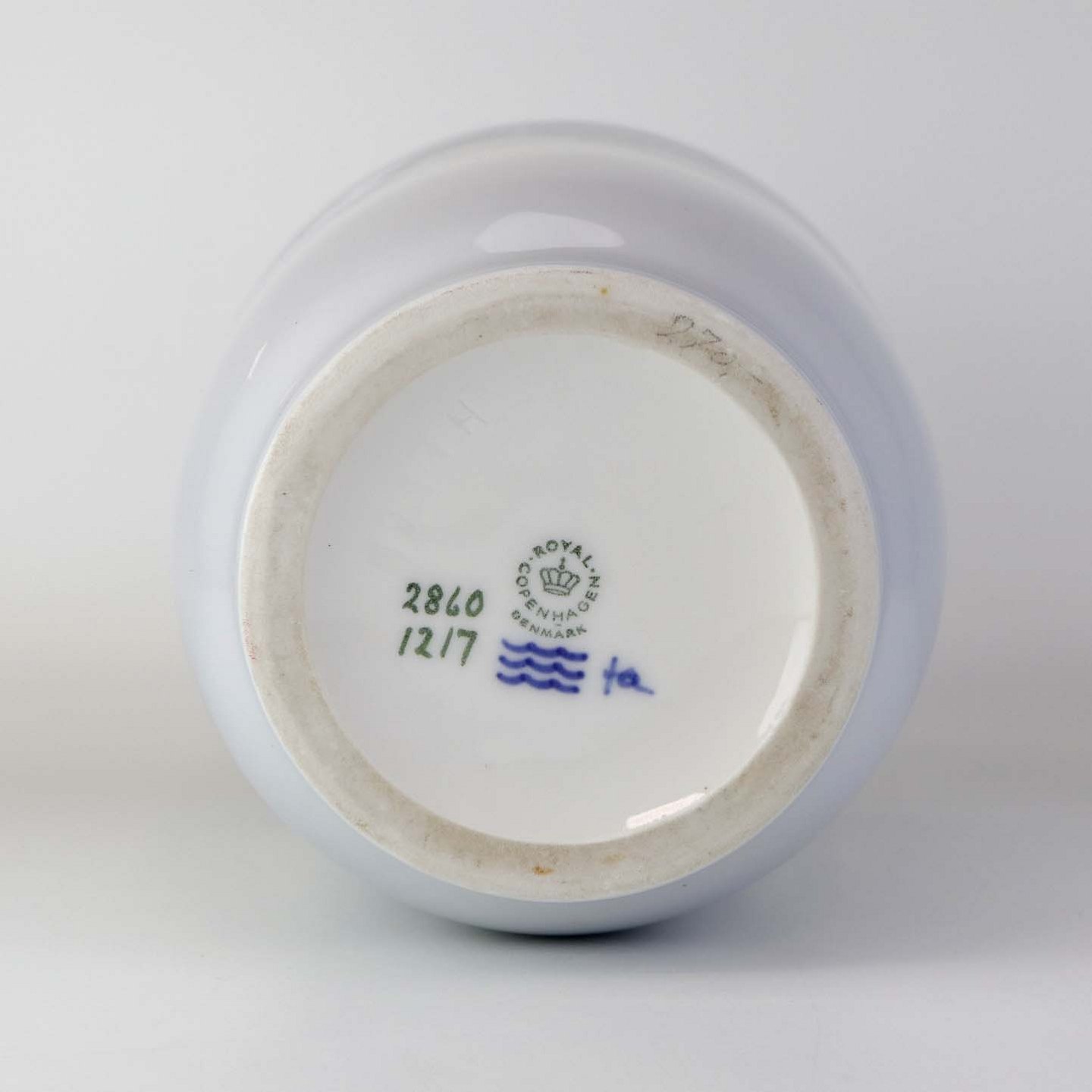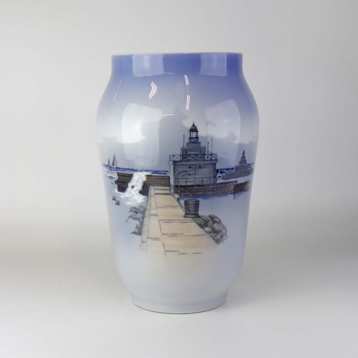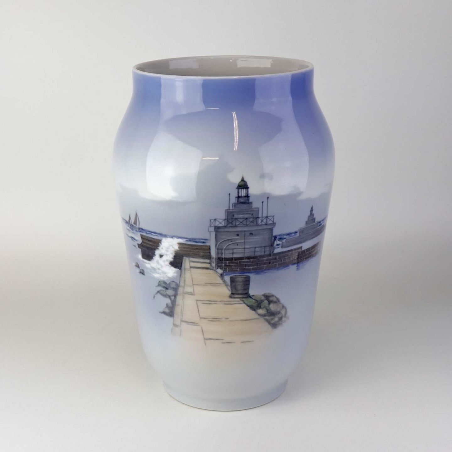 Beskrivelse: Vase i kongelig porcelæn med motiv af indsejlingen til Københavns havn. Nr. 2860/1217