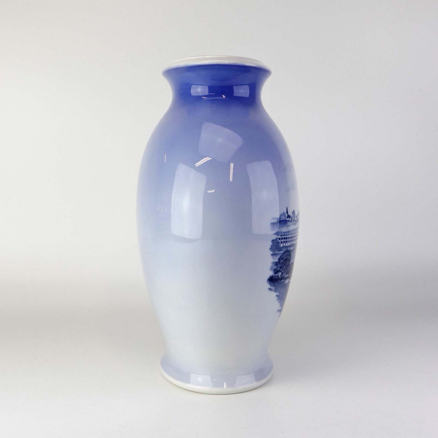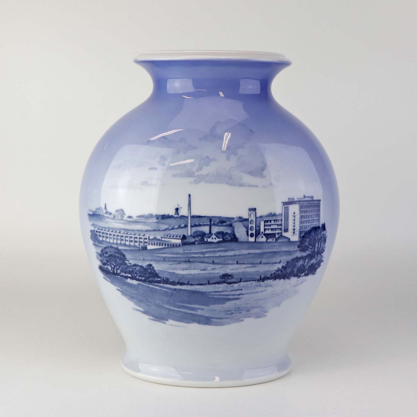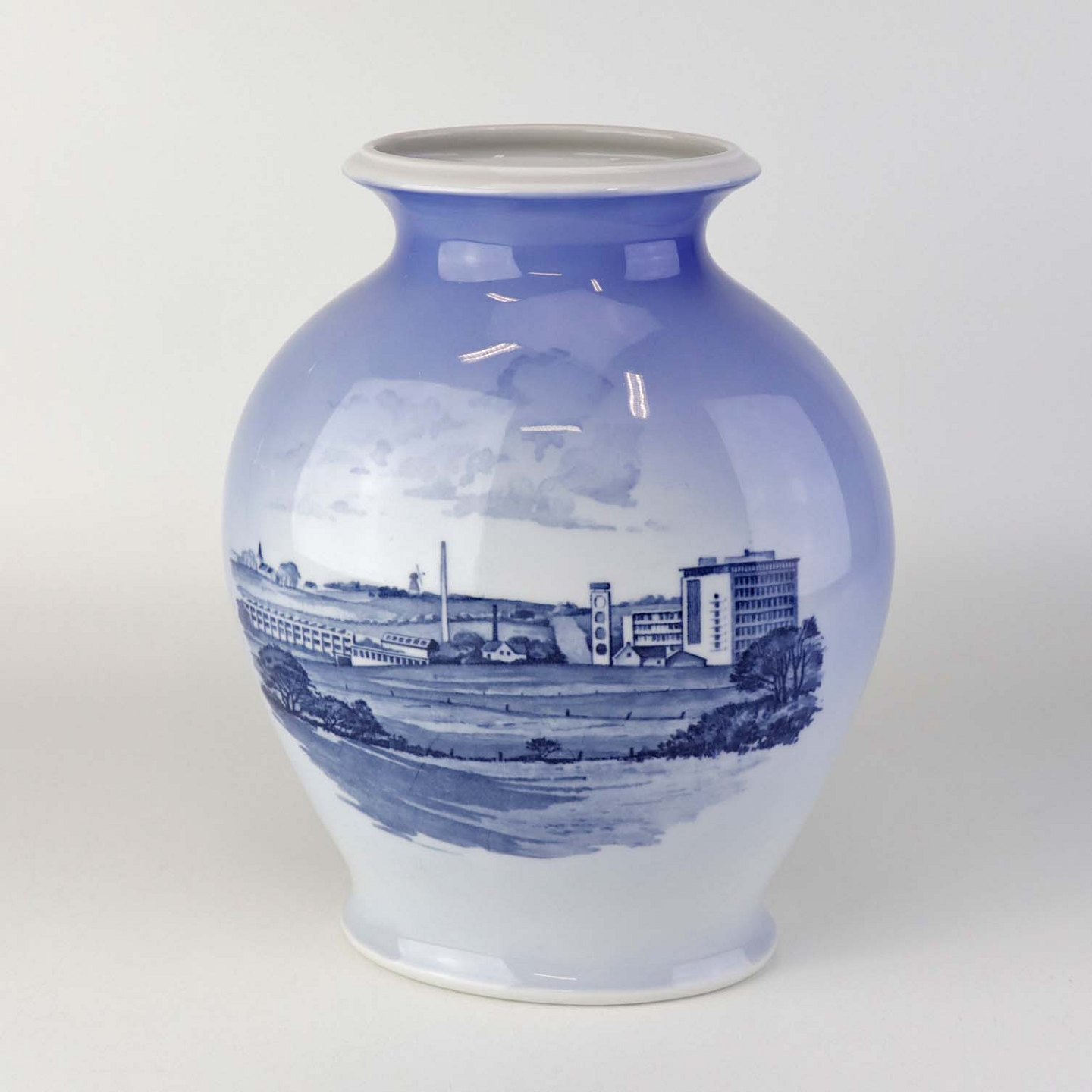 Beskrivelse: Oval jubilæumsvase i kongelig porcelæn med motiv af Danfoss fabriksbygninger. Nr. 3088