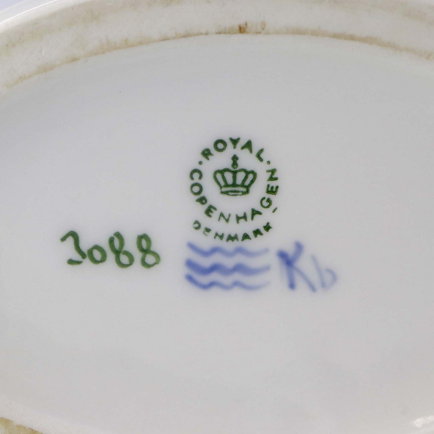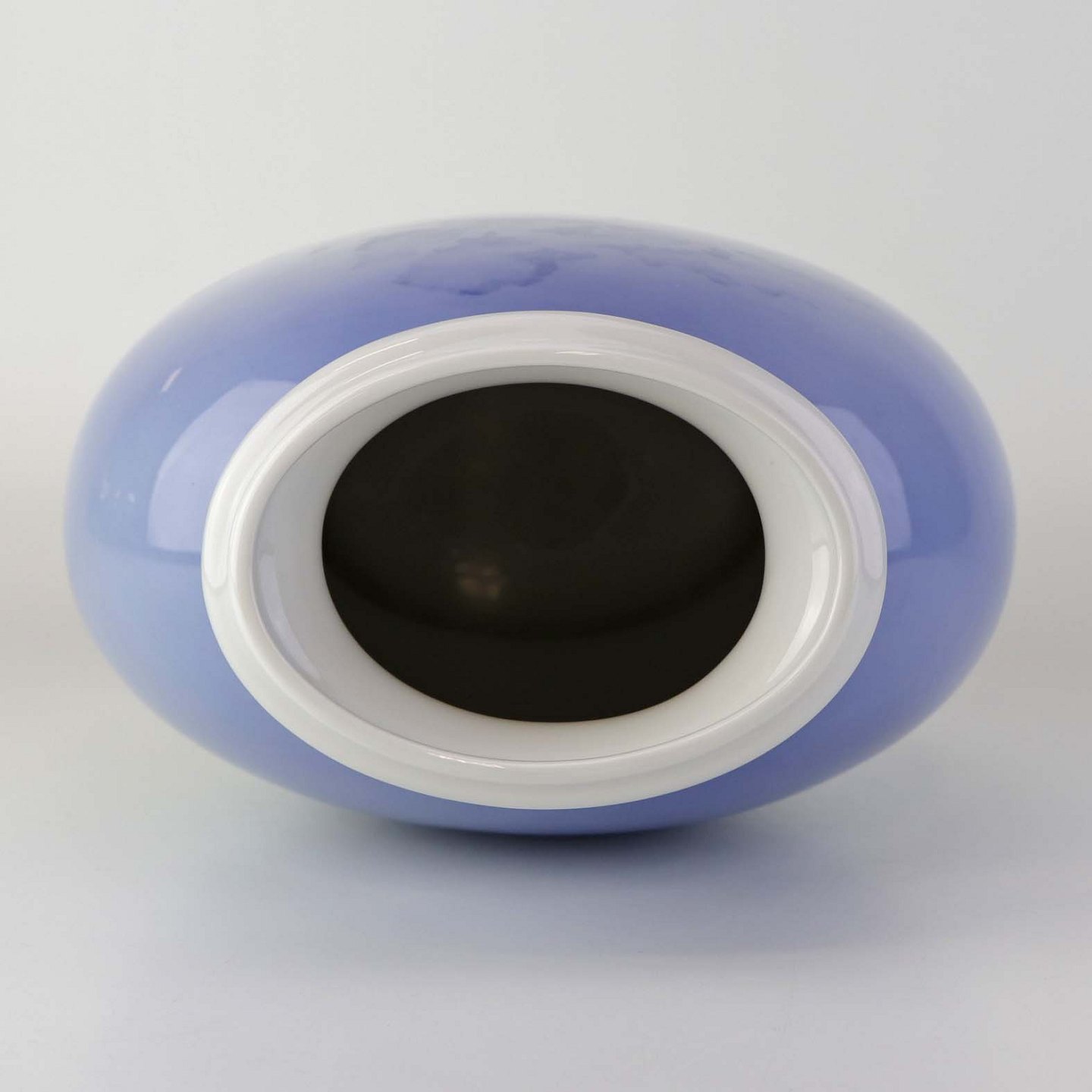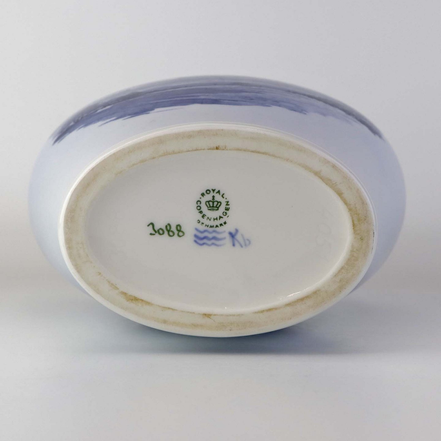 Beskrivelse: Oval jubilæumsvase i kongelig porcelæn med motiv af Danfoss fabriksbygninger. Nr. 3088