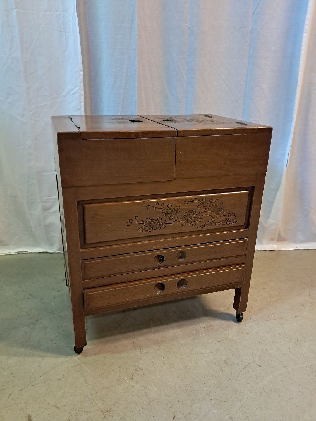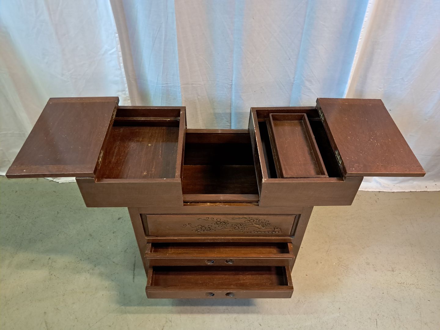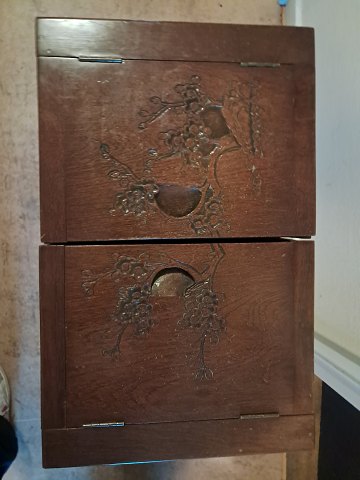 Beskrivelse: Asiatisk opbevaringsmøbel i fineret mahogni, fra 1980erne.