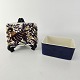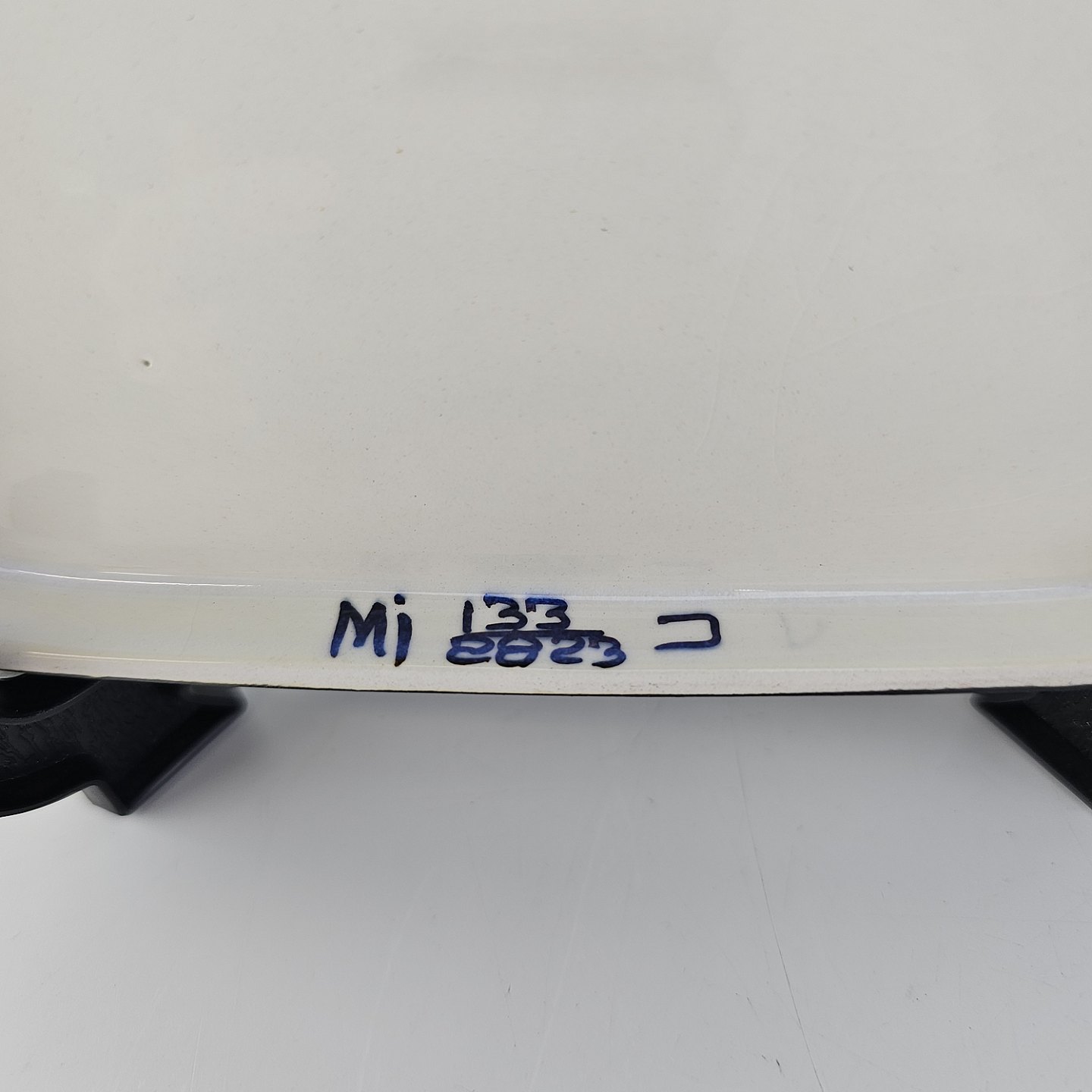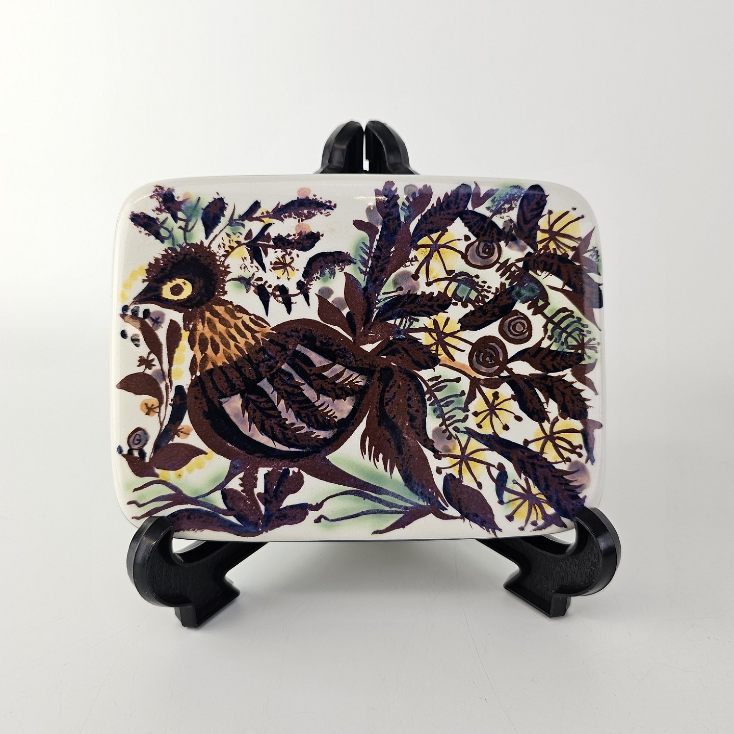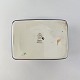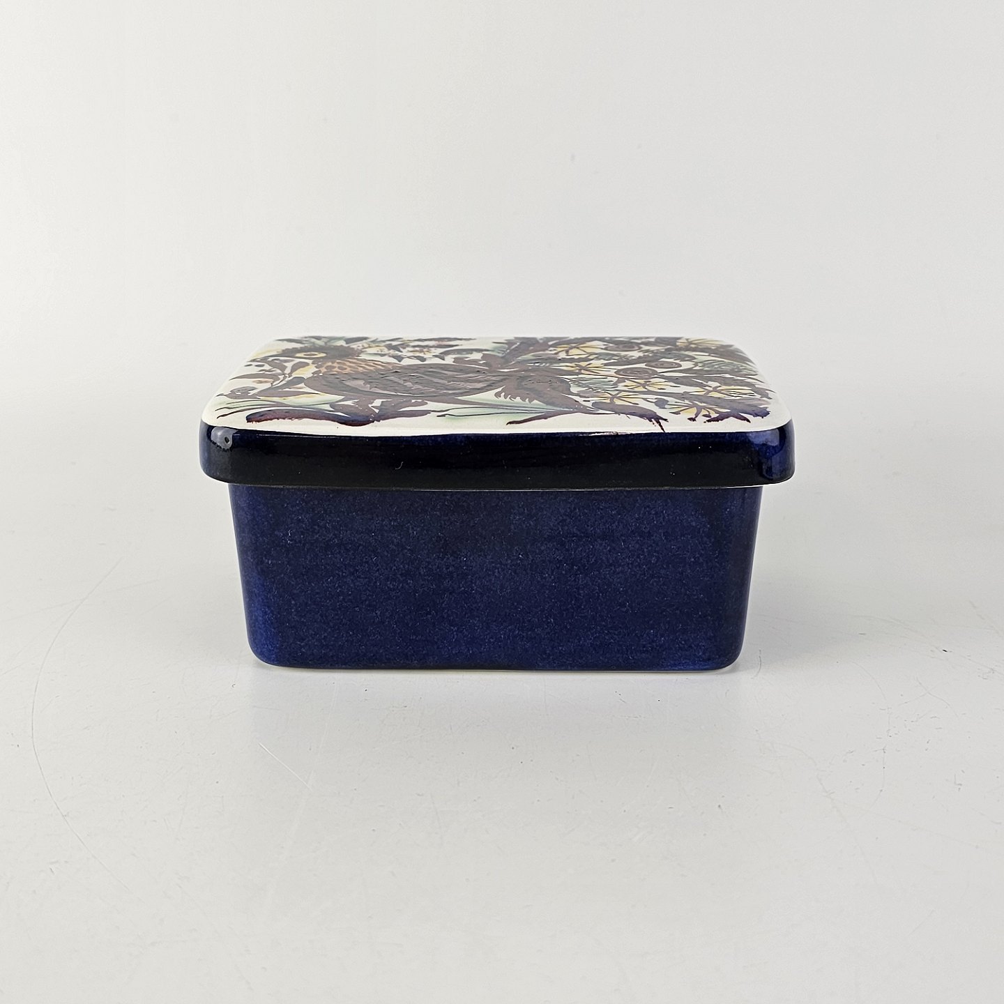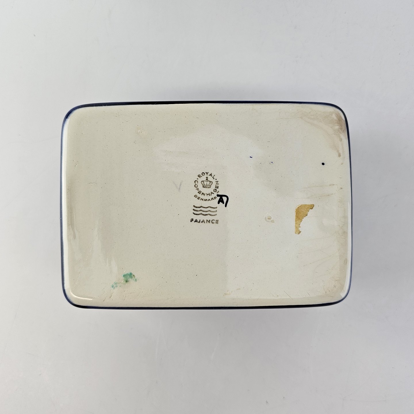 Beskrivelse: Smørboks fra serien Tenera. Boksen er i hvid fajance med blåmalet yderside og låget er dekoreret med motiv af en påfugl