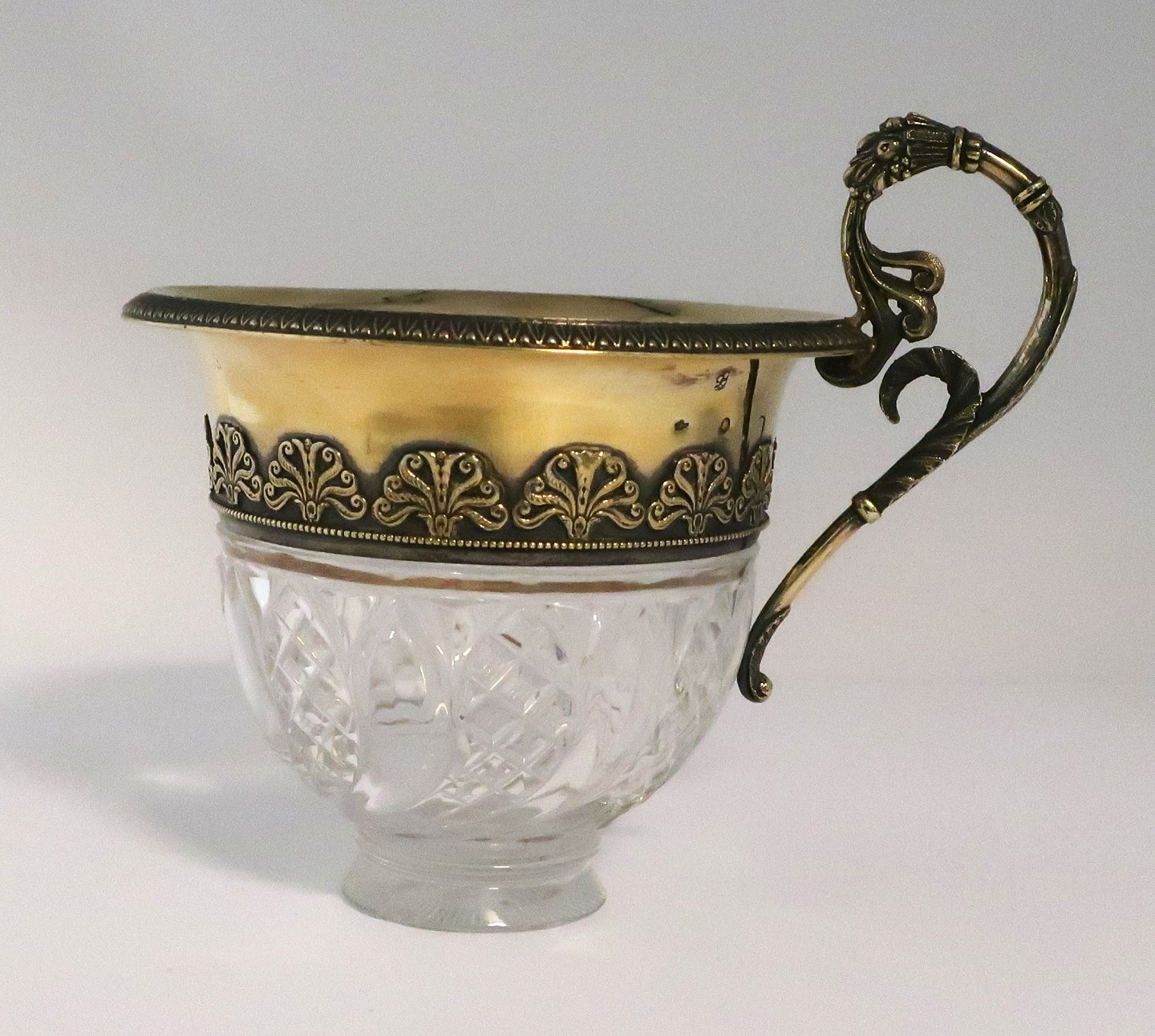 Fransk kop af krystal med sølv forgyldt montering. Kop og underkop. Højde 13 cm. Mindre kantafslag på undersiden af kop.