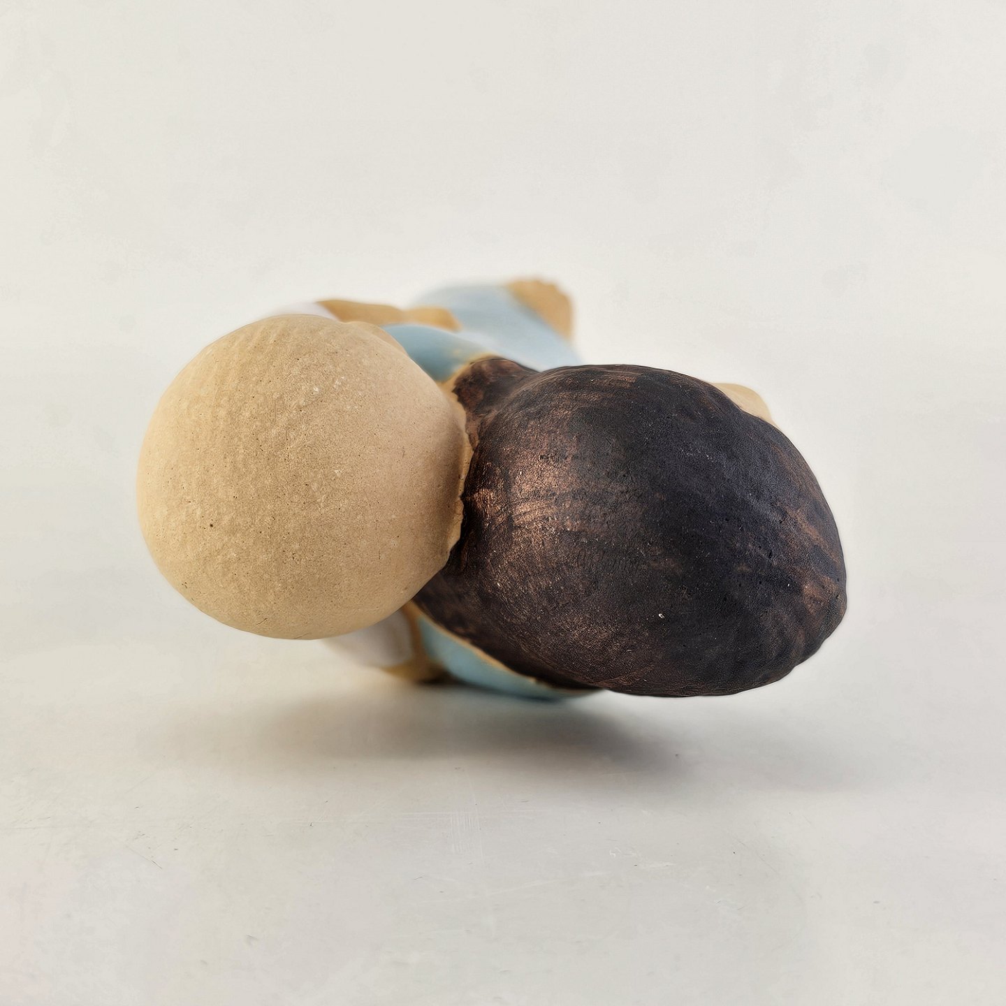 Beskrivelse: Figur i keramik med motiv af en pige med lys hud og brunt hår, som har et barn på ryggen.