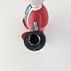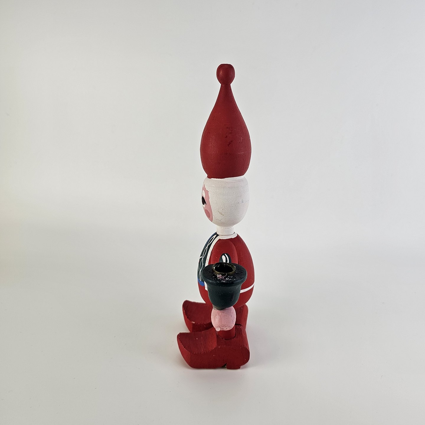 Beskrivelse: En håndmalet figur i træ med motiv af en nisse med en kerteholder