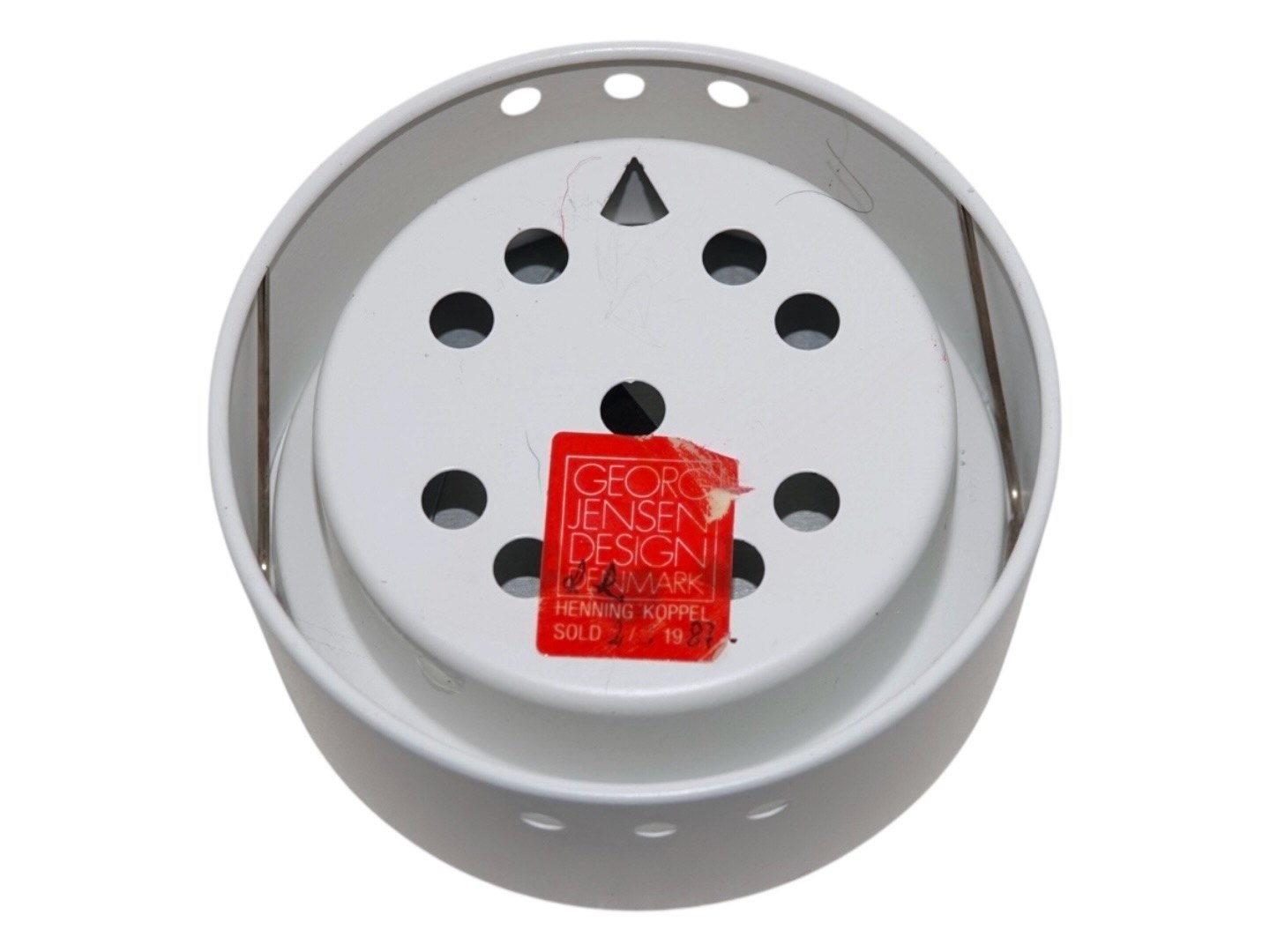 Description: Georg Jensen Themometer in white case with black background.