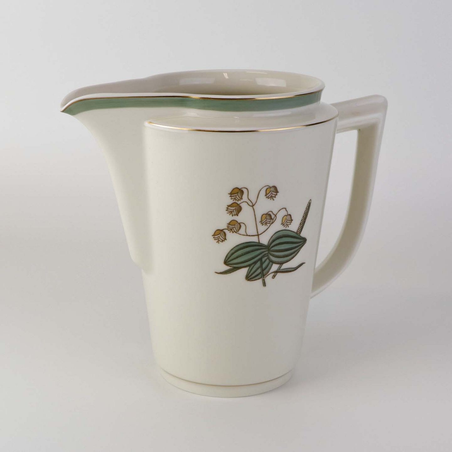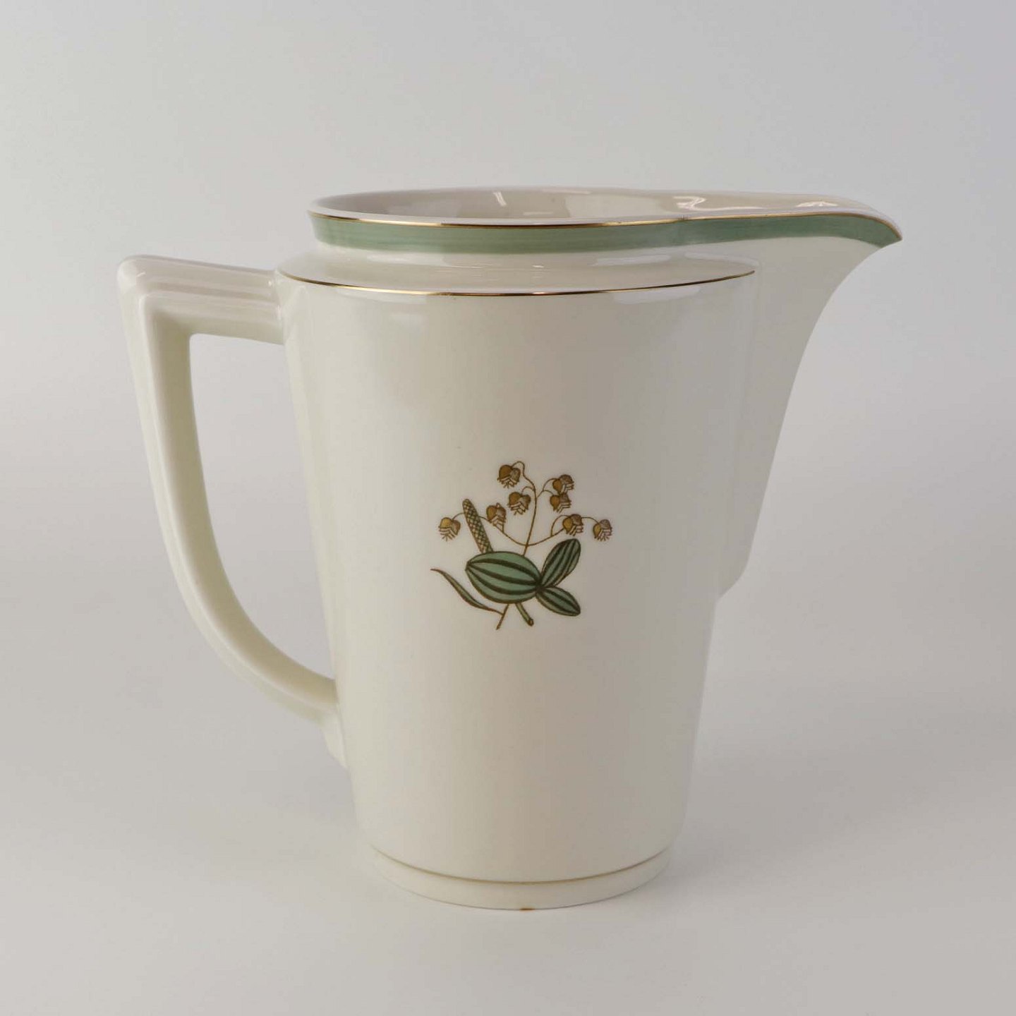Stel i glat råhvidt porcelæn dekoreret med lysegrøn stribe og guldkant samt motiv af hjertegræs.
