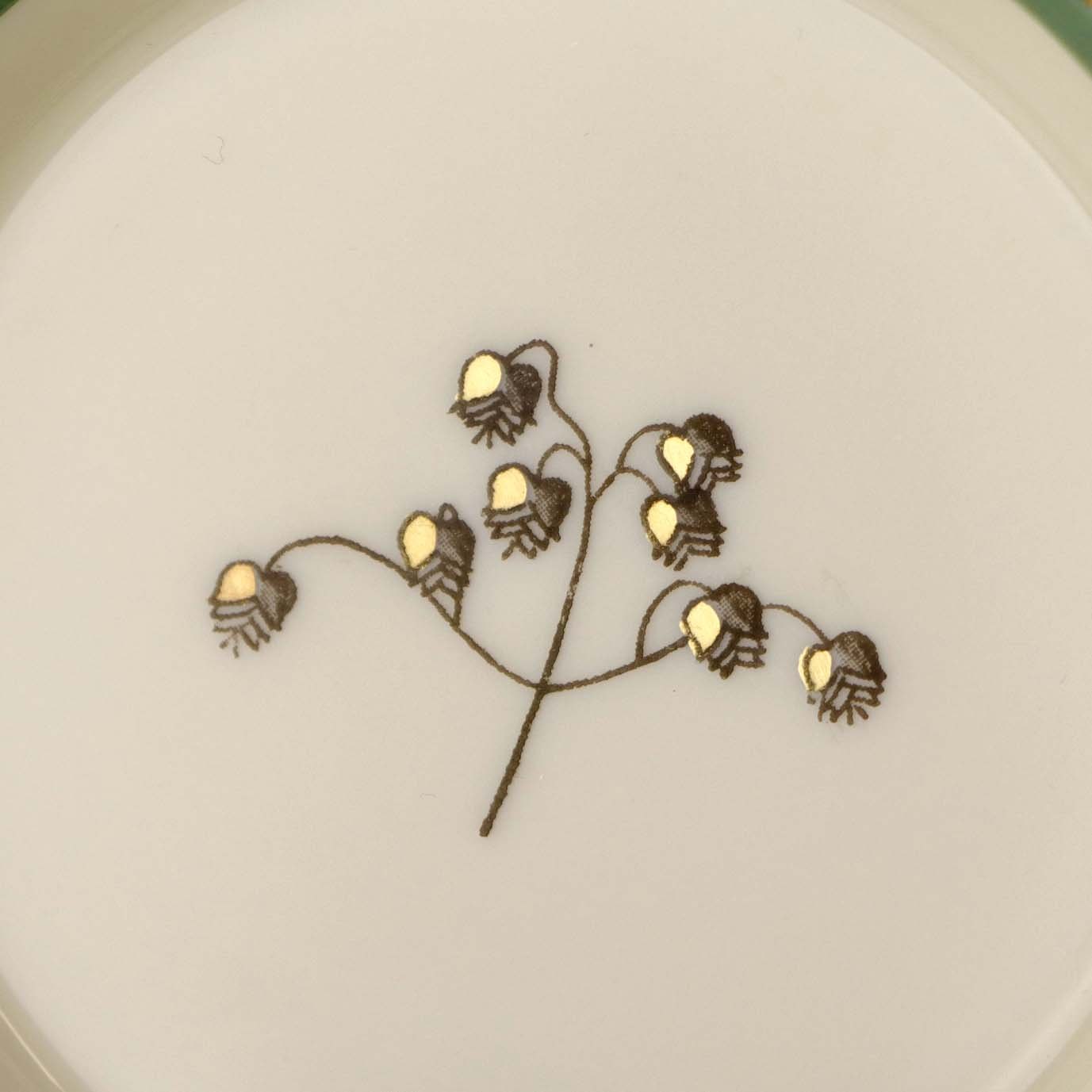 Stel i glat råhvidt porcelæn dekoreret med lysegrøn stribe og guldkant samt motiv af hjertegræs.