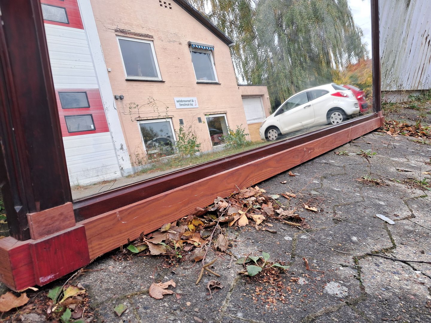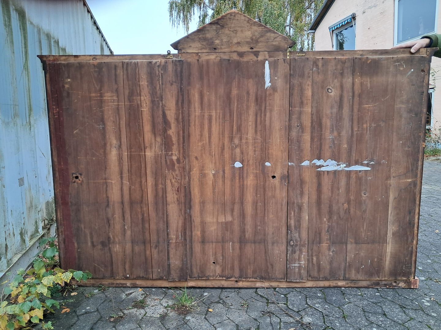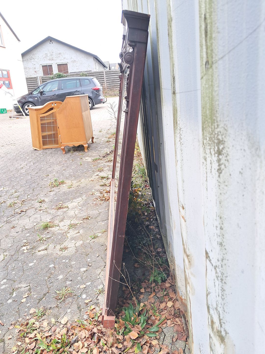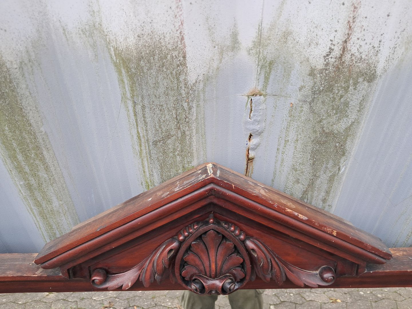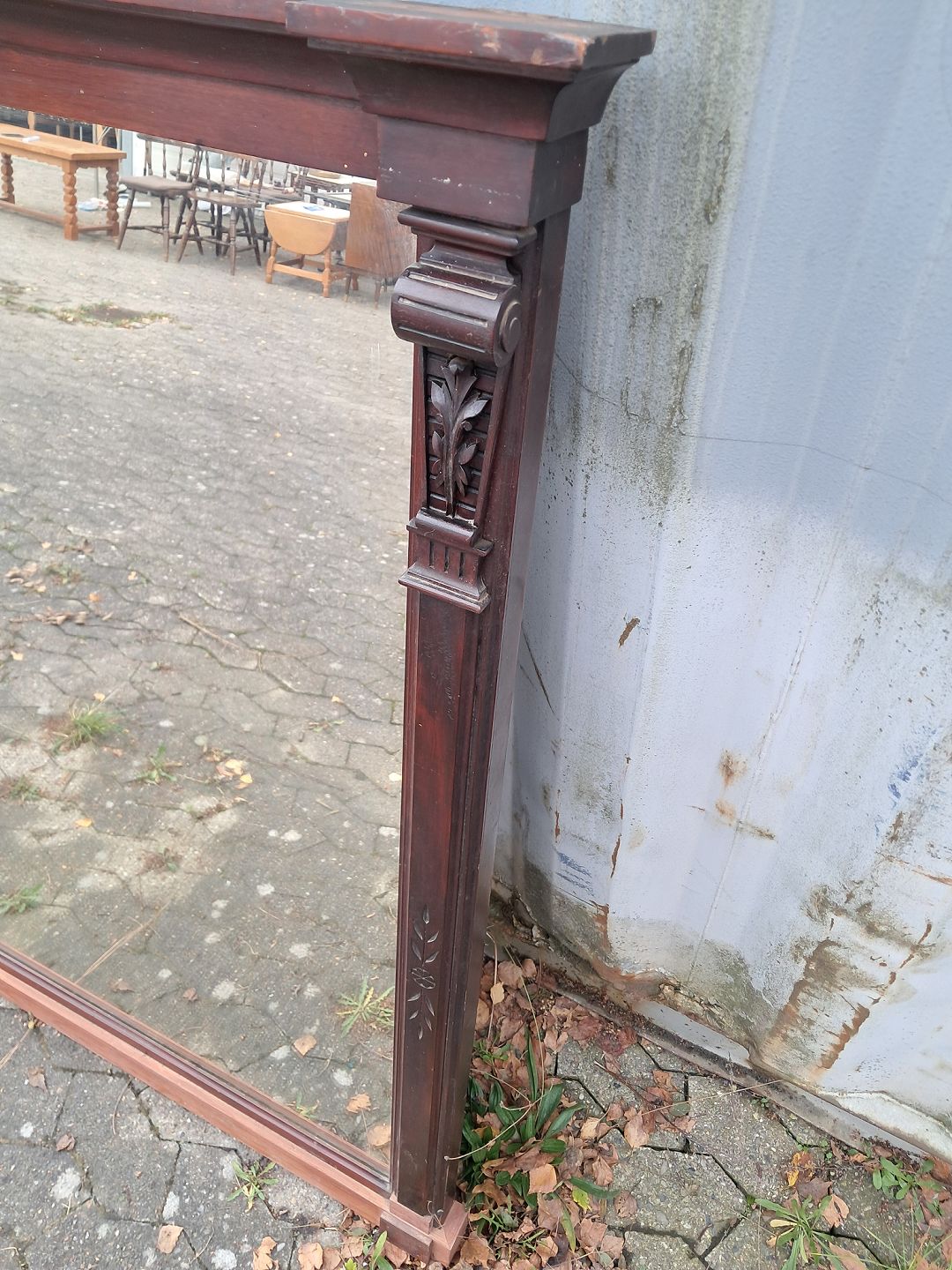 Beskrivelse: Kæmpe spejl i fineret mahogni, fra 1910erne.