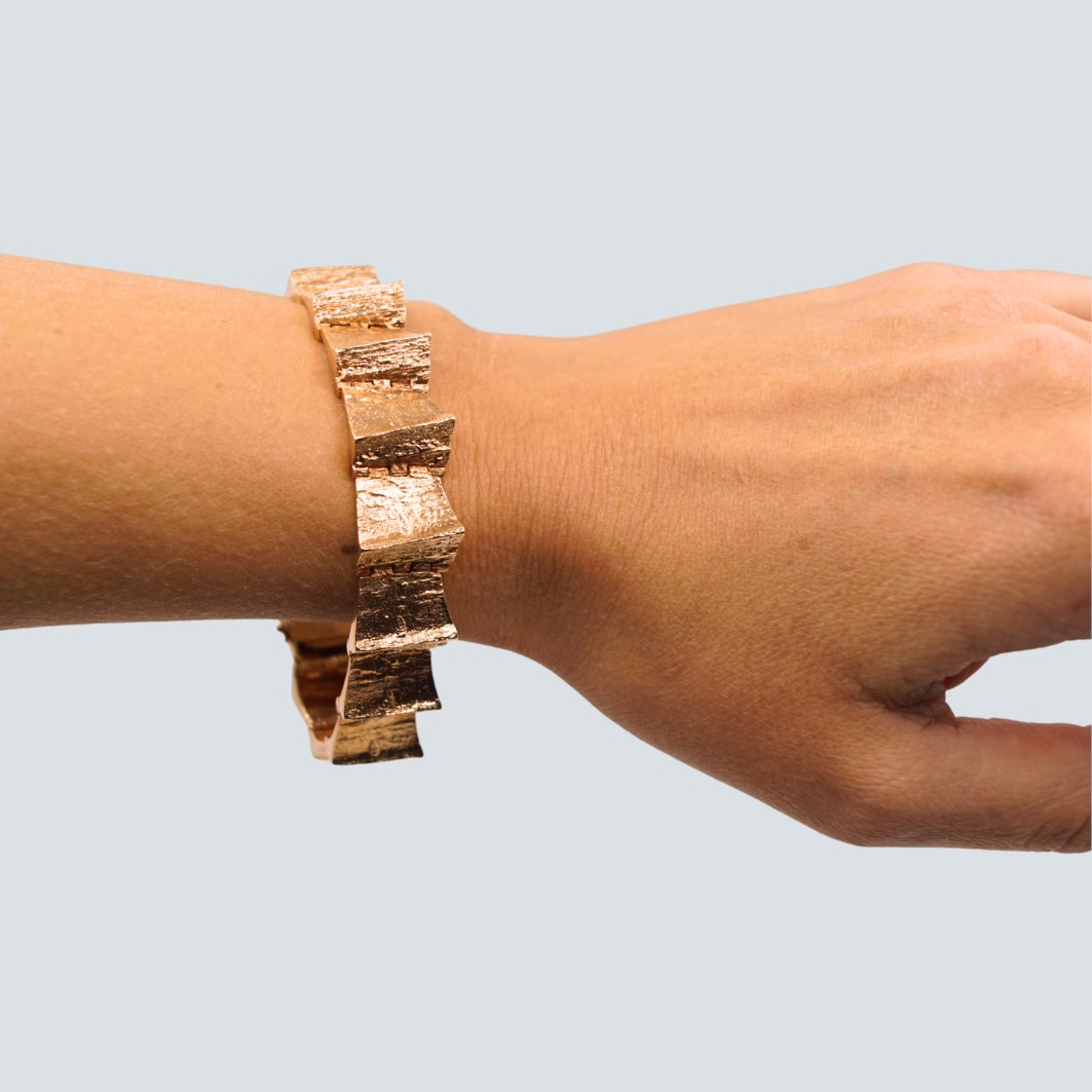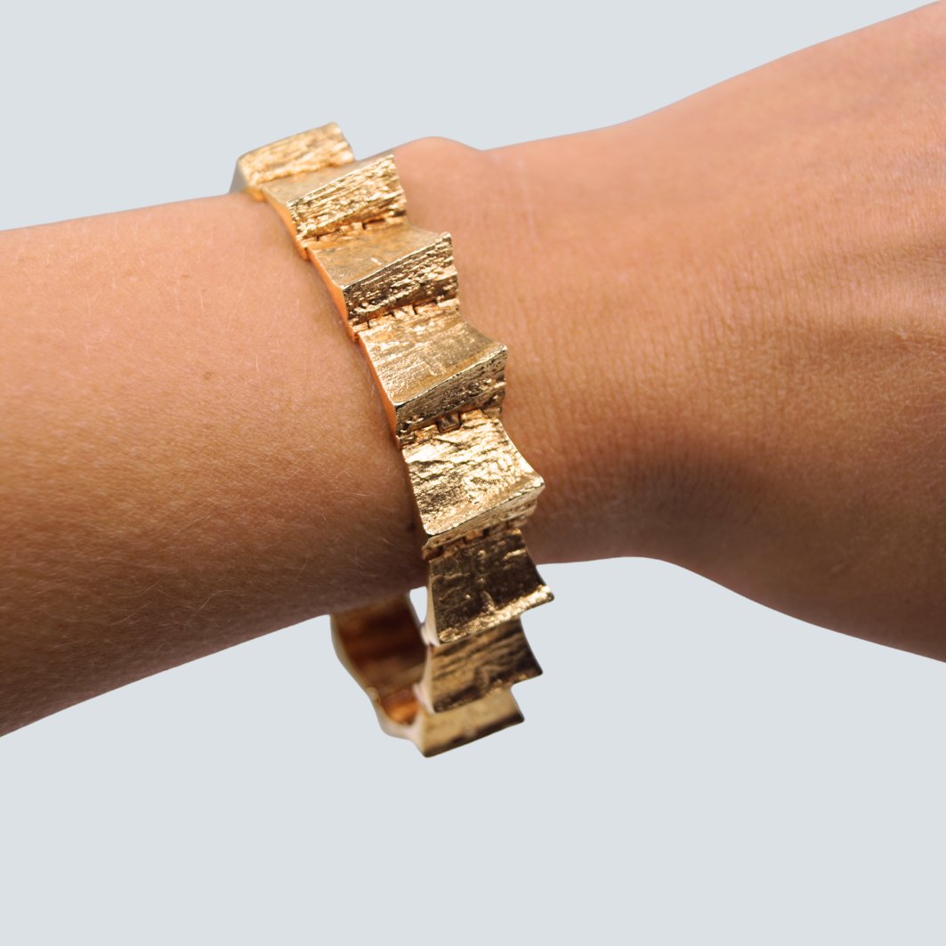 Beskrivelse: Toftegaard; Armbånd i 14 kt. guld. Sammensat af led med rustik overflade. Med kasselås, samt to sikkerhedslåse.