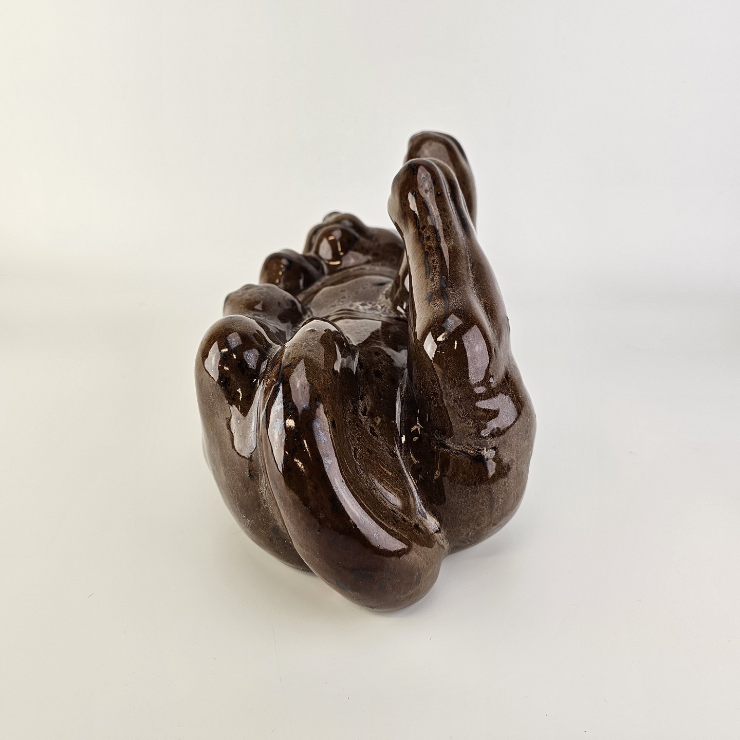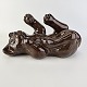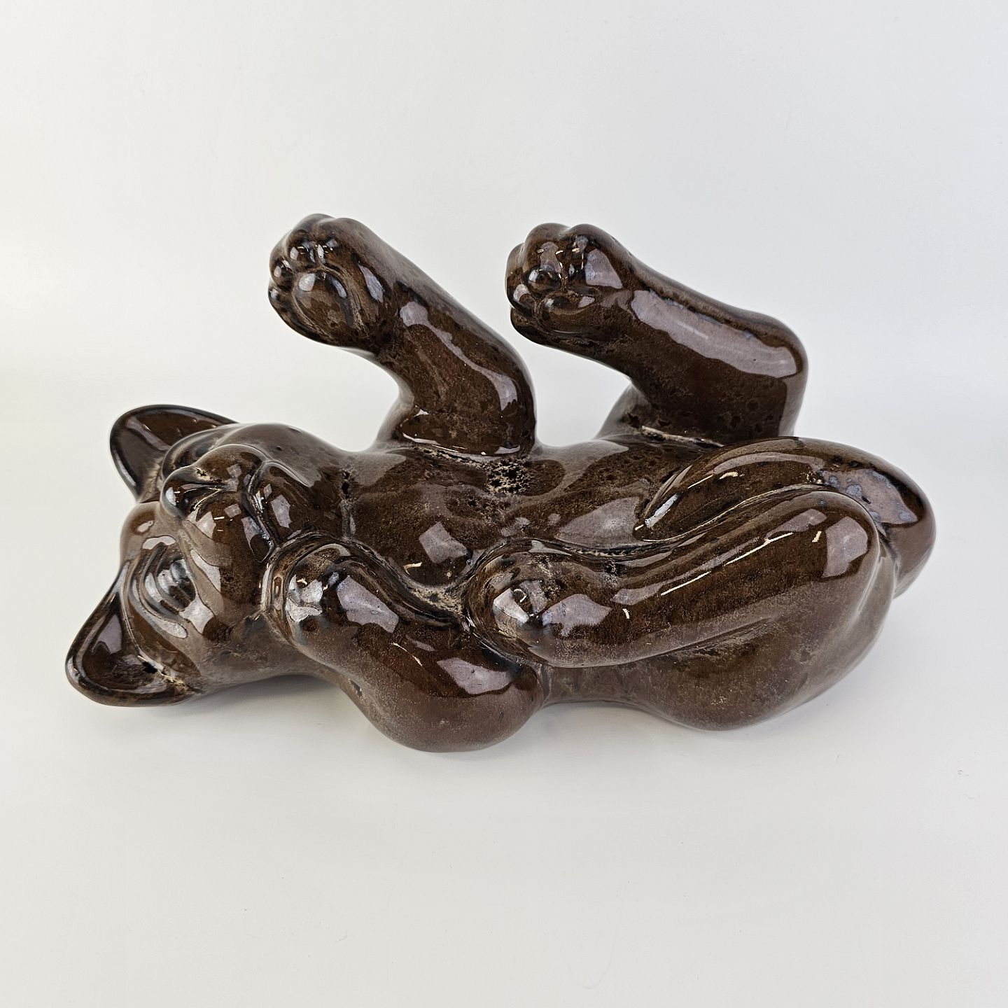 Beskrivelse: Figur i brunt glaseret lertøj med motiv af en kat som ligger på ryggen
