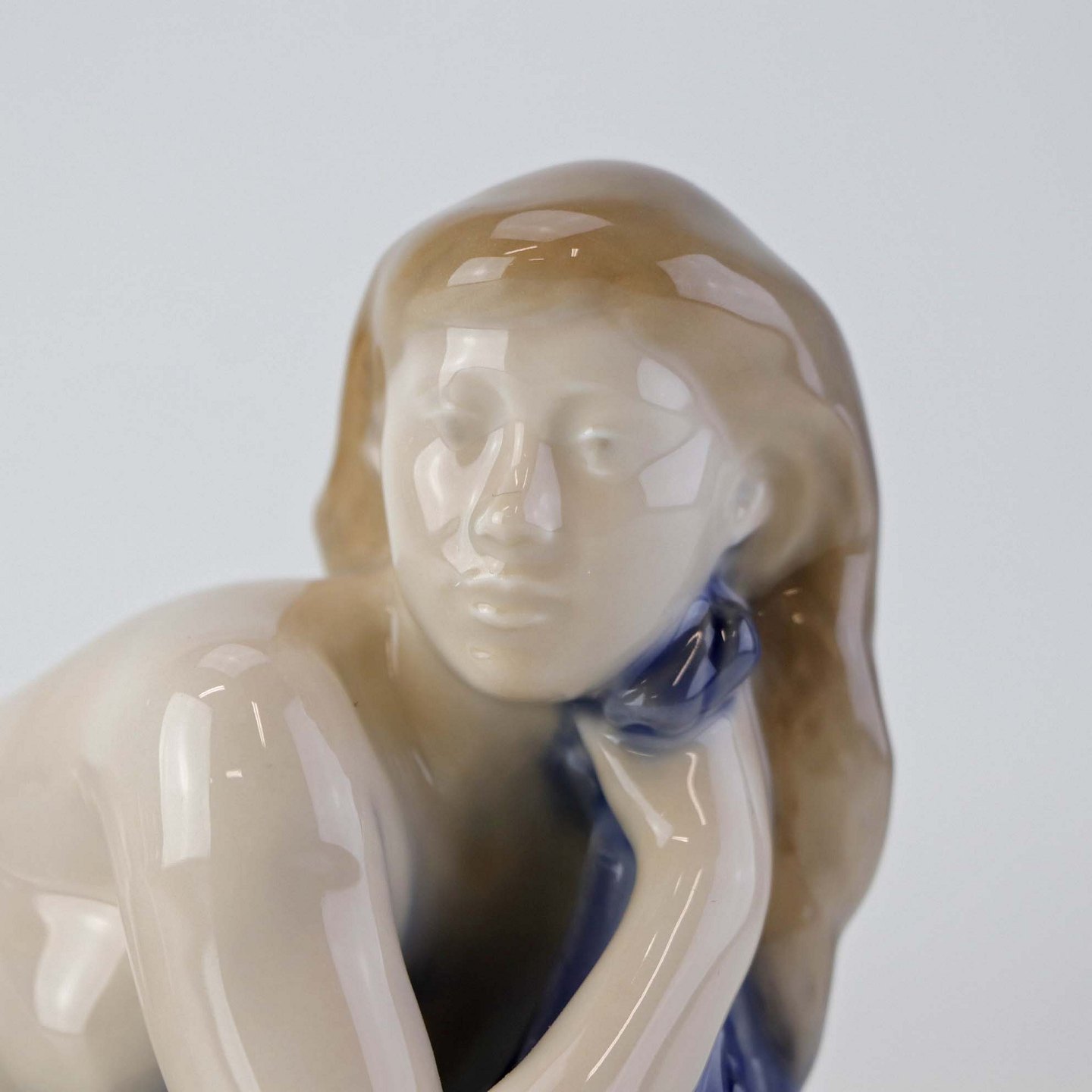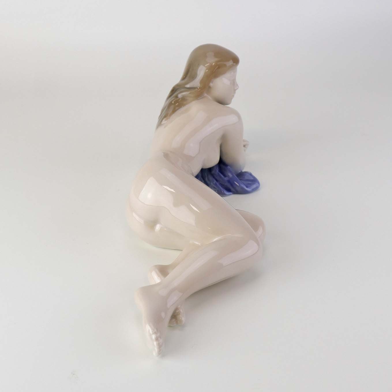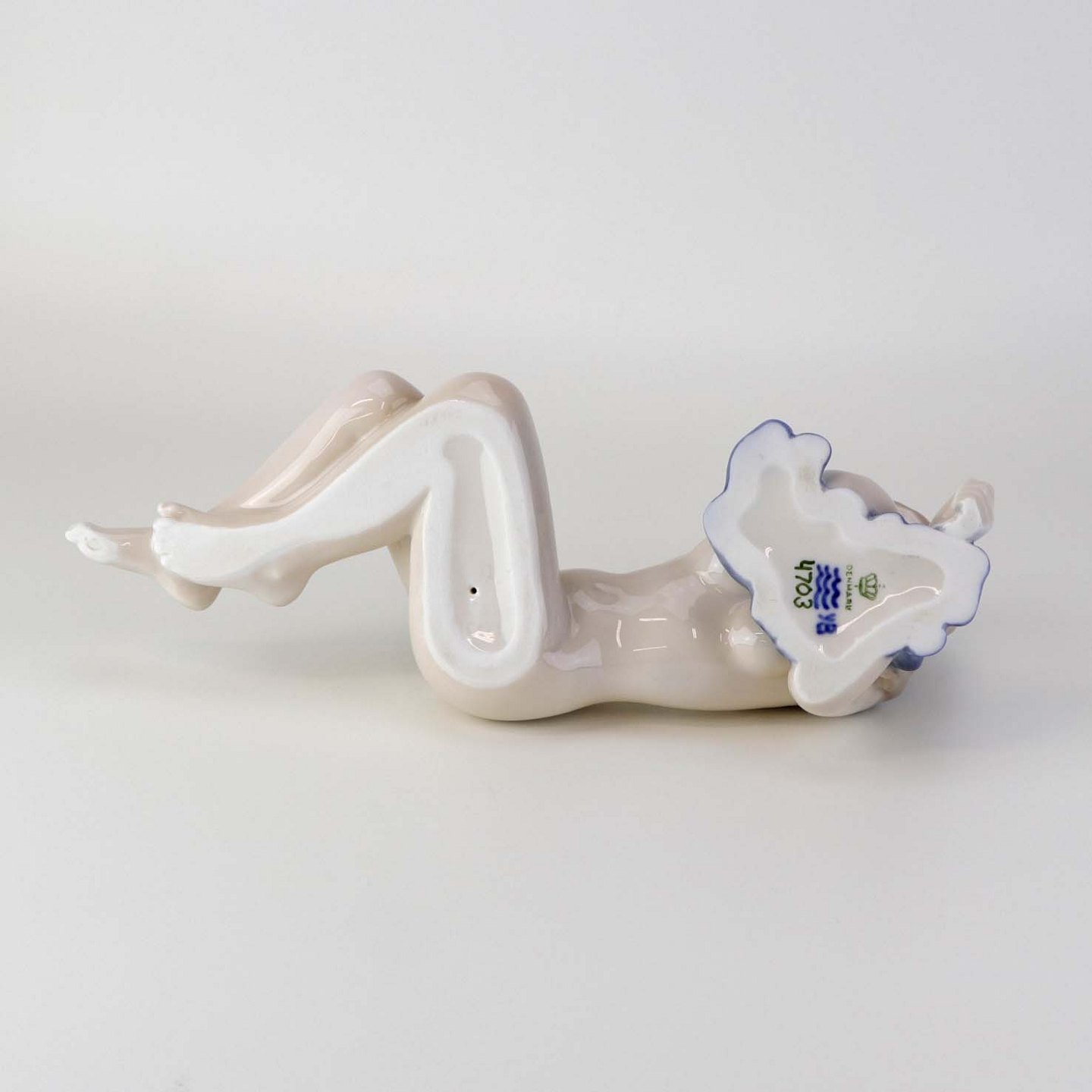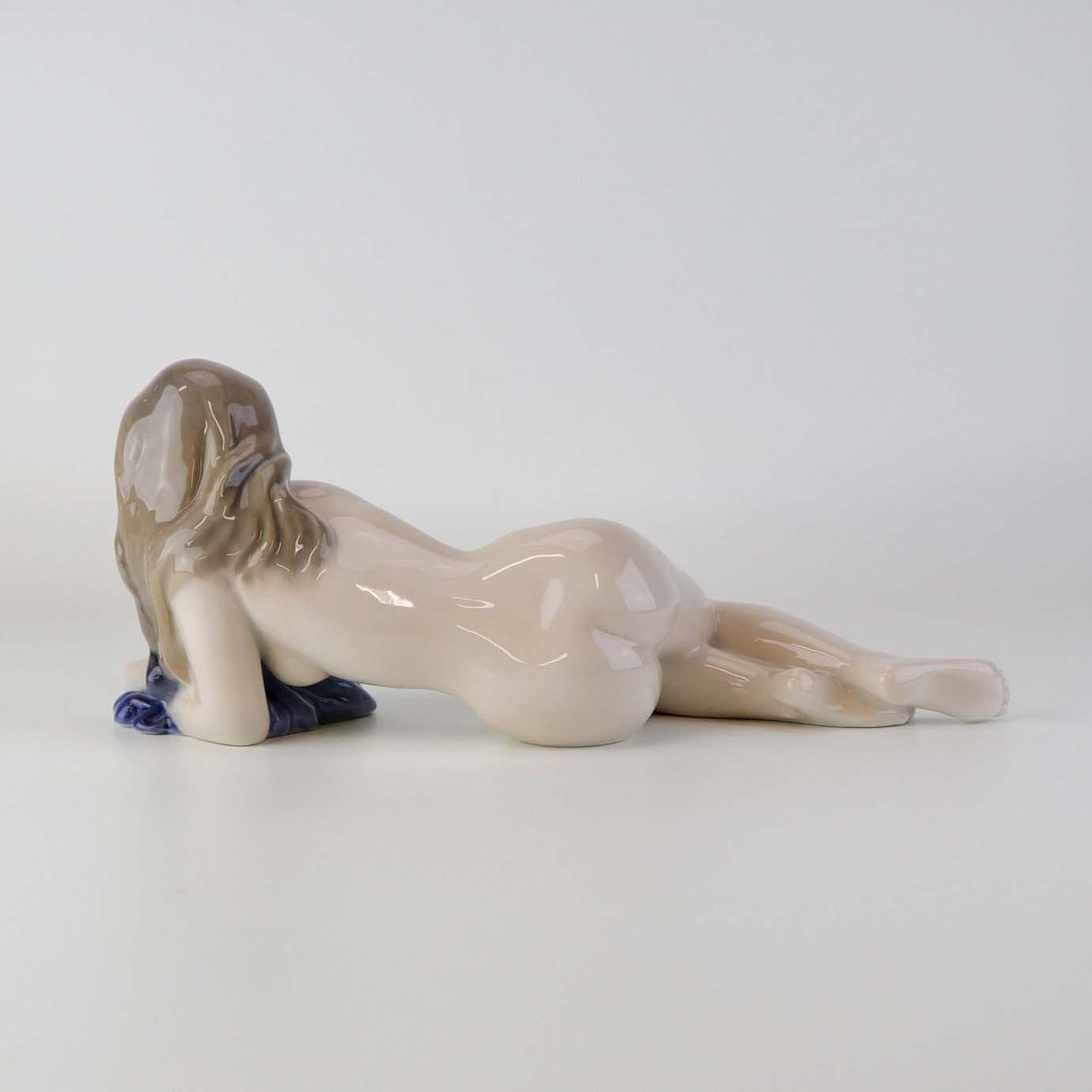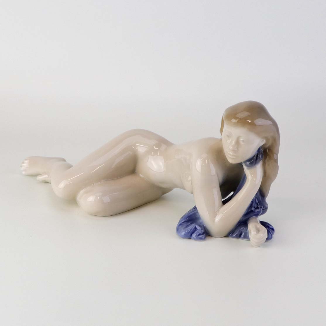 Beskrivelse: Figur i porcelæn med motiv af liggende nøgen kvinde med blåt klæde. Nr. 4703