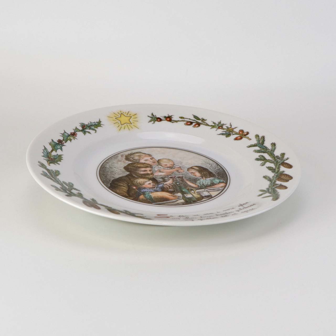 Beskrivelse: Flad desserttallerken i kongeligt porcelæn fra serien Peters Jul med motiv af julebordet med familien. Nr. 6