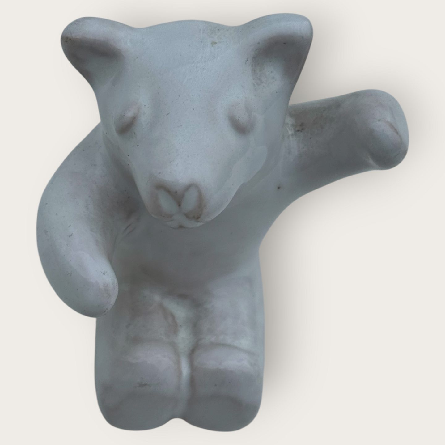Beskrivelse: Bornholmsk keramik, Hjorth, Bjørne orkester, Tilskuer, bjørn med hvid glasur, ca. 5,5x5,5cm *Pæn stand*