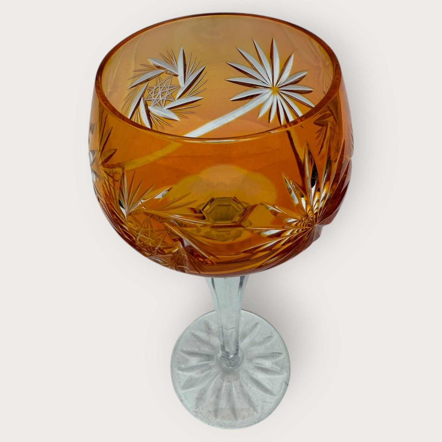 Beskrivelse: Bøhmisk krystal glas, Vin glas med slibninger, Gul, 19,5cm høj, 8cm i diameter *Perfekt stand*