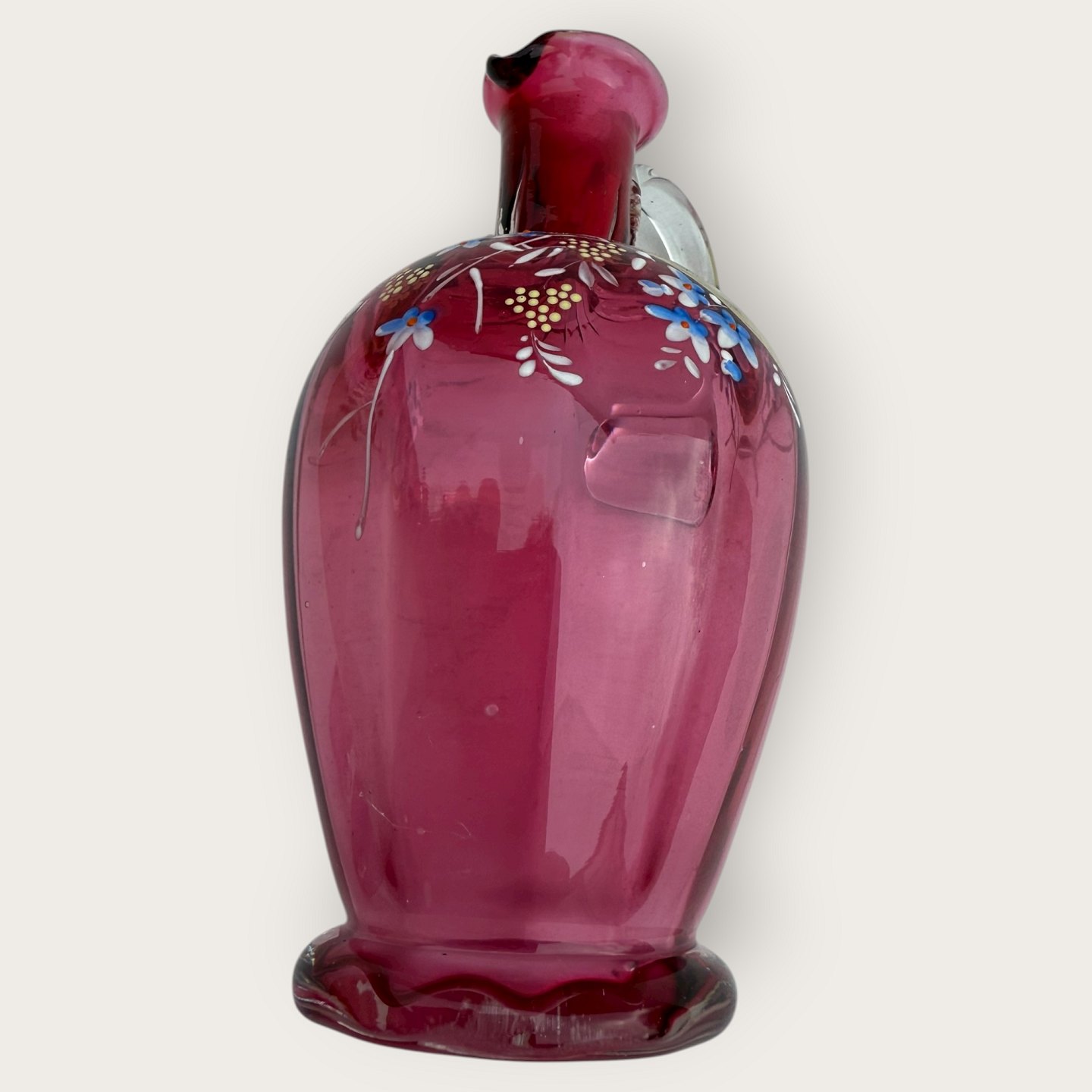 Beskrivelse: Ældre midteuropæisk karaffel i pinkfarvet glas med bemaling, medfølgende 2 glas, Karaffel ca. 21cm høj og 9cm bred, de to glas har meget små nøk i kanten, karaflen er i fin stand.