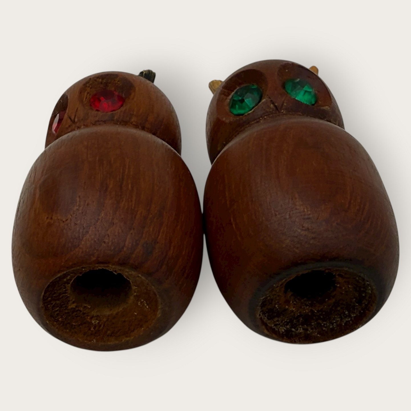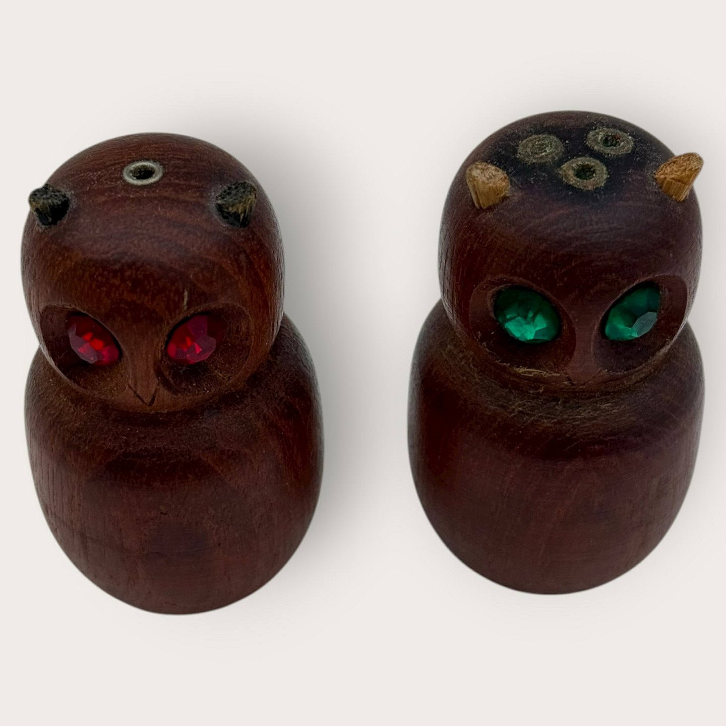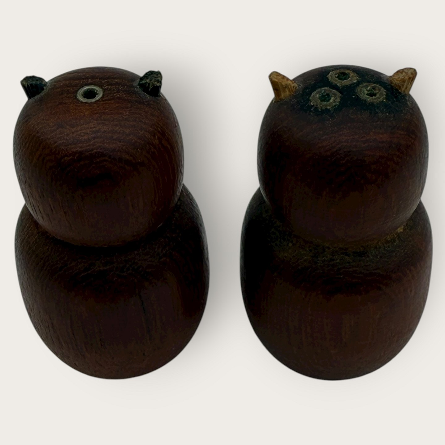 Beskrivelse: Salt og pebersæt i teaktræ fra 1960'erne, fugle / ugler med grønne og røde øjne, fremstår pænt patineret og uden bundpropper.