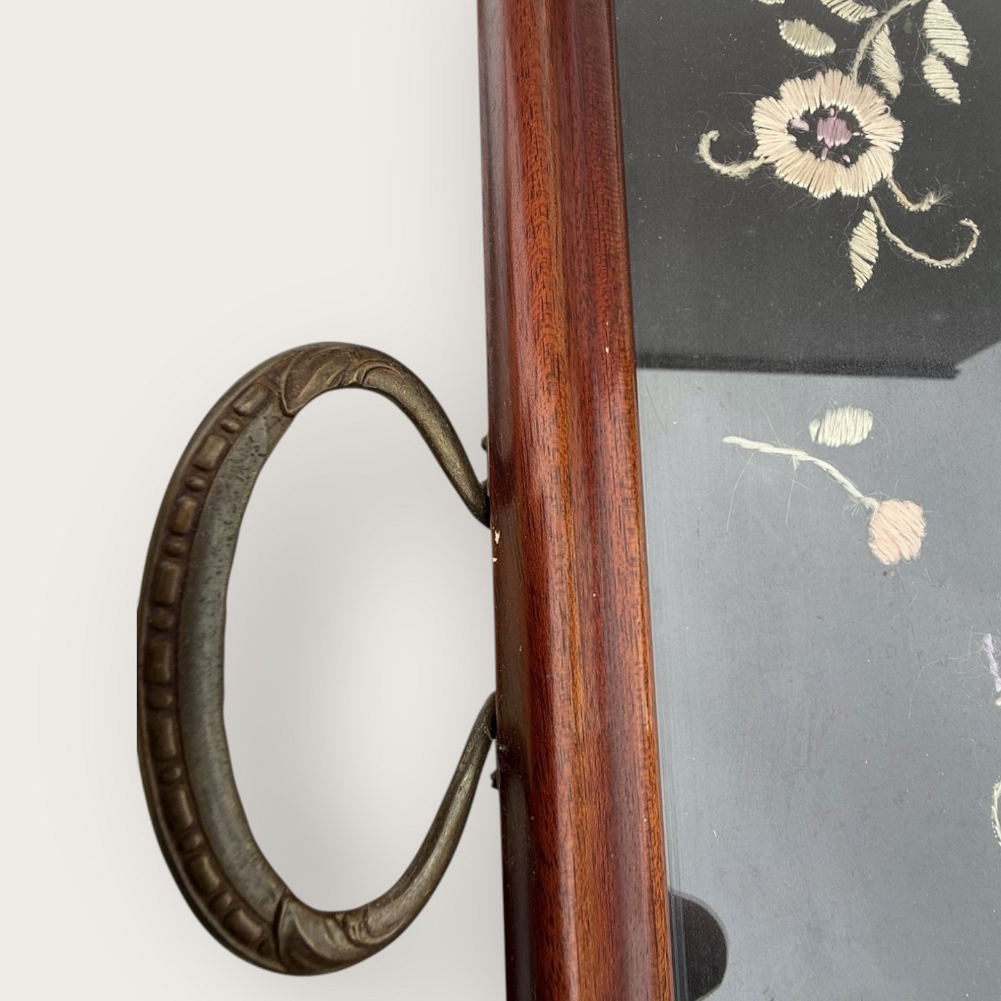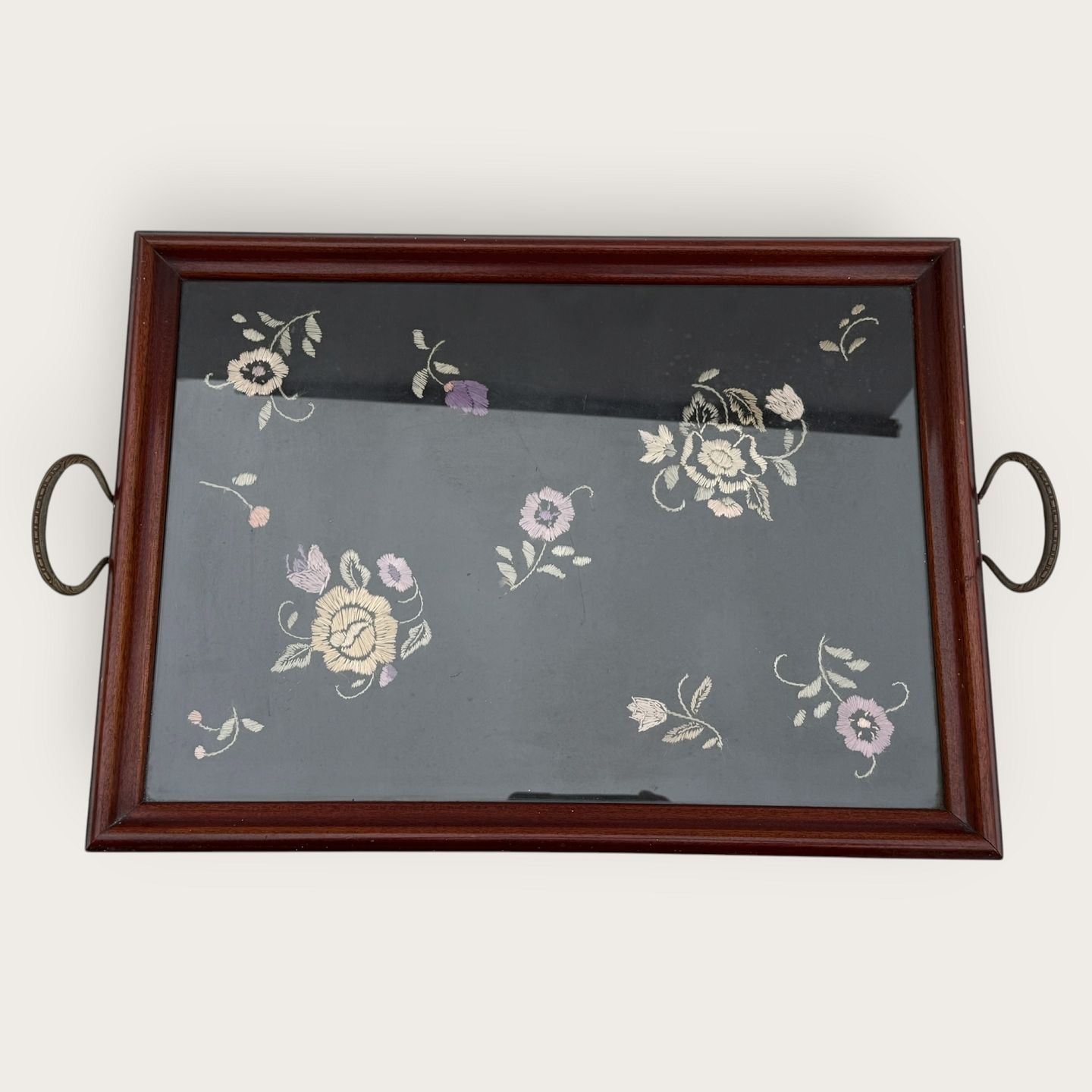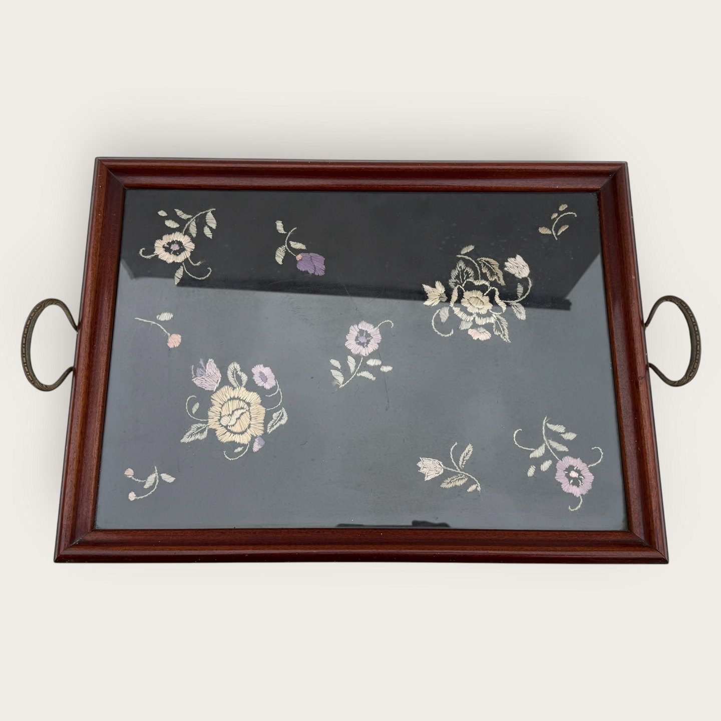 : Bakke med metalhåndtag og broderi under glasplade, 35x47cm (uden hanke) *pæn stand*