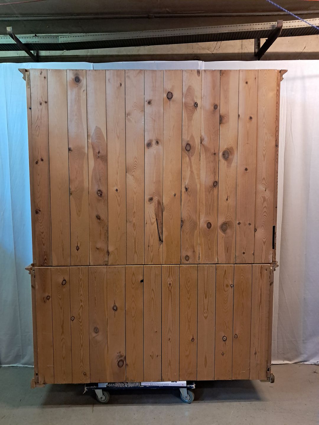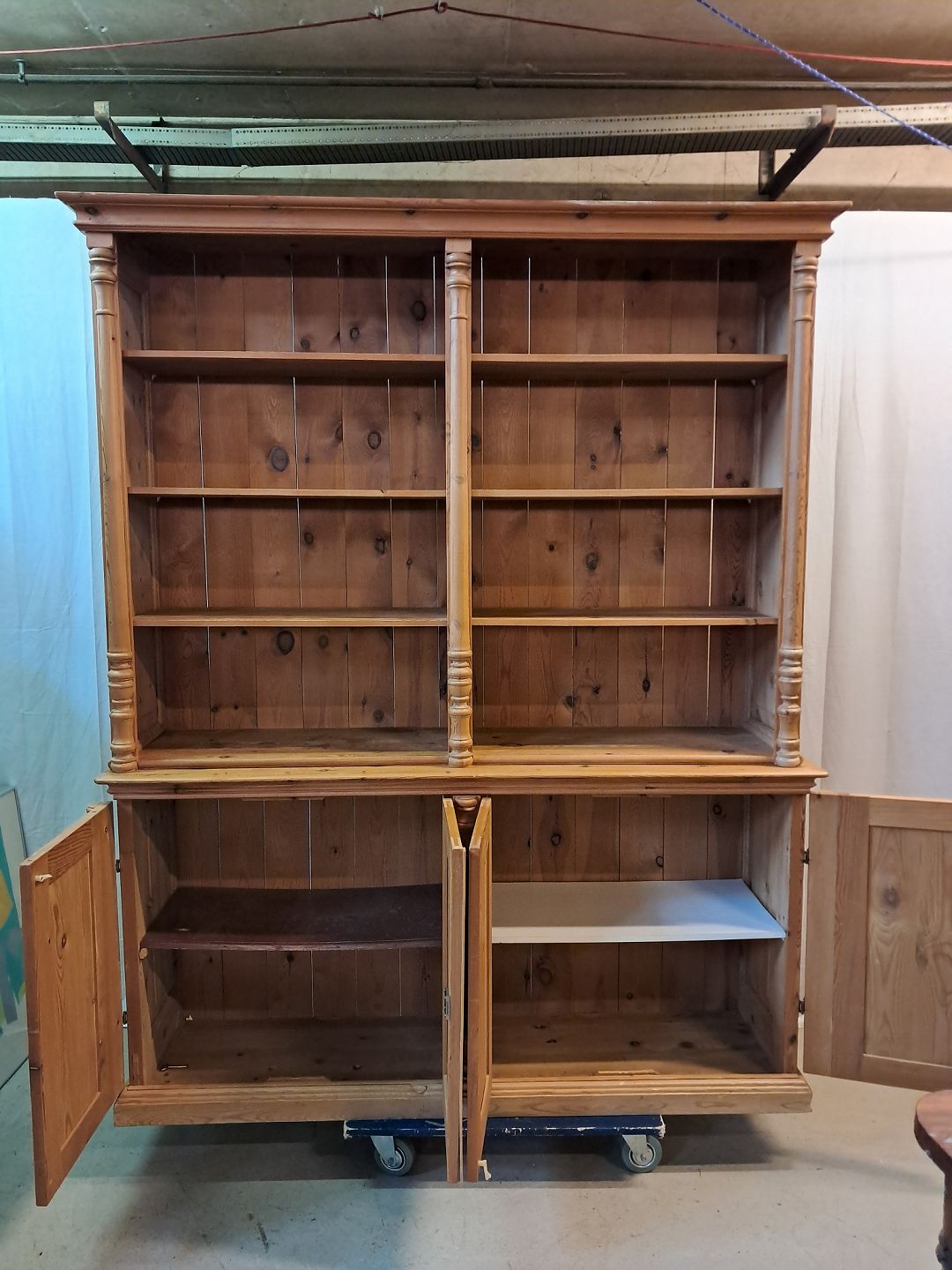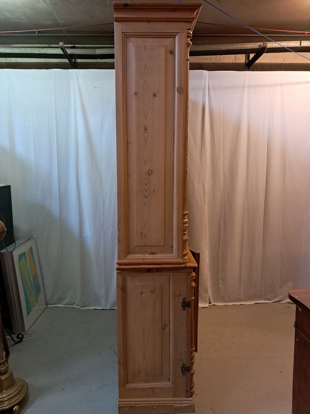 Beskrivelse: Skab med reol overdel i massivt fyrretræ, fra 1980erne.