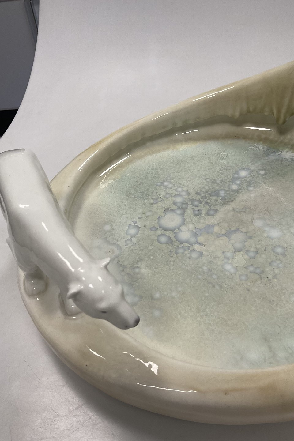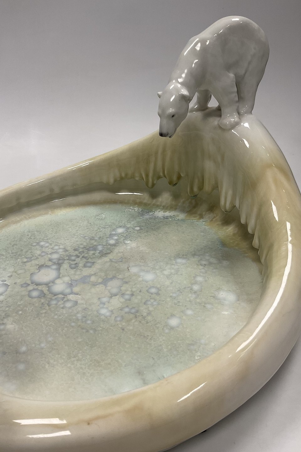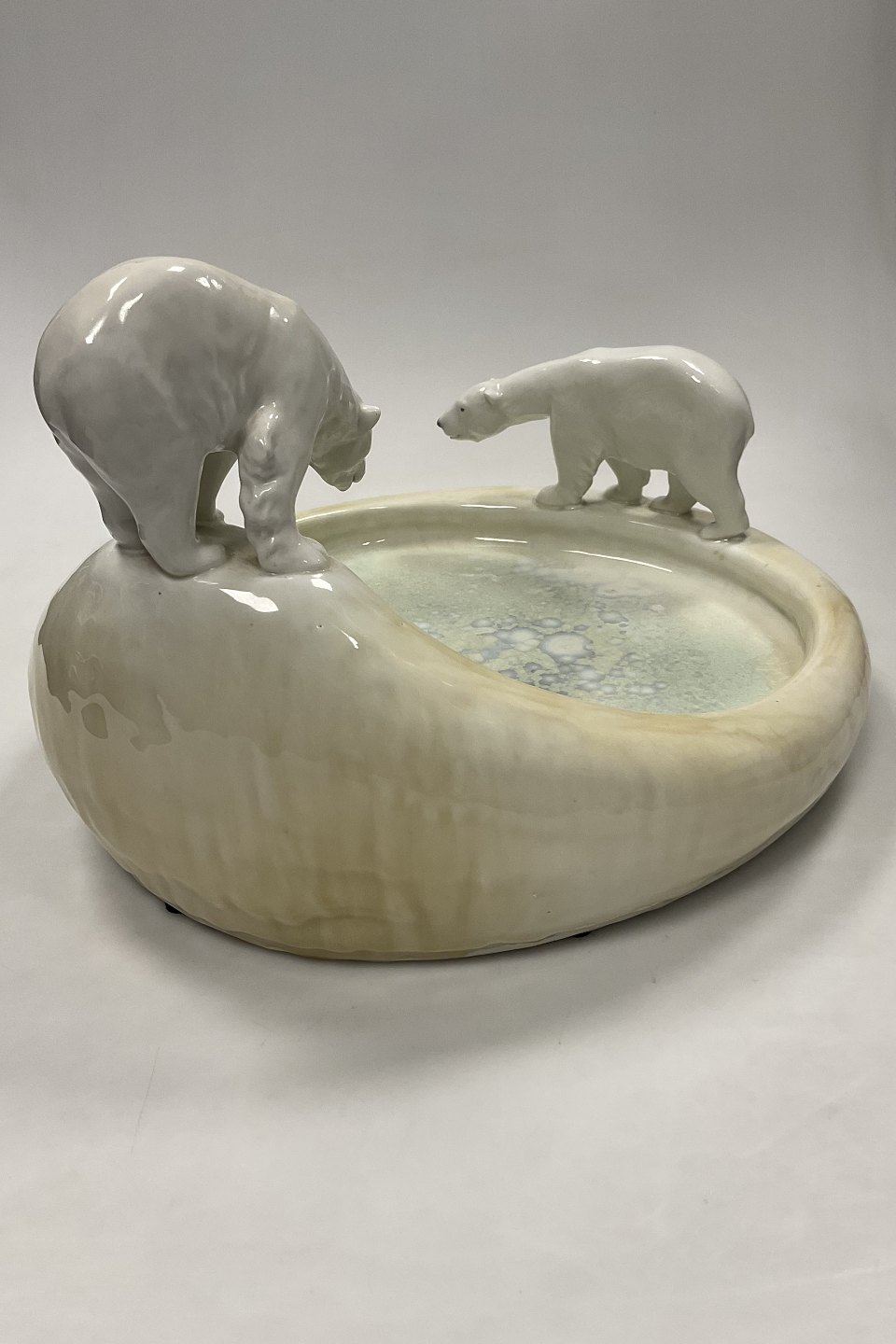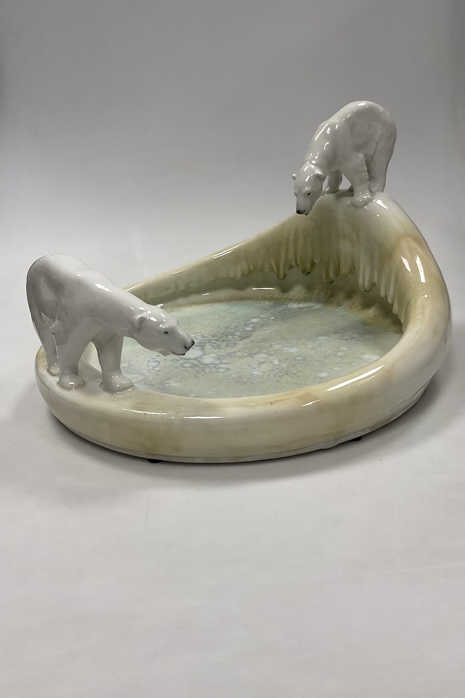 Stor Royal Copenhagen Art Nouveau Krystal Glasur Skål med Isbjørne designet af Arnold Krog og Glasur af Søren Berg "Nordpolen" fra 17. Januar 1925