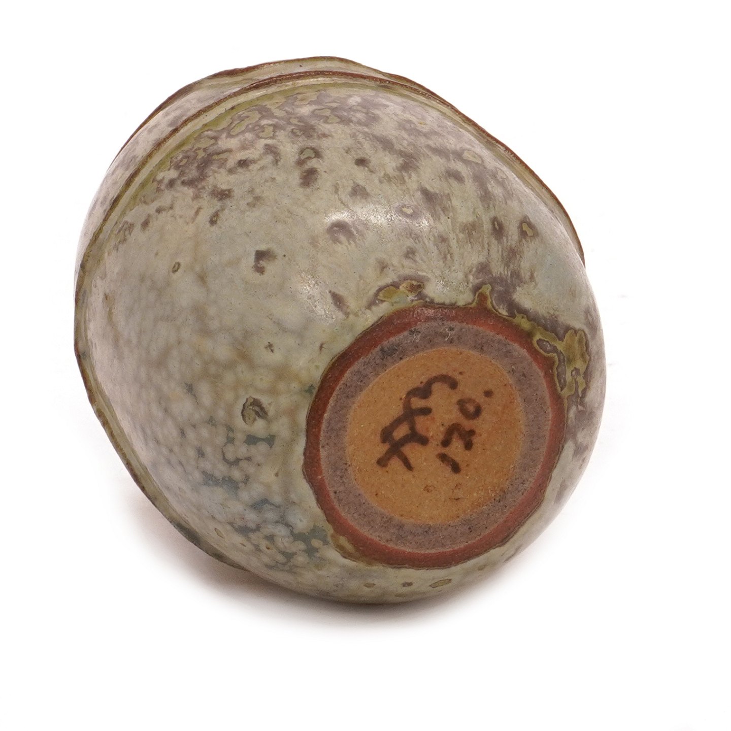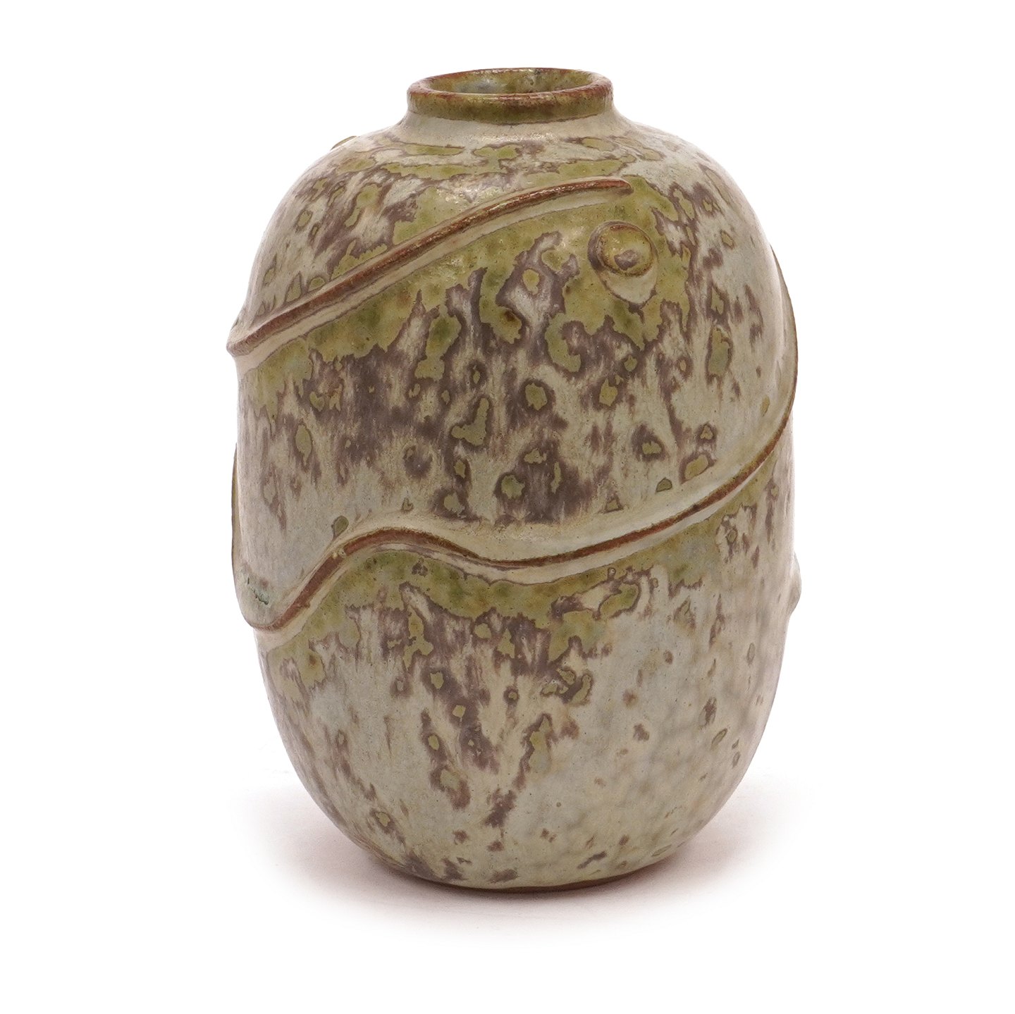 Arne Bang stentøjsvase med spættet glasur modelleret i relief. Modelnummer 120. H: 11cm