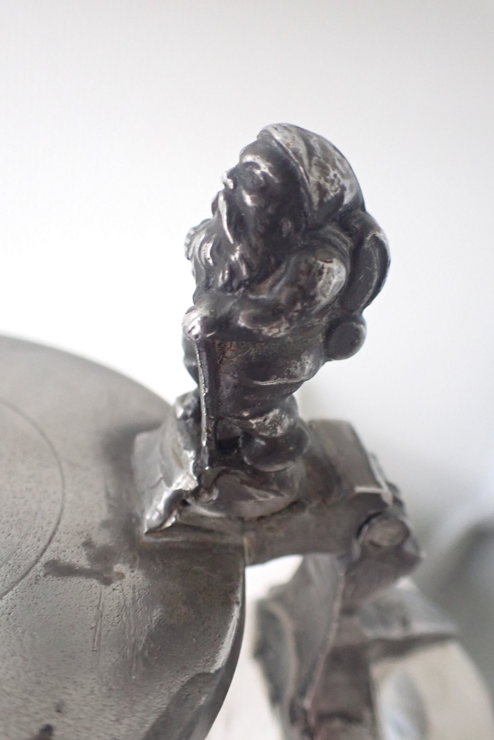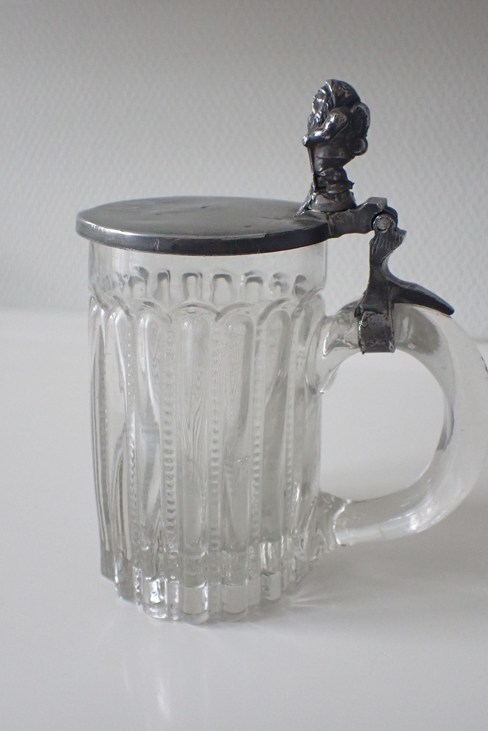 Beskrivelse: Nisse ølkrus - klart riflet glaskrus med hank og med tinlåg. Studsen på tinlåget er udformet som en nisse med rygsæk og stav. Tyskland ca. 1880. 1 liter. Højde med låg u. studs: 13,2 cm. Med studs: 17 cm. I pæn stand i forhold til alder.
