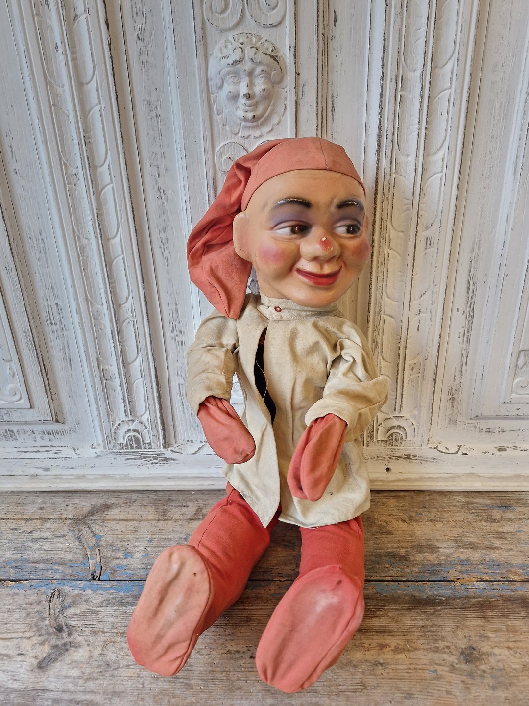 Beskrivelse: Stor gamle fin butiks nisse, hovedet er fremstillet i håndmalet keramik, arme og ben kan bøjes.