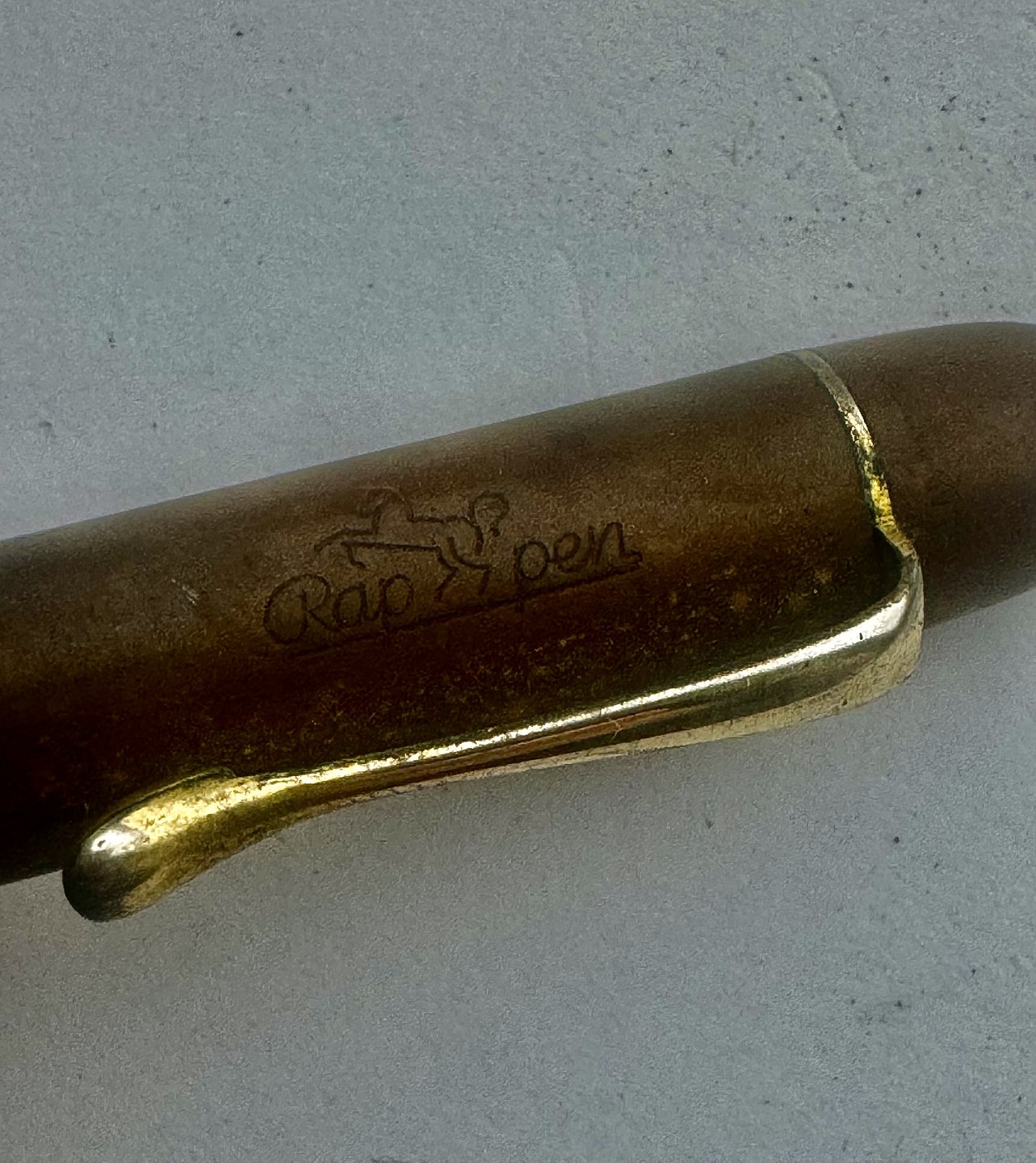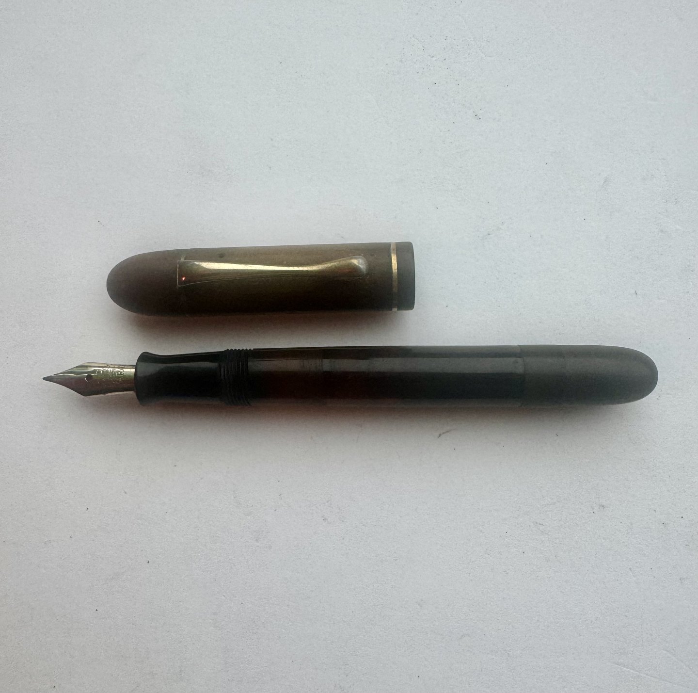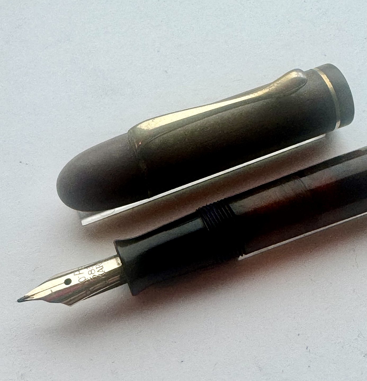 Beskrivelse: Sort Rappen fyldepen fra begyndelsen af 1930'erne. Piston blæk-påfylder med transparent blækvindue. Stemplet kører frem og tilbage, når bundskruen aktiveres, men den kan ikke optage blæk, hvorfor den skal restaureres inden den igen fungerer som fyldepen. Hætten er misfarvet, hvorfor den ikke helt har samme farve som resten af pennen. Fremstillet hos Pelikan i Tyskland, hvilket pennens design i virkeligheden afslørerL 11,2 cm