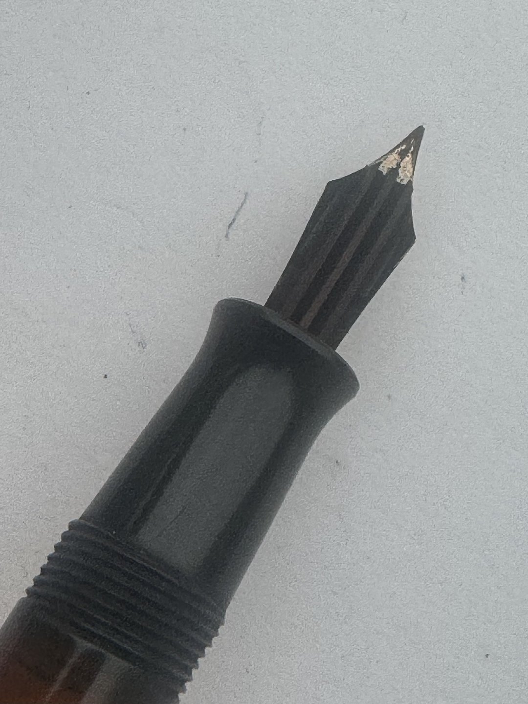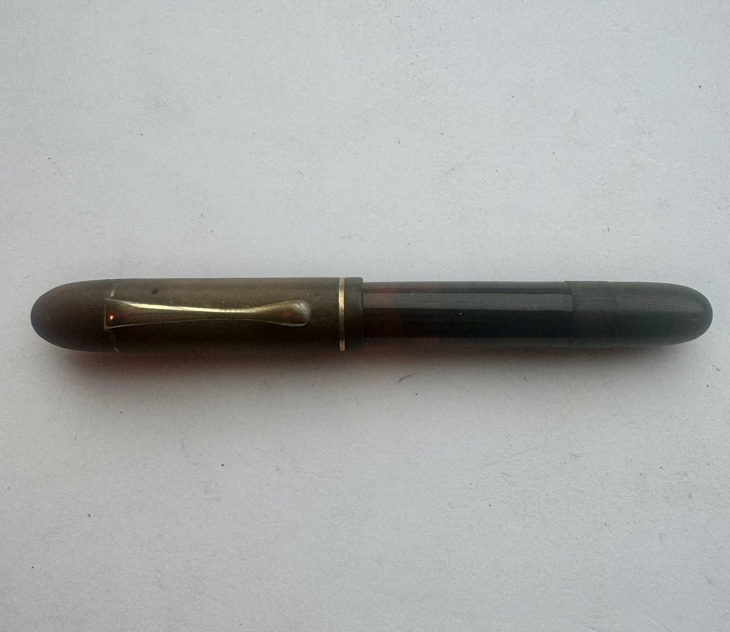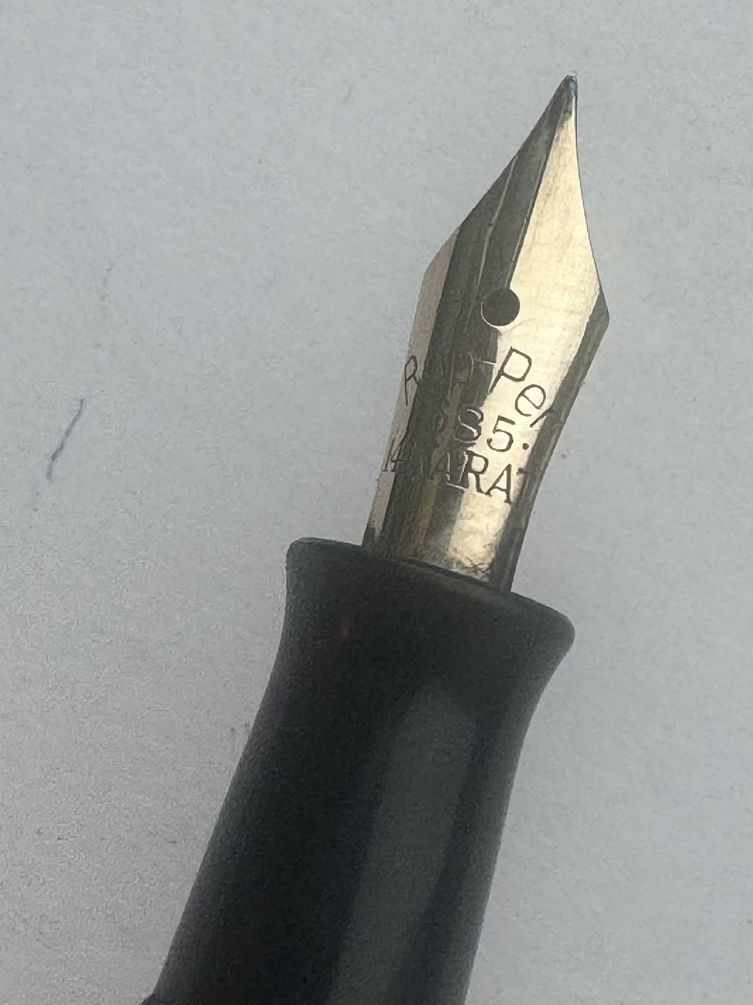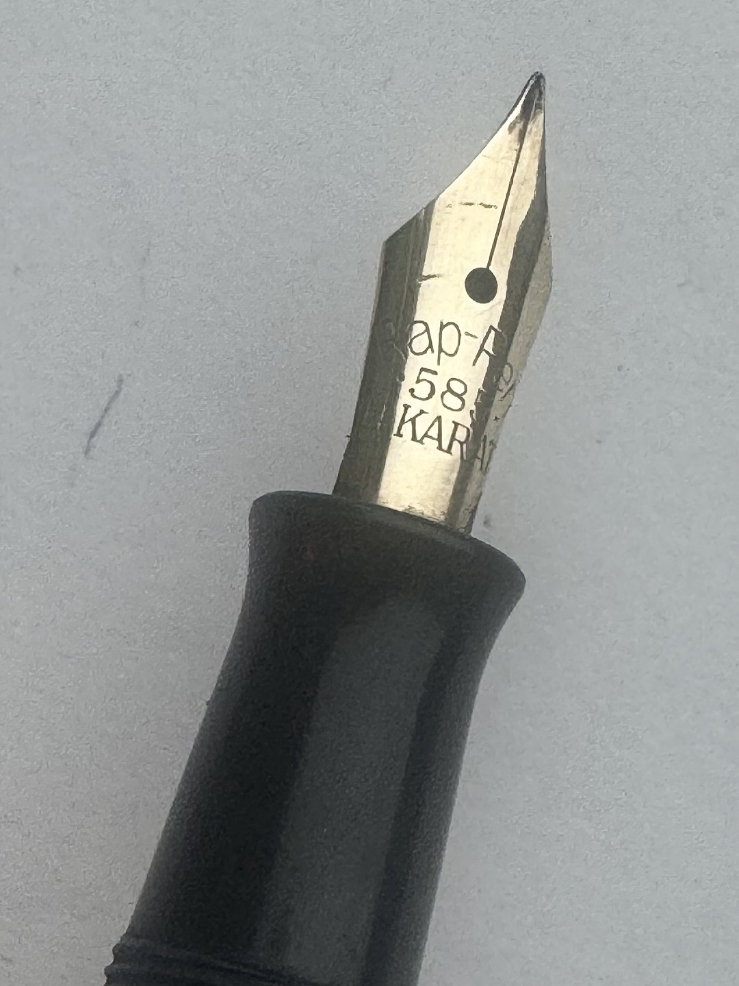 Beskrivelse: Sort Rappen fyldepen fra begyndelsen af 1930'erne. Piston blæk-påfylder med transparent blækvindue. Stemplet kører frem og tilbage, når bundskruen aktiveres, men den kan ikke optage blæk, hvorfor den skal restaureres inden den igen fungerer som fyldepen. Hætten er misfarvet, hvorfor den ikke helt har samme farve som resten af pennen. Fremstillet hos Pelikan i Tyskland, hvilket pennens design i virkeligheden afslørerL 11,2 cm