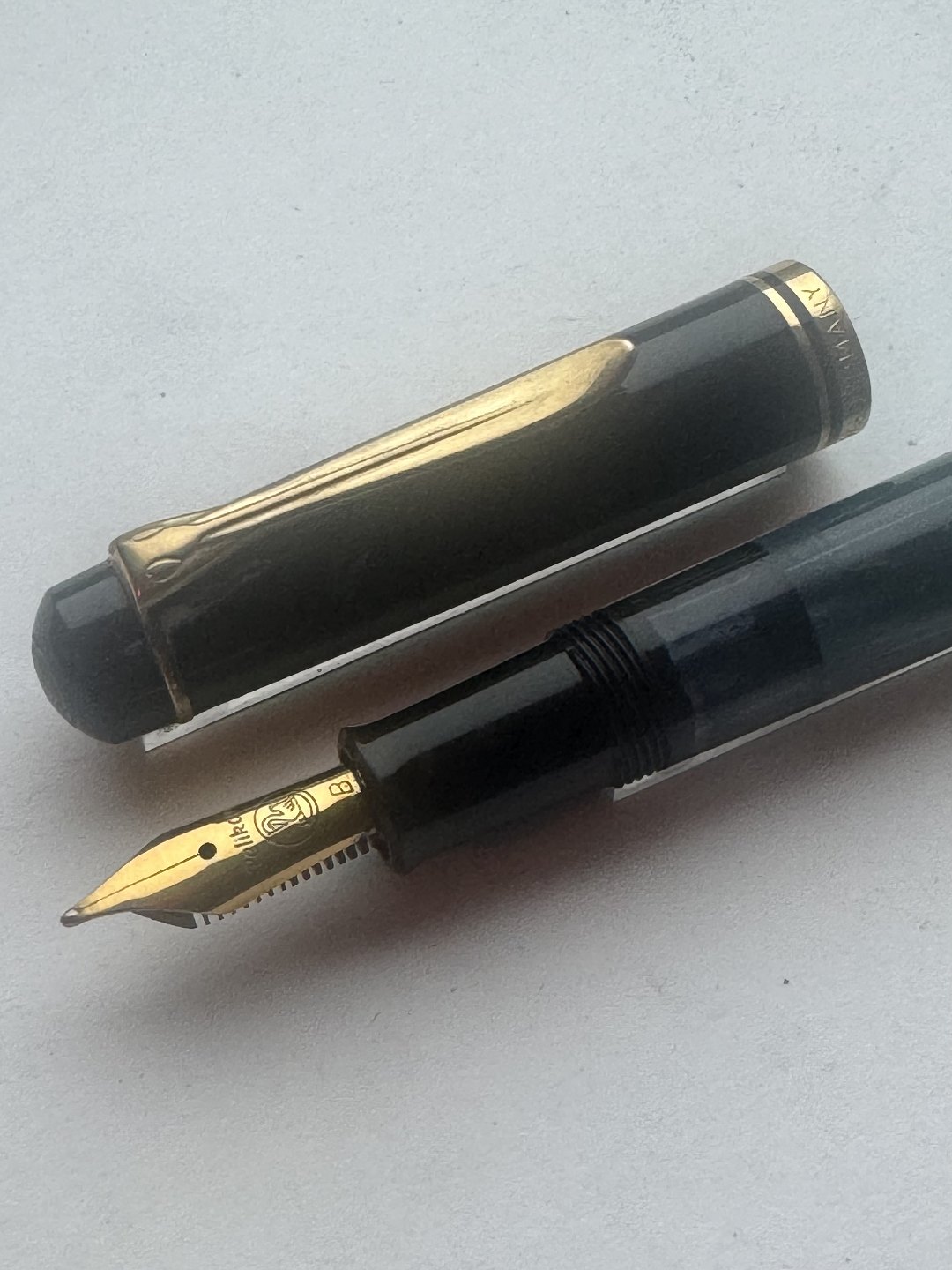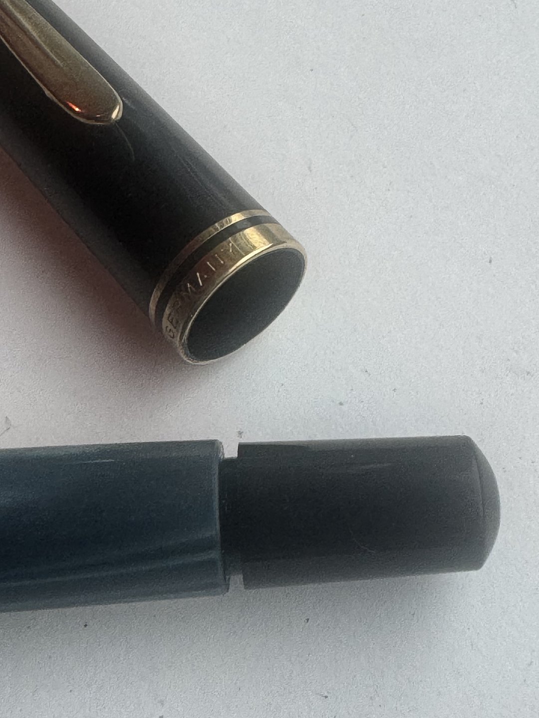 Beskrivelse: Pelikan M200 fyldepen. Fremstillet i Vest-Tyskland i 1970’erne. Den lille kapsel med logo på toppen af hætten har en revne (se foto). Eller i god funktionsduelig stand.