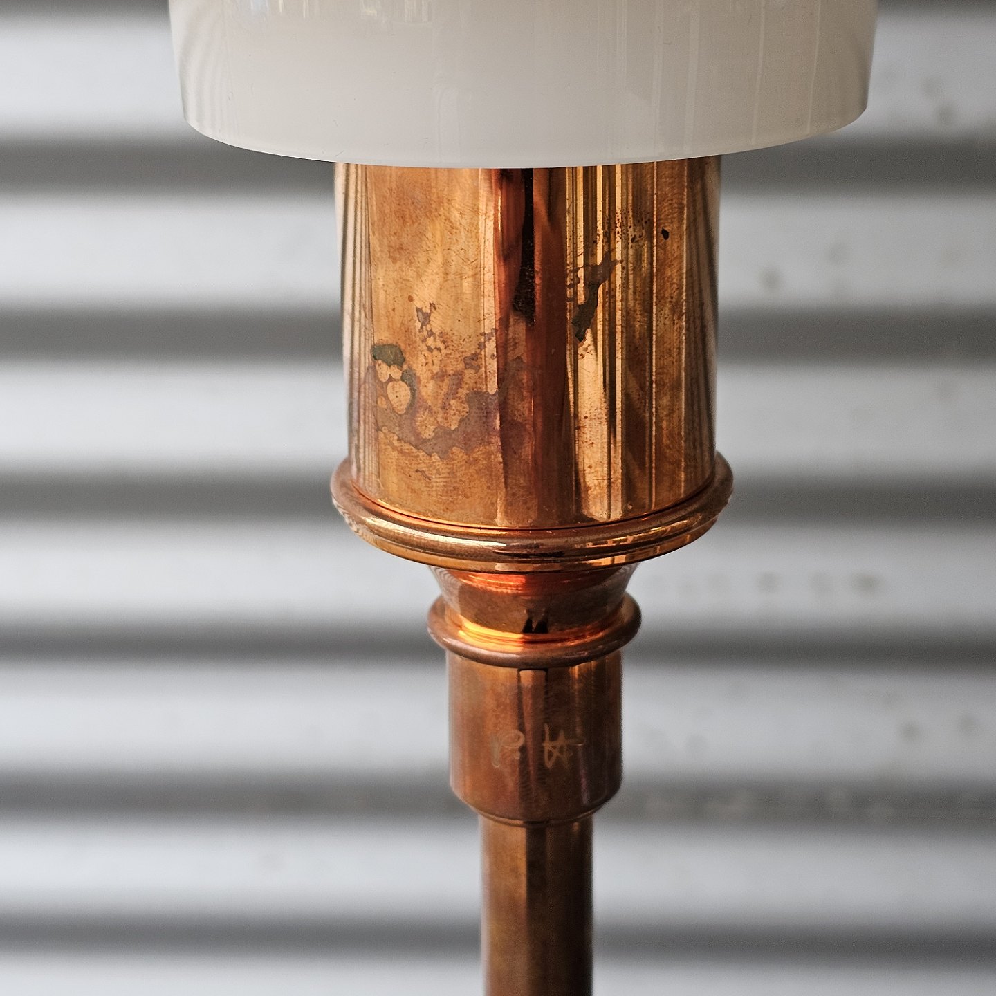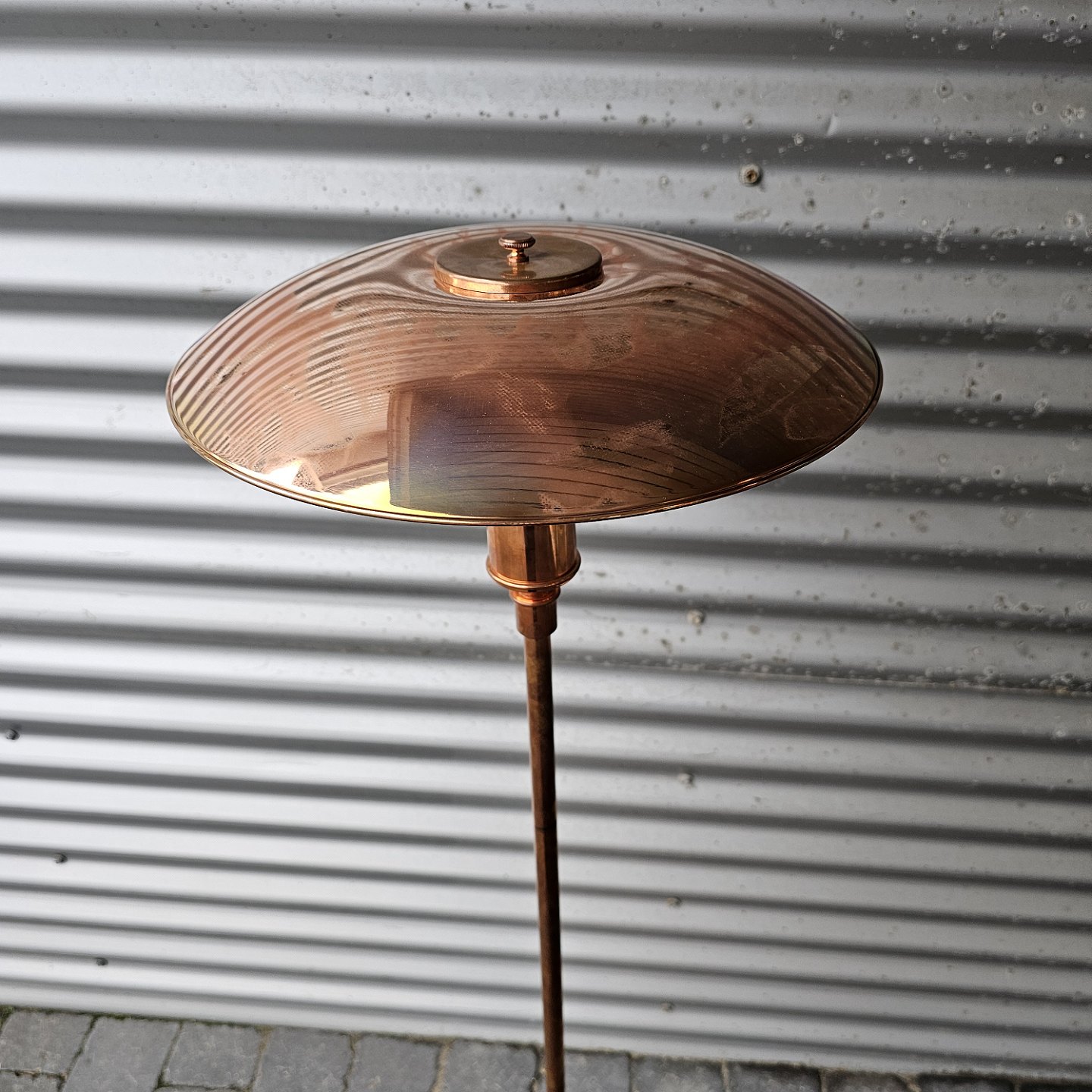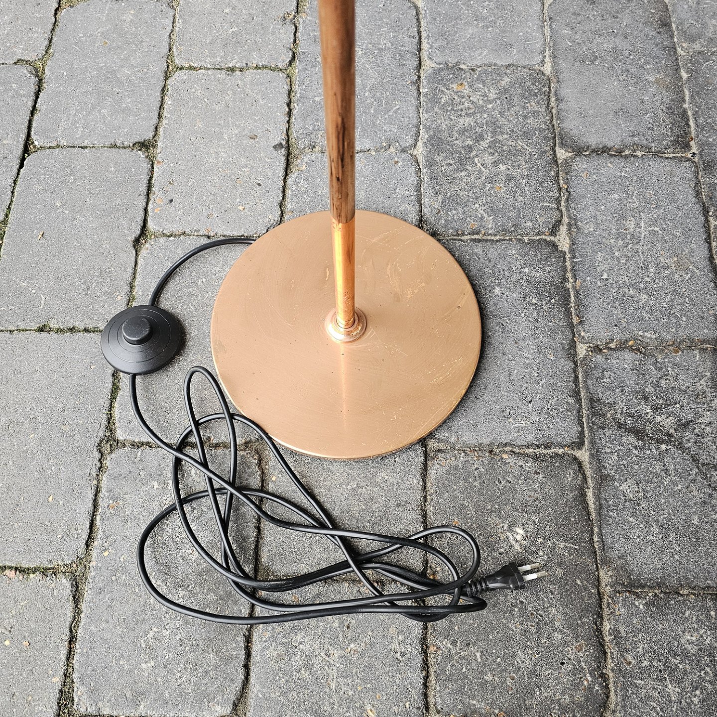 Beskrivelse: Gulvlampe i kobber og glas med overskærm af kobber