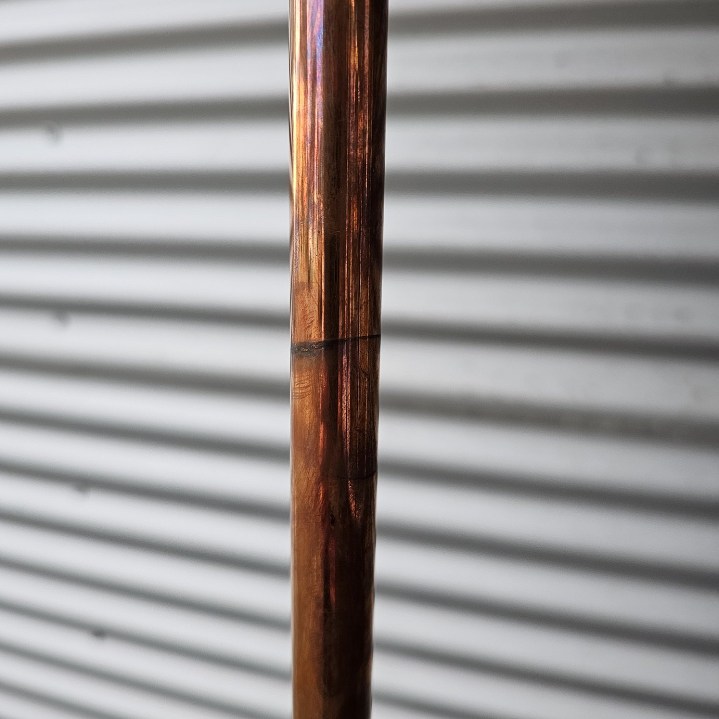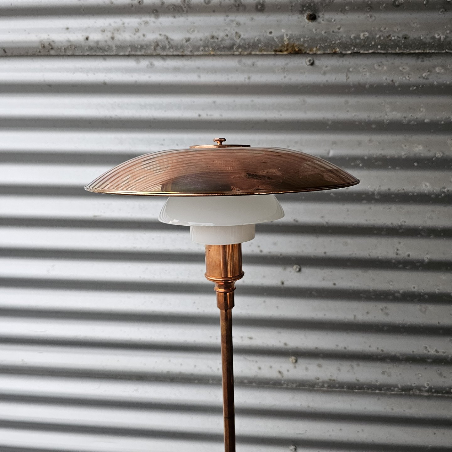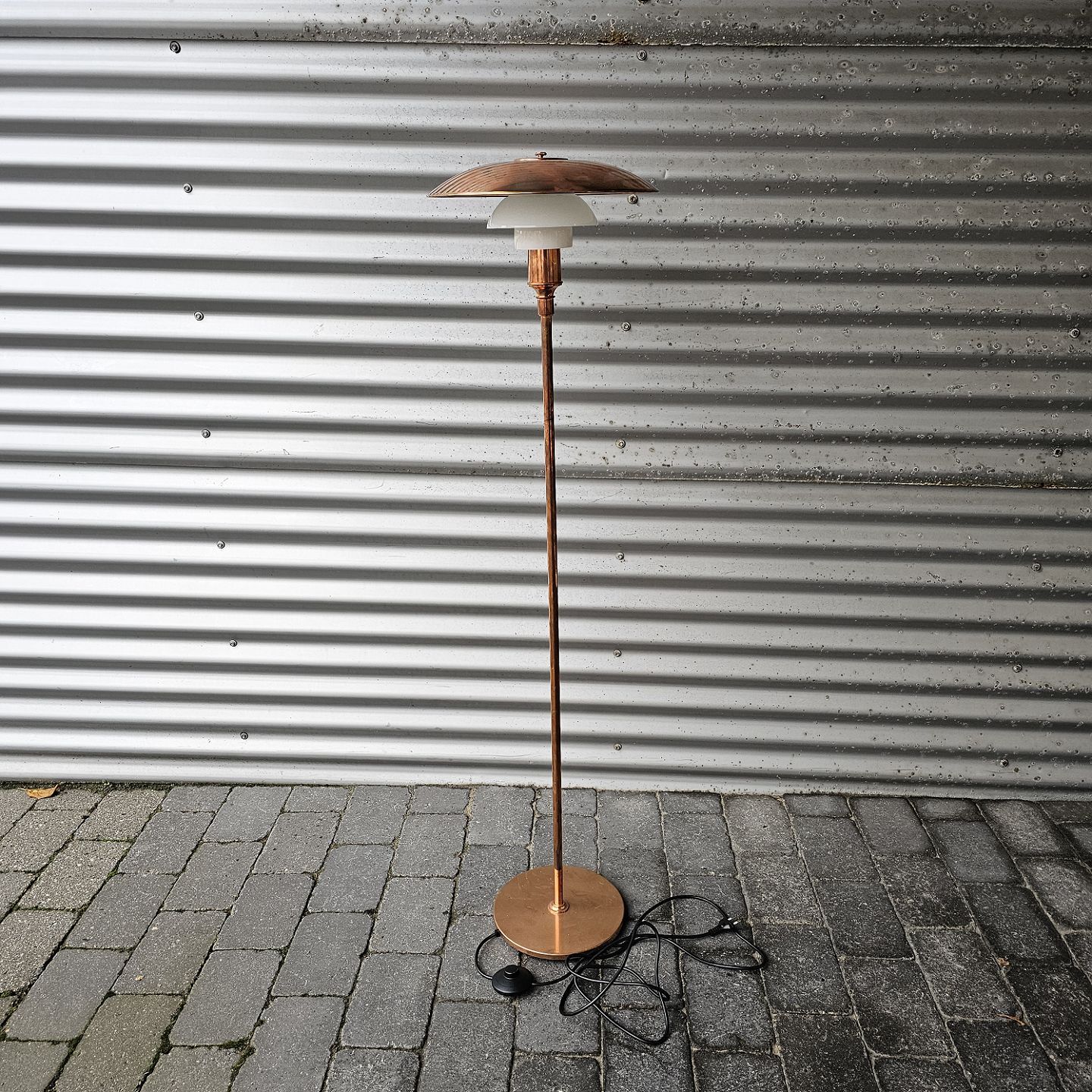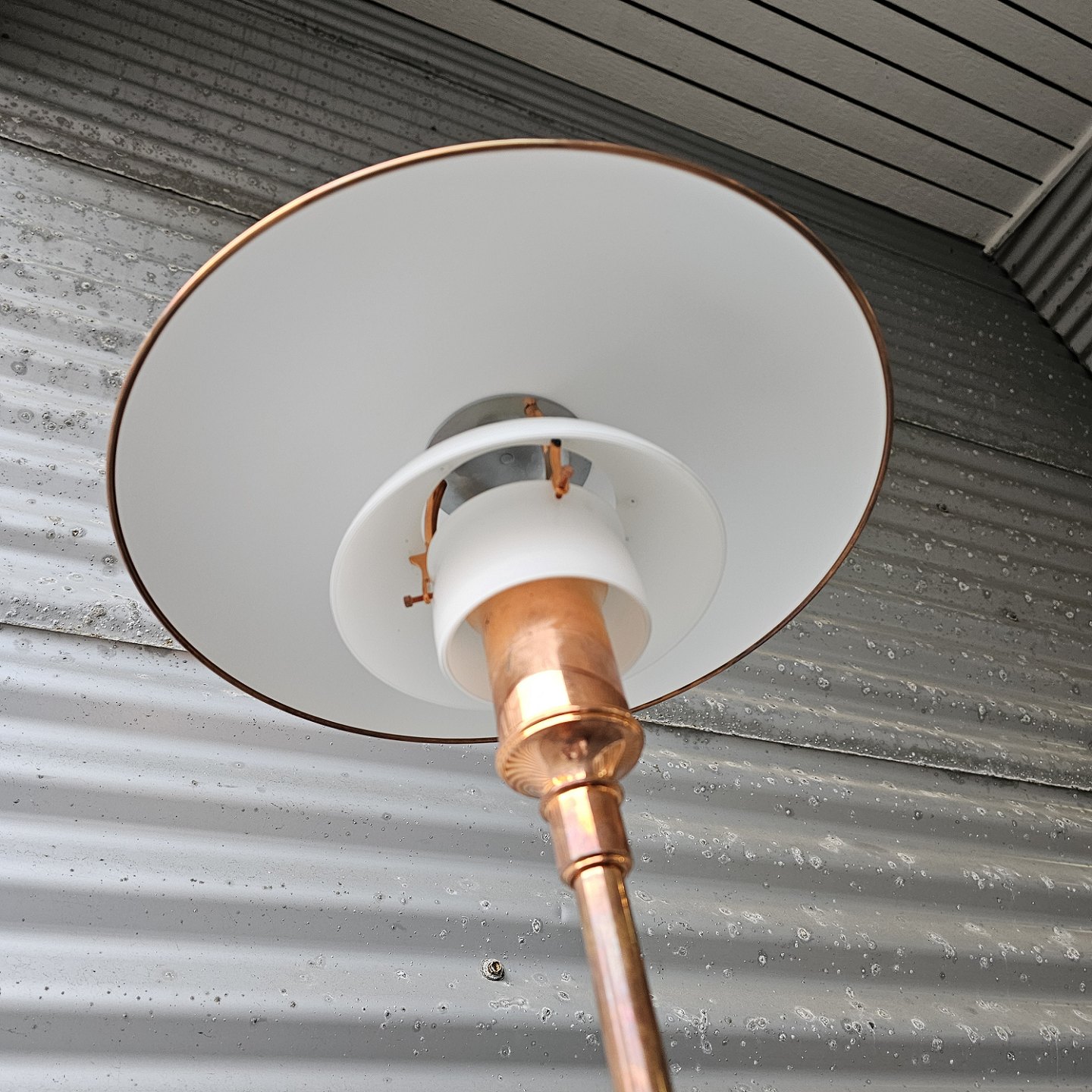 Beskrivelse: Gulvlampe i kobber og glas med overskærm af kobber