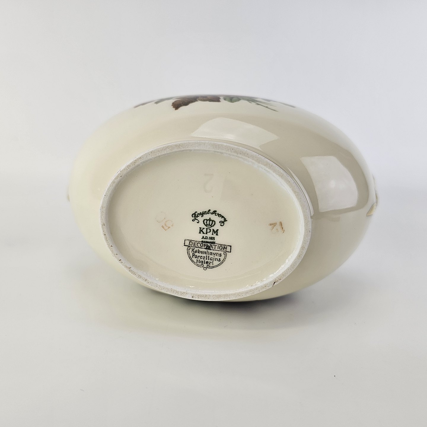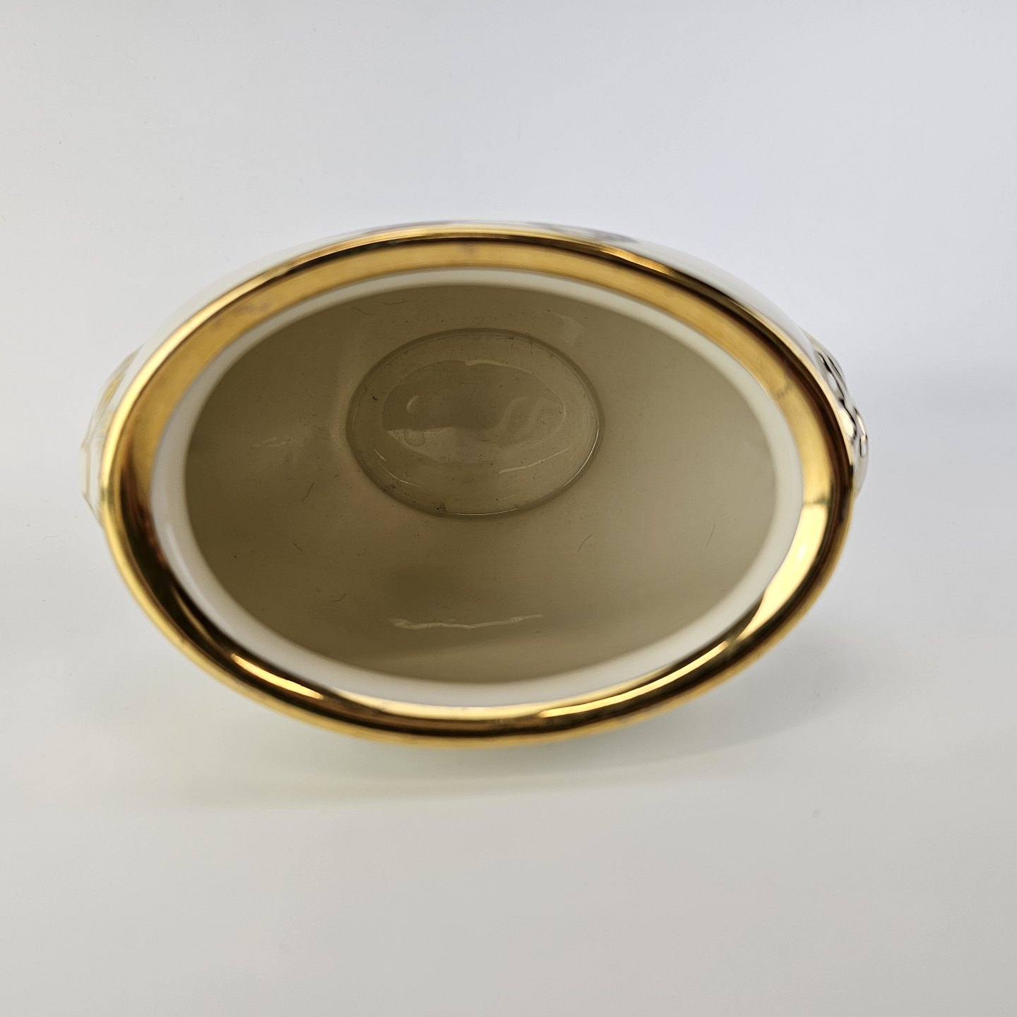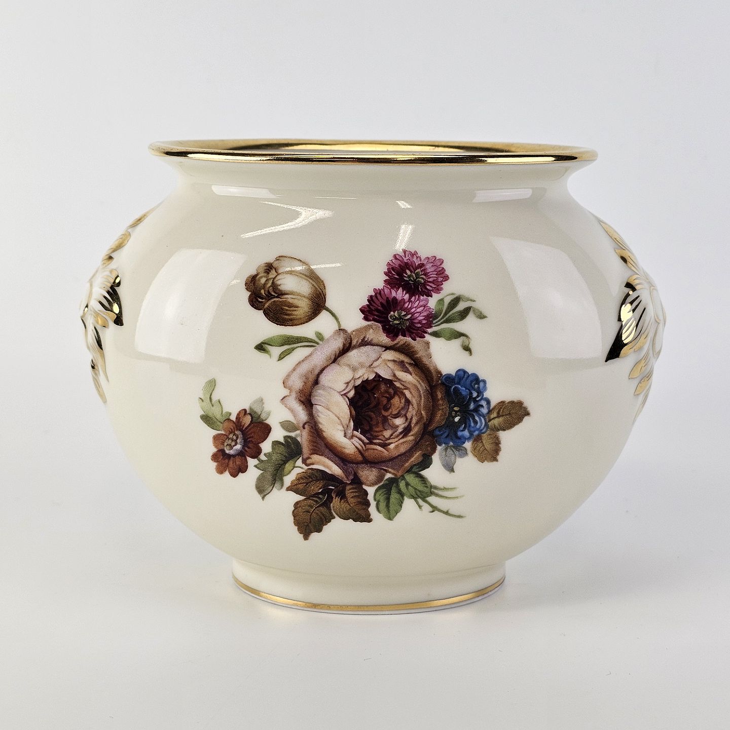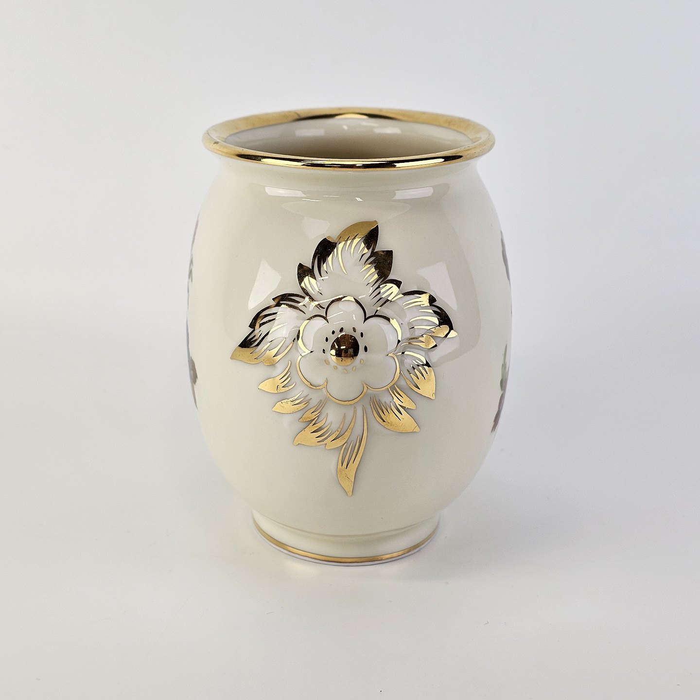 Beskrivelse: Rosenborg oval vase i cremefarvet porcelæn med guldkant og blomstermotiv