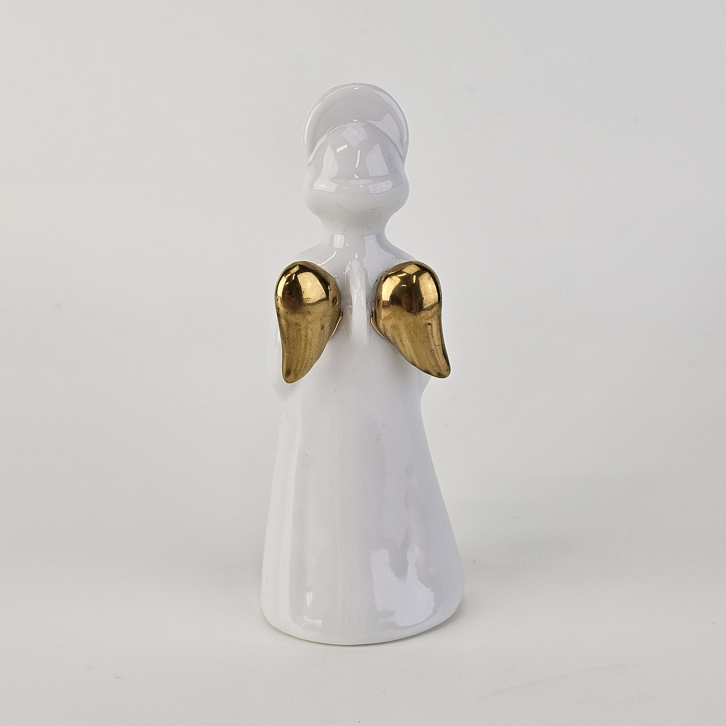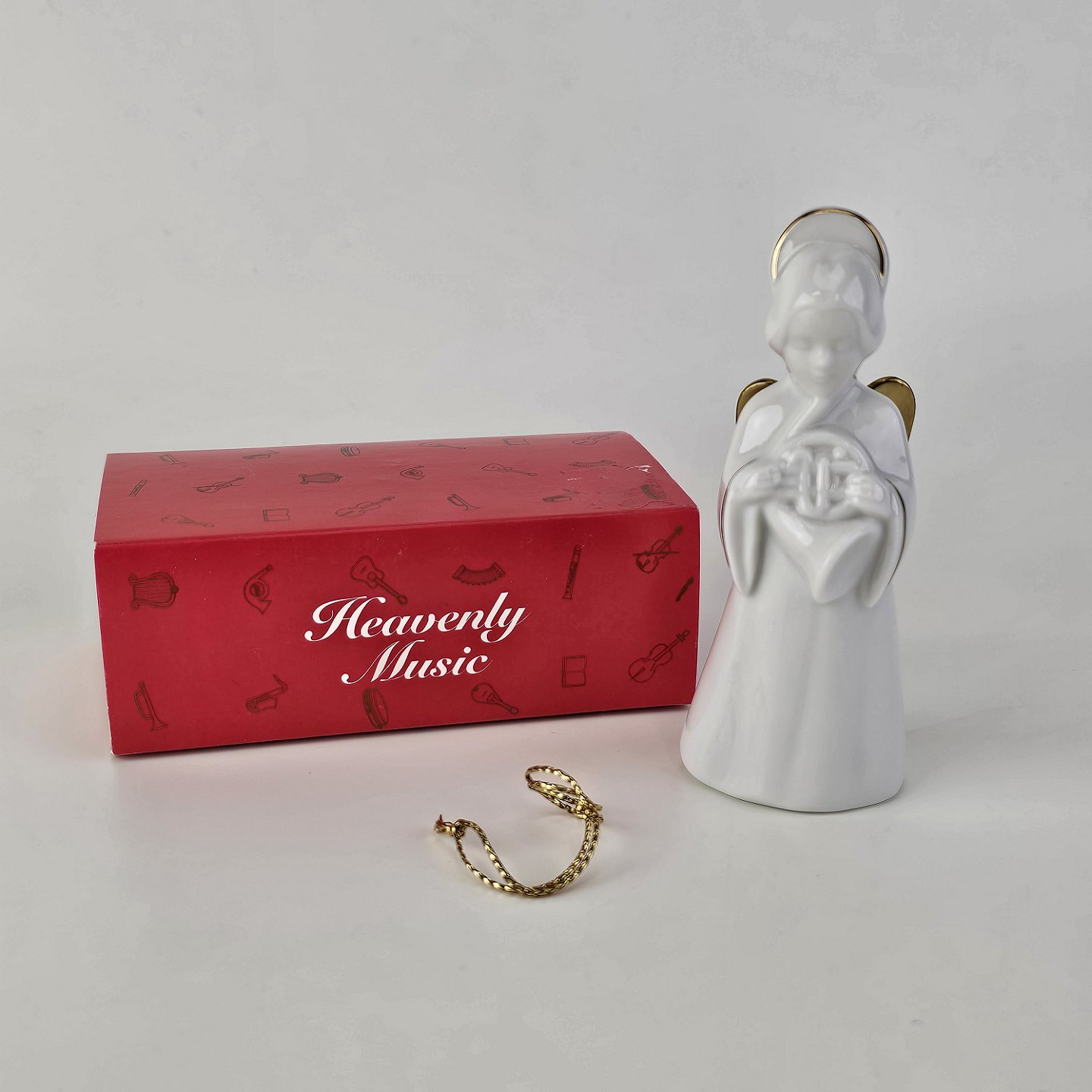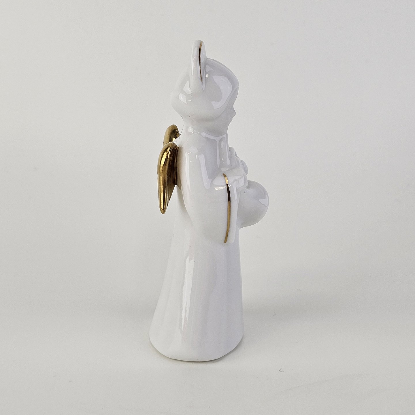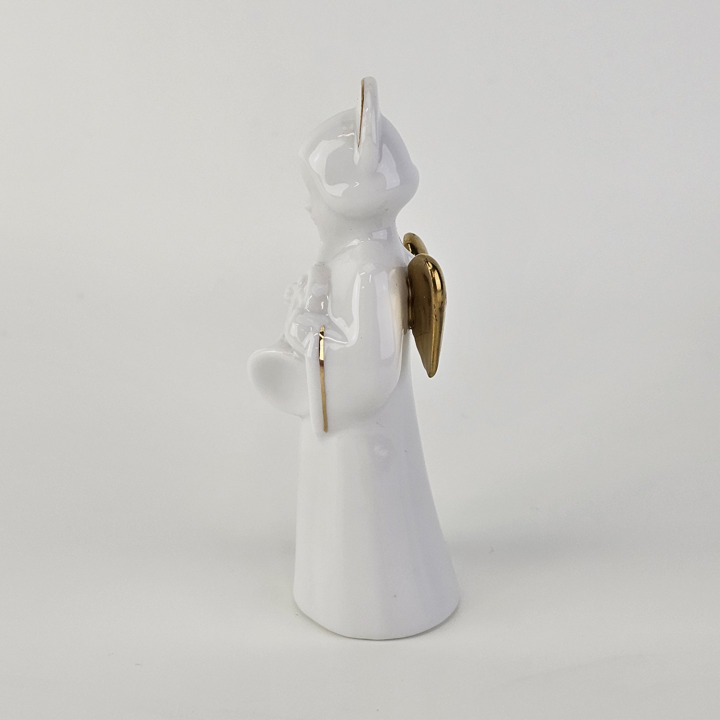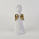 Beskrivelse: Figur med motiv af en engel som spiller på valdhorn. Figuren er i hvidt porcelæn med forgyldte vinger og detaljer i 24 karat guld.