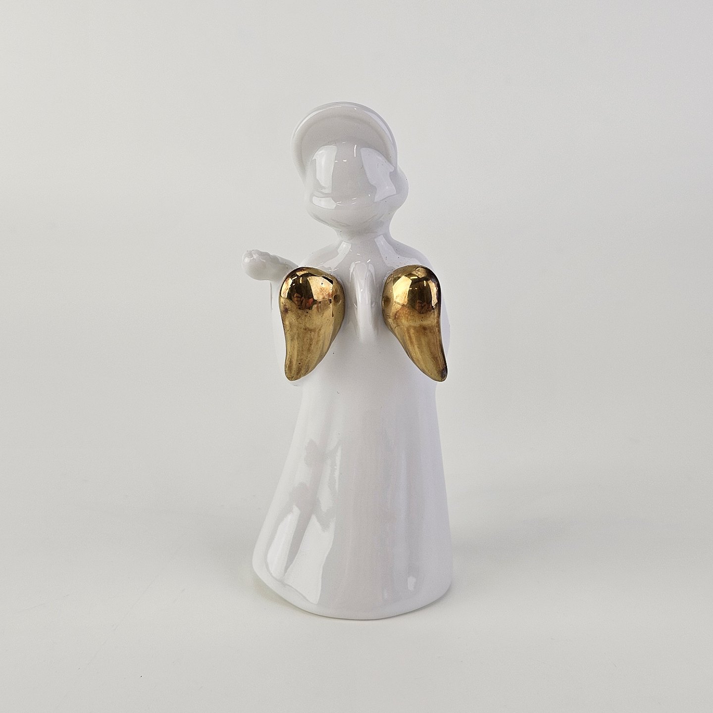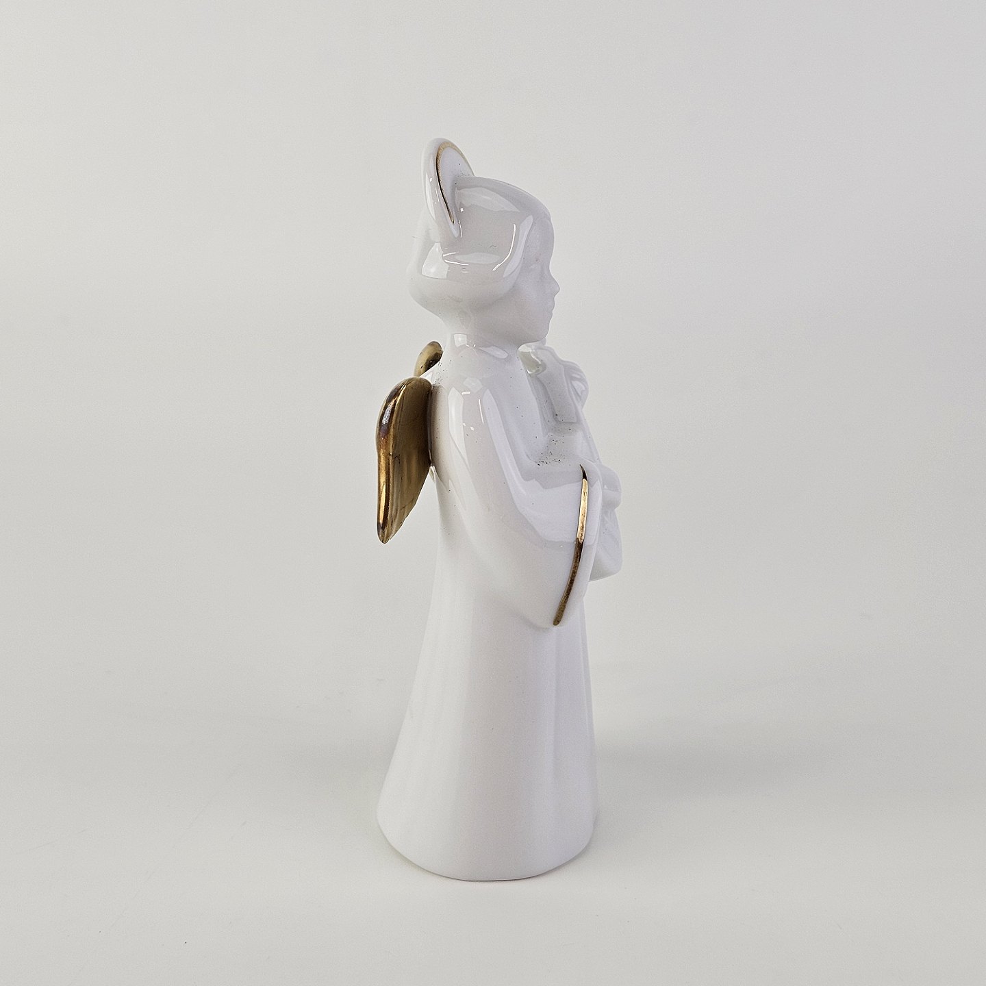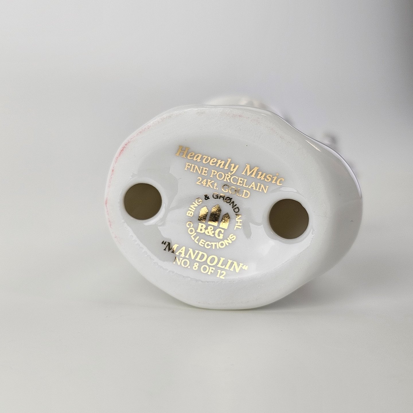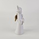 Beskrivelse: Figur med motiv af en engel som spiller på mandolin. Figuren er i hvidt porcelæn med forgyldte vinger og detaljer i 24 karat guld.