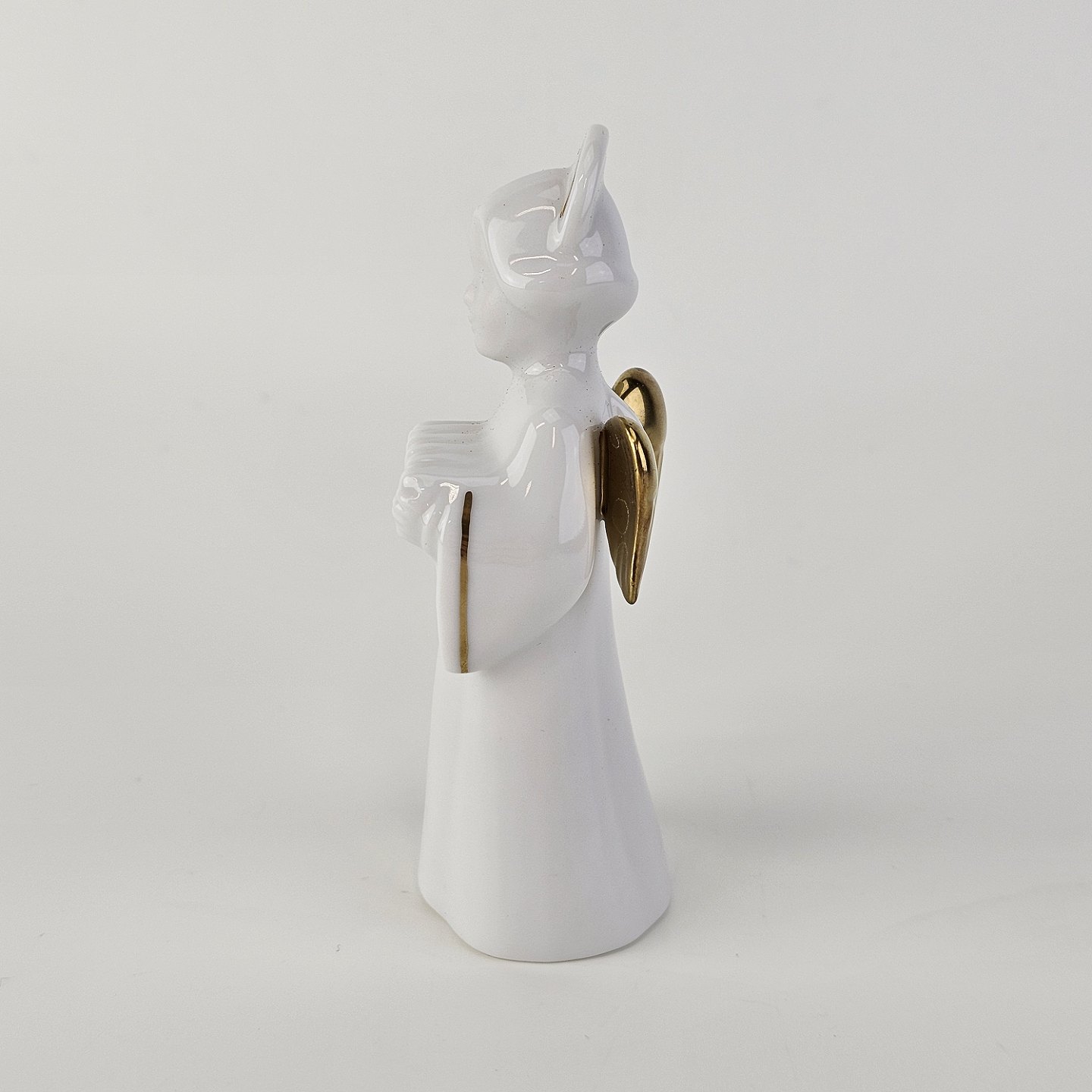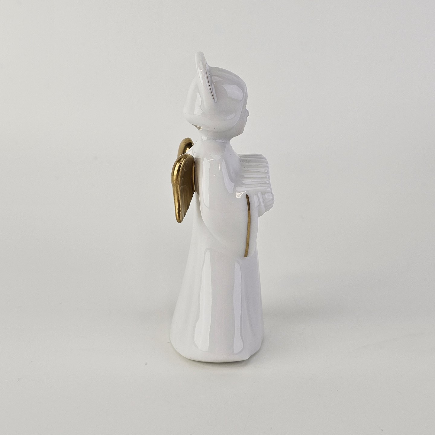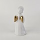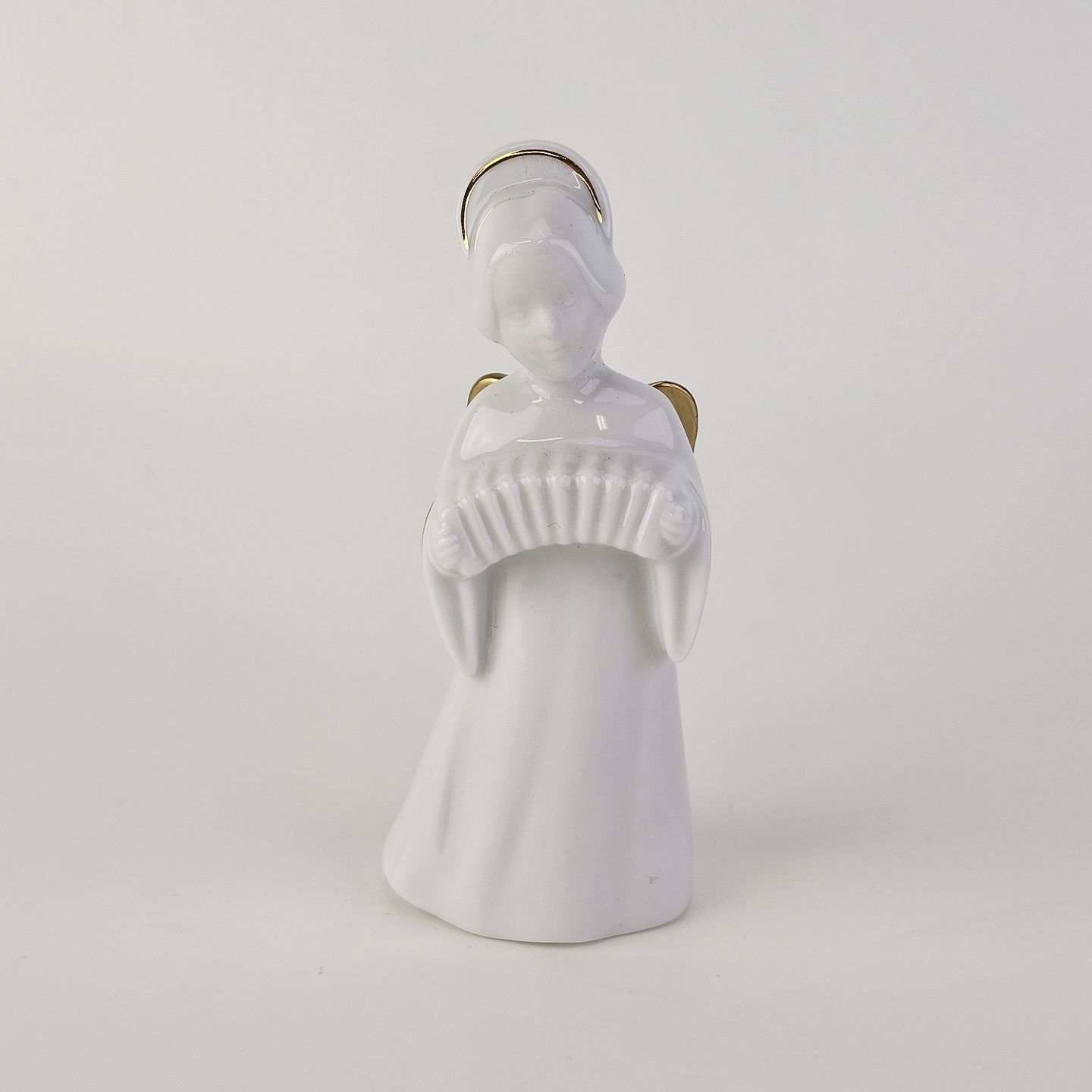 Beskrivelse: Figur med motiv af en engel som spiller på harmonika. Figuren er i hvidt porcelæn med forgyldte vinger og detaljer i 24 karat guld.