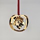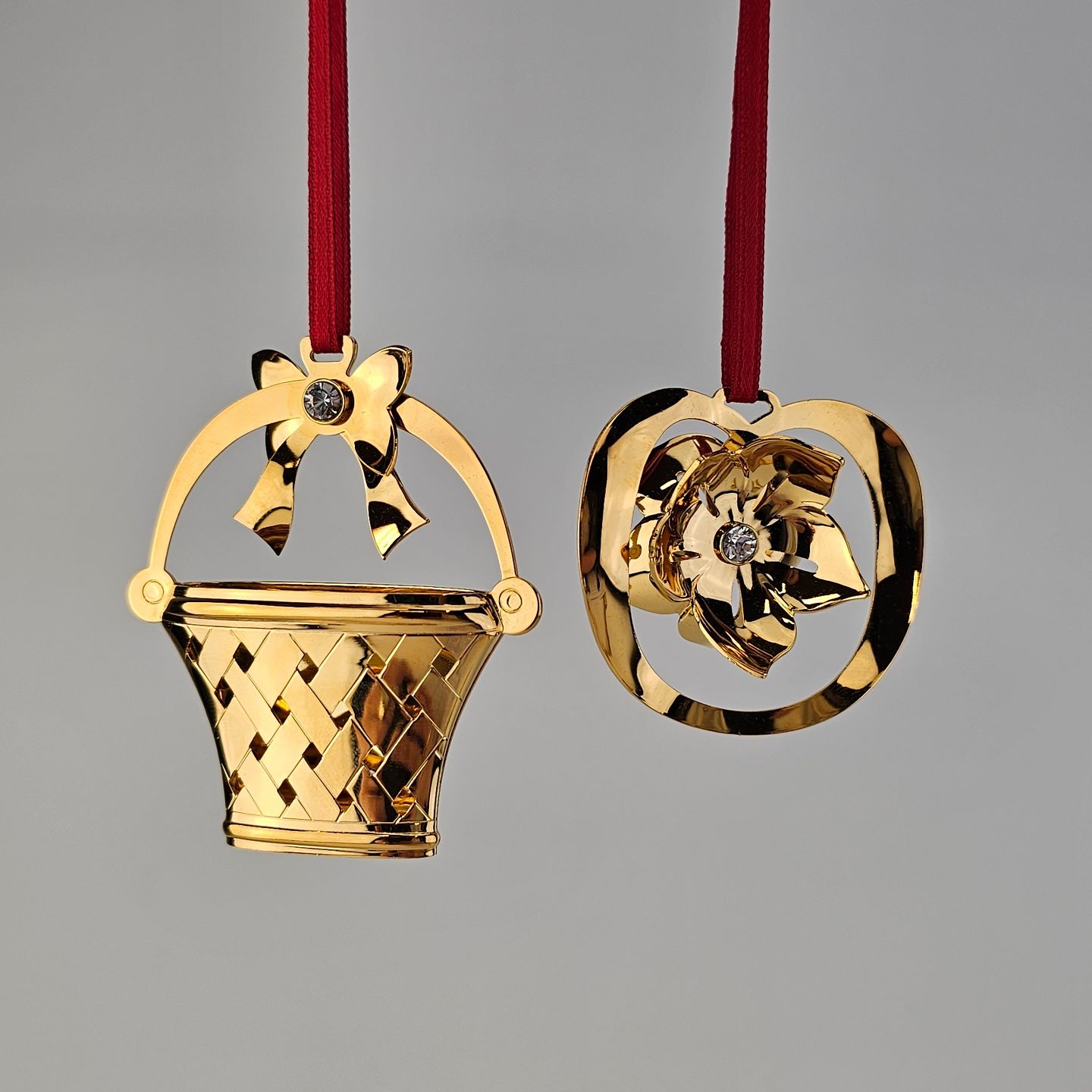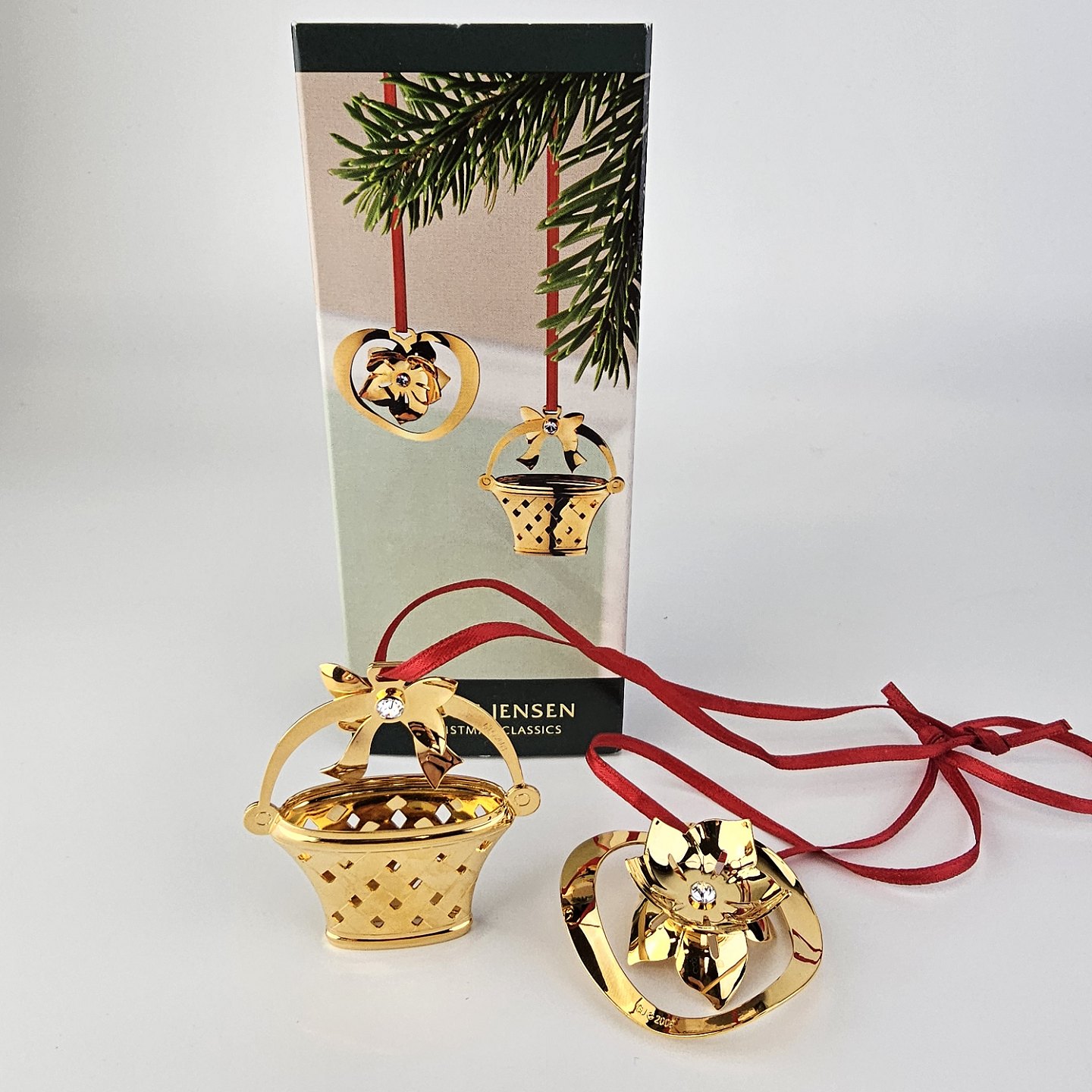 Beskrivelse: To juleornamenter til ophæng med form af en kurv og en julerose i messing forgyldt med 24 karat guld
