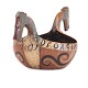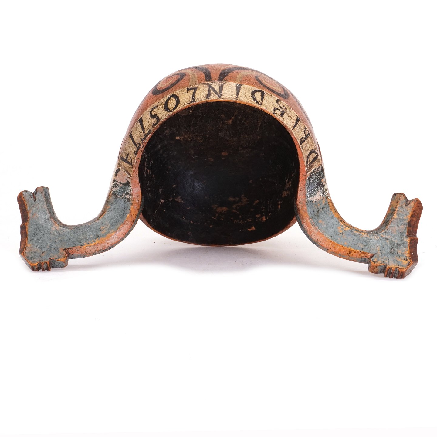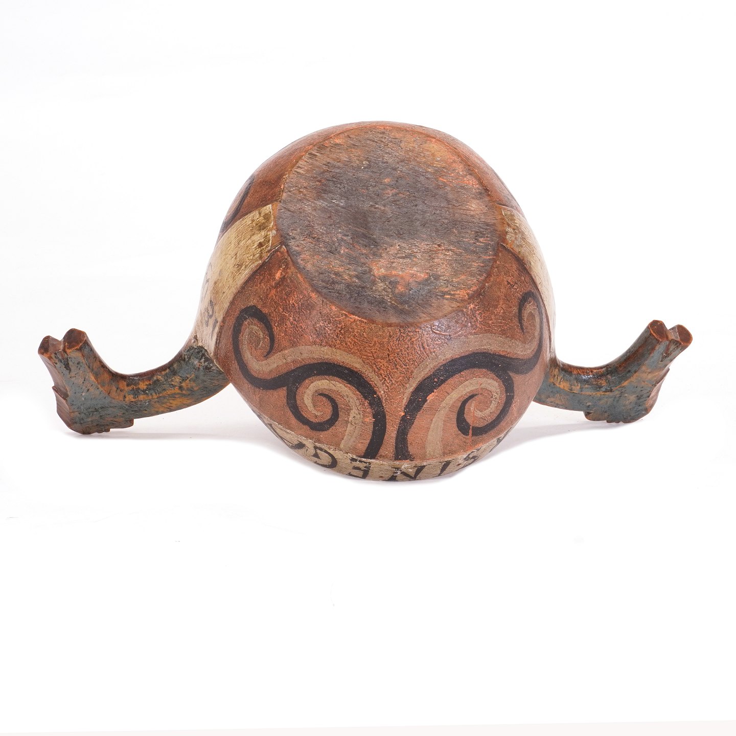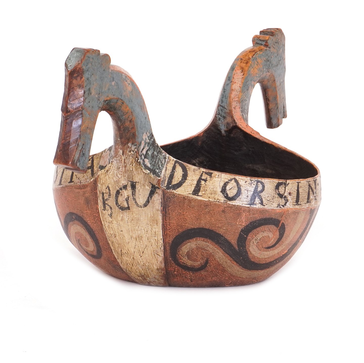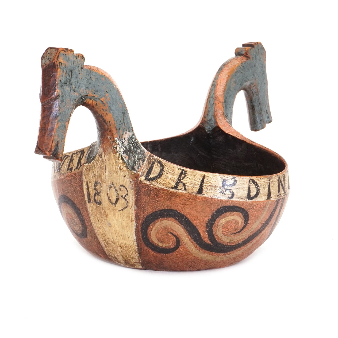 Norsk originaldekoreret ølbolle udskåret i træ med hanke i form af hestehoveder. Dateret 1803. H: 21cm. L: 41cm